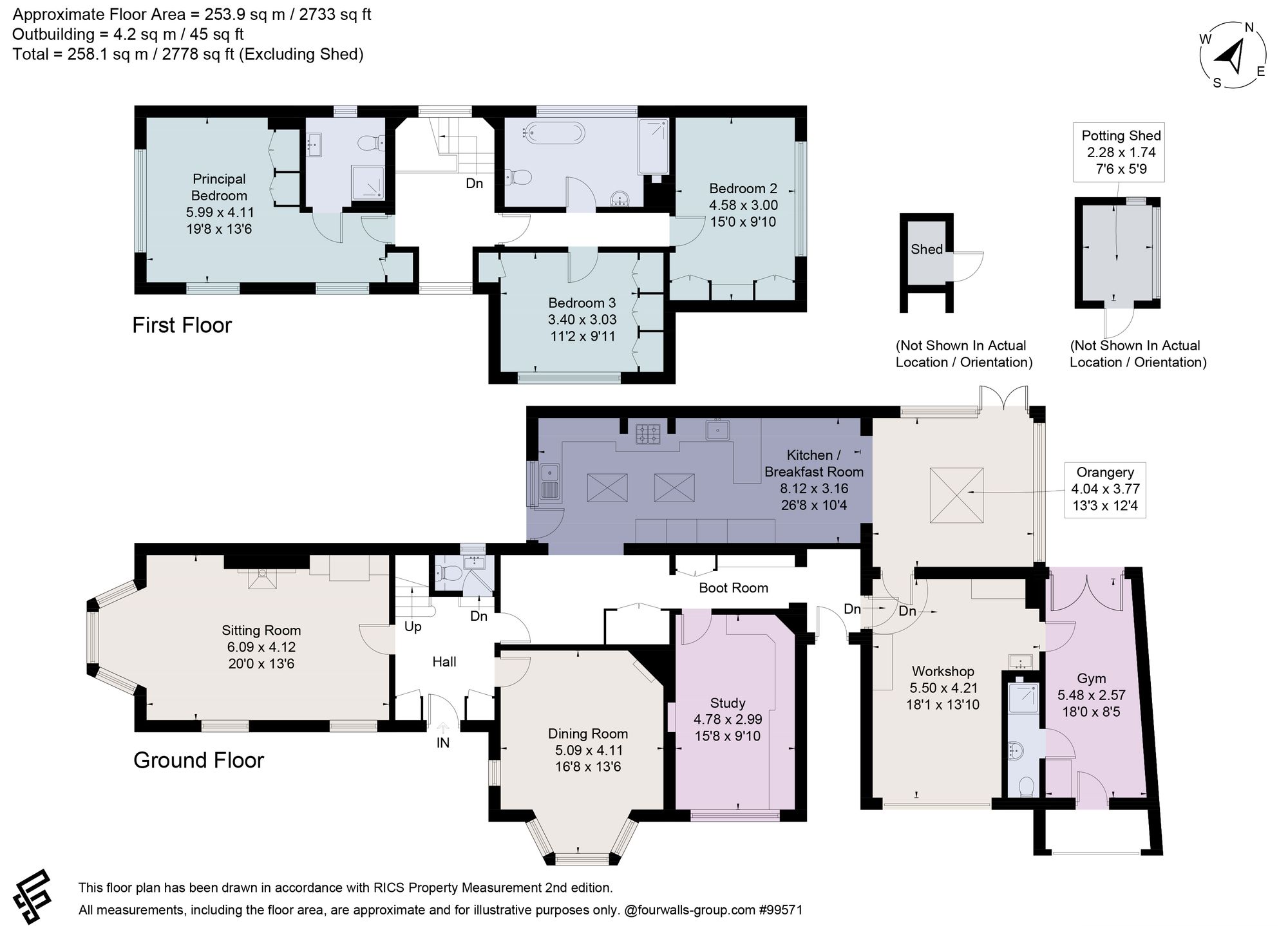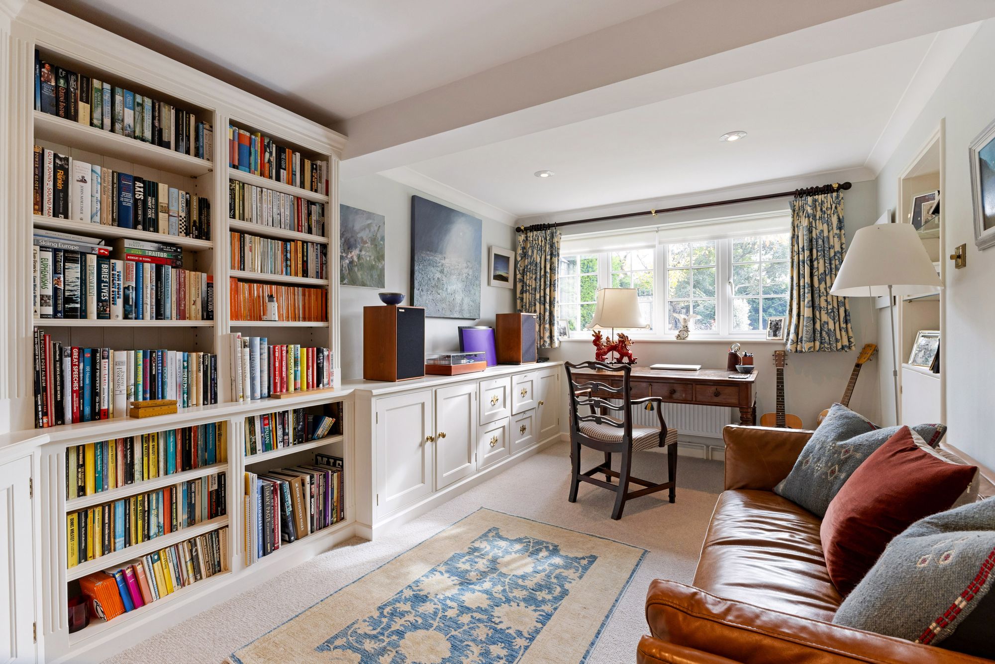 Additional ground-floor accommodation includes a dedicated study with bespoke built-in bookcases and cabinetry, ideal for home working. A utility and workshop area leads through to a thoughtfully converted section of the garage, now arranged as a home gym with the benefit of an adjoining shower room.