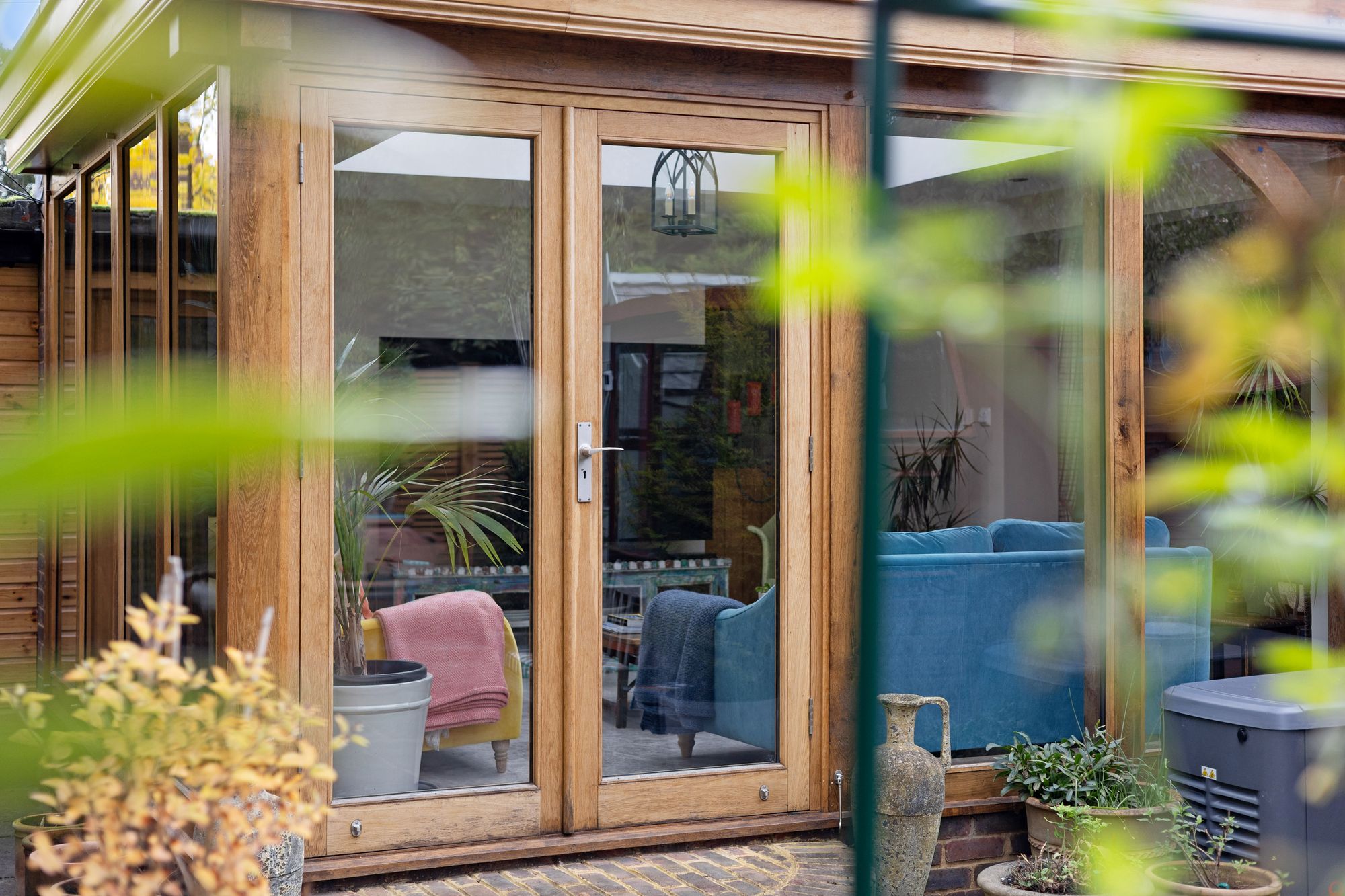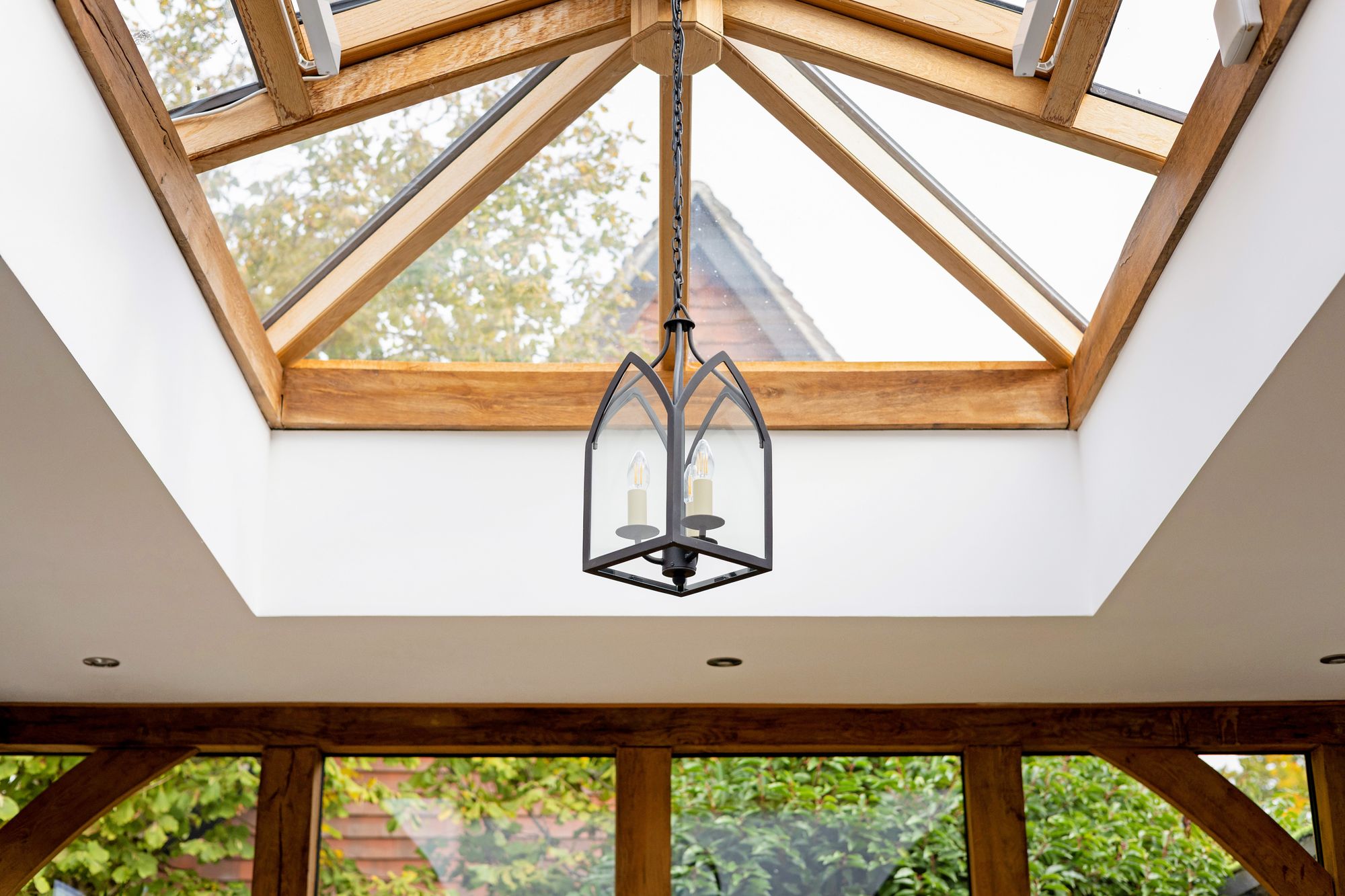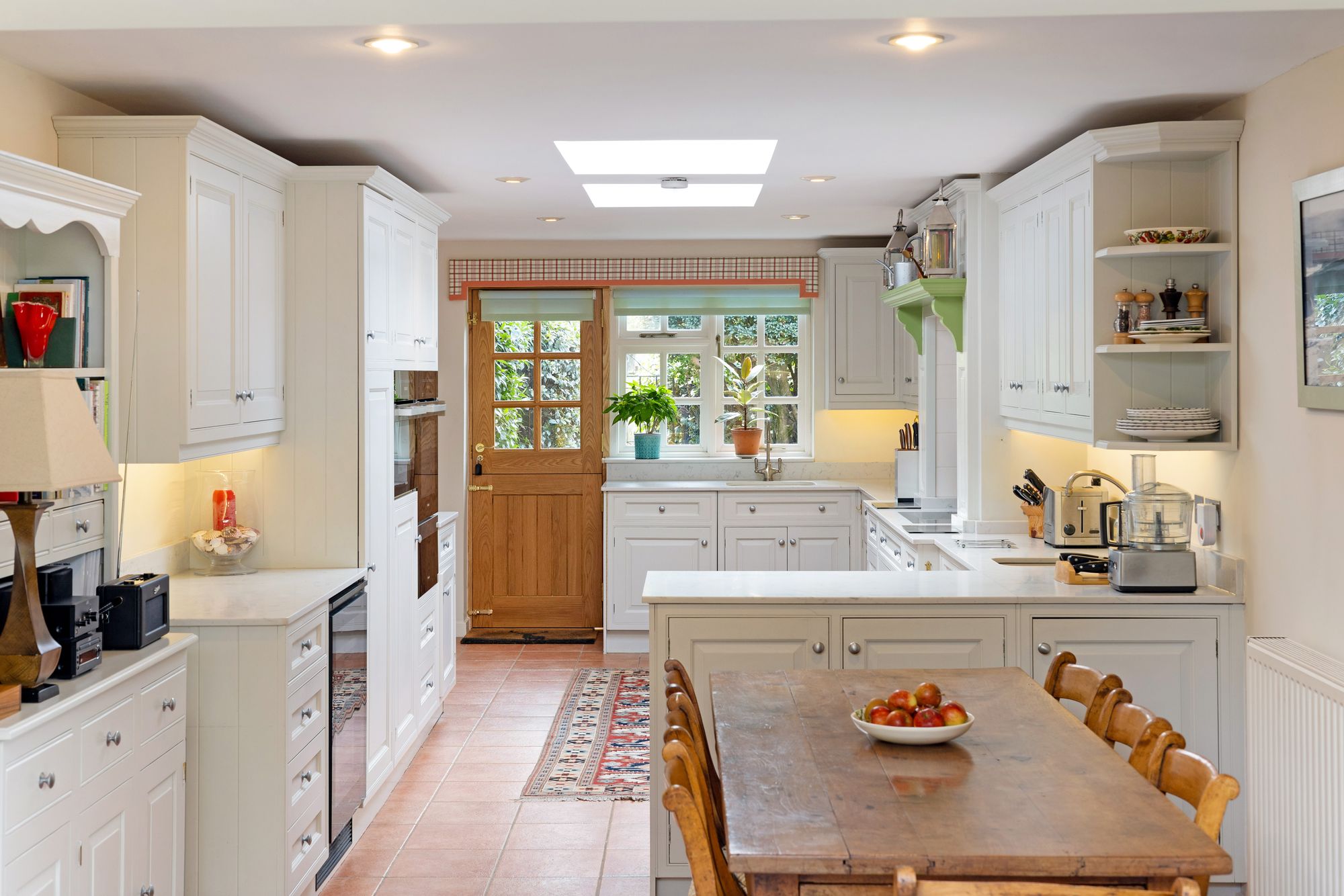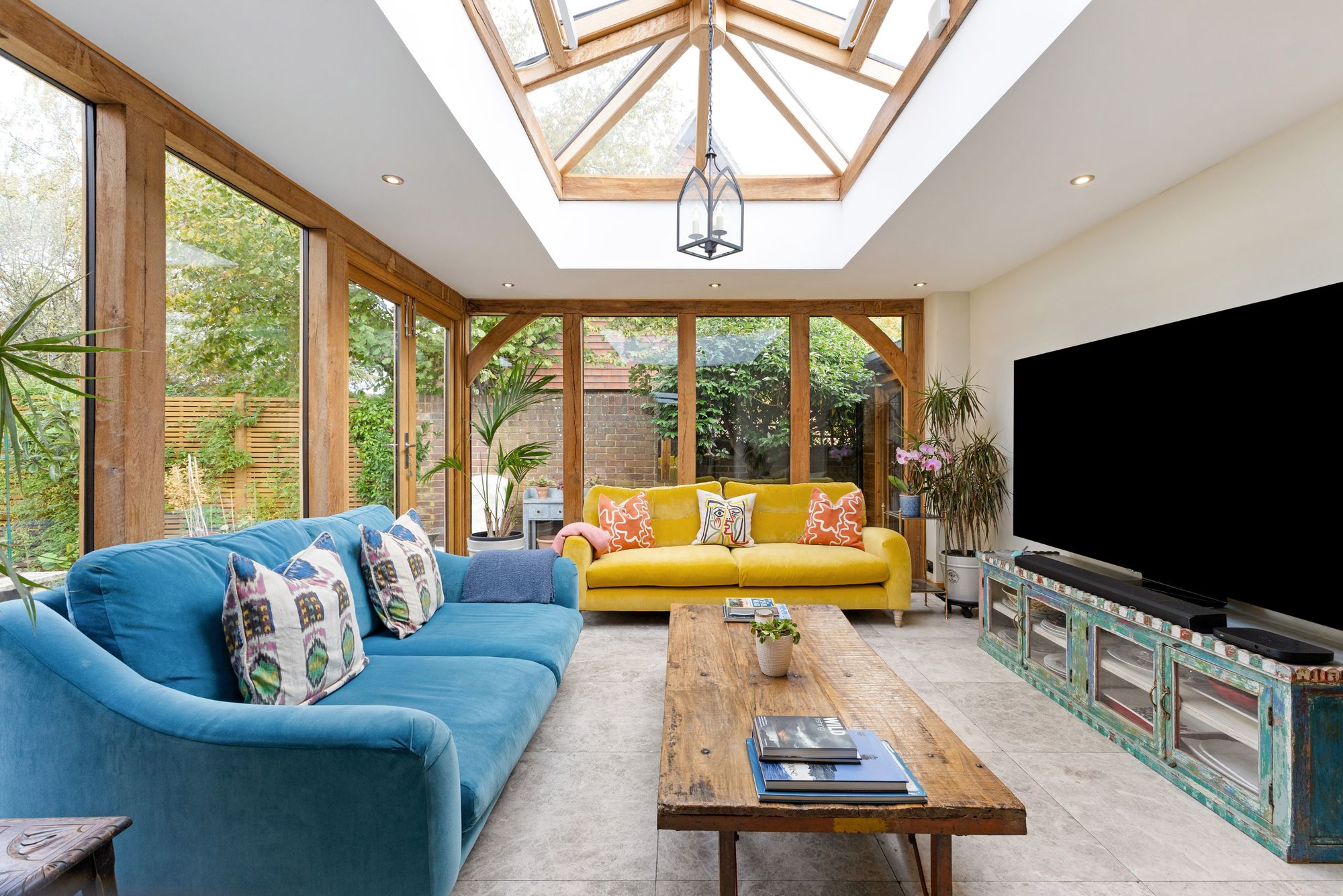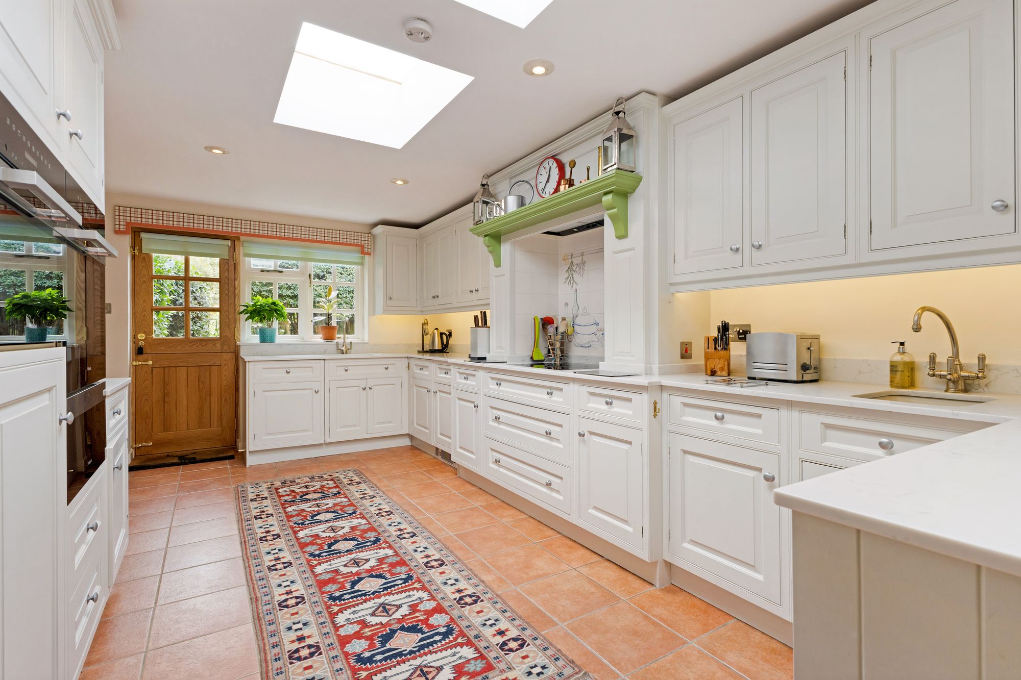 The traditional kitchen is well appointed with an extensive range of fitted wall and base units, providing excellent storage. There is ample space for a dining table, making it well suited to everyday family living. From here, the kitchen flows seamlessly into a striking orangery, flooded with natural light and opening directly onto the rear terrace—perfect for relaxation or hosting guests.