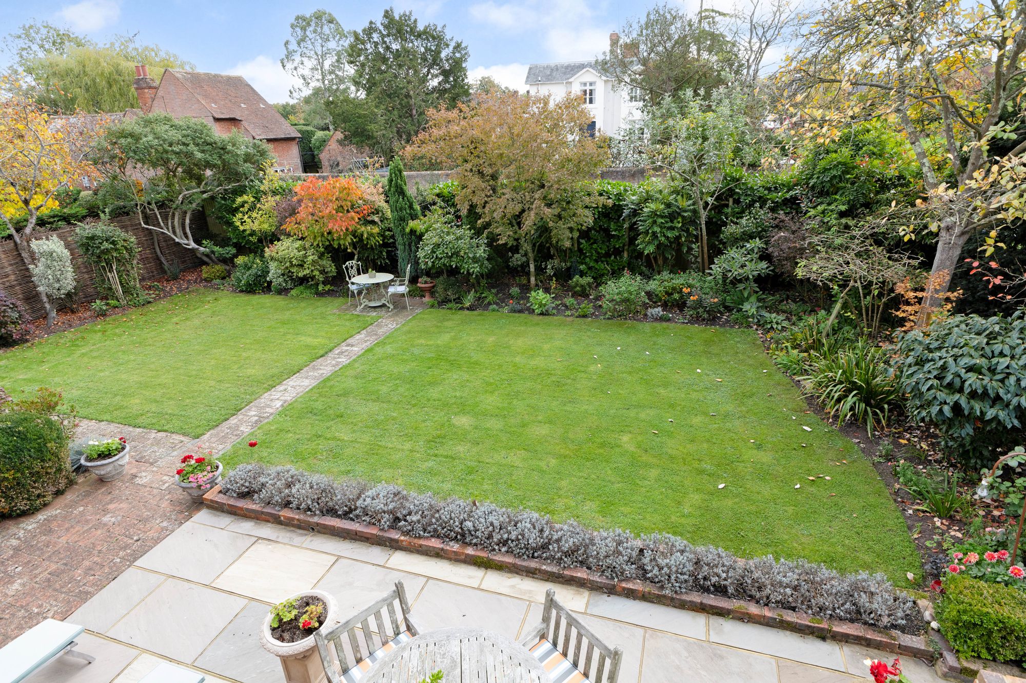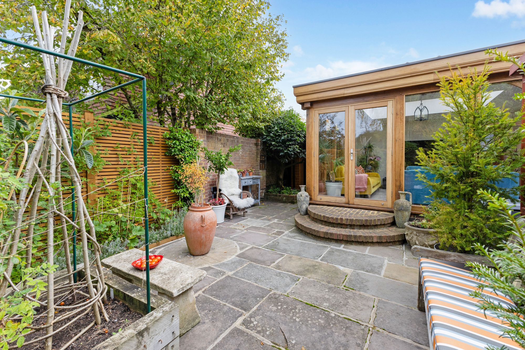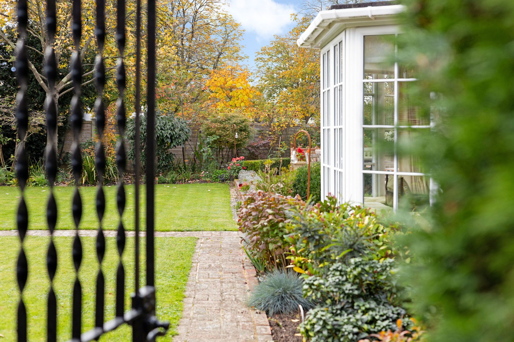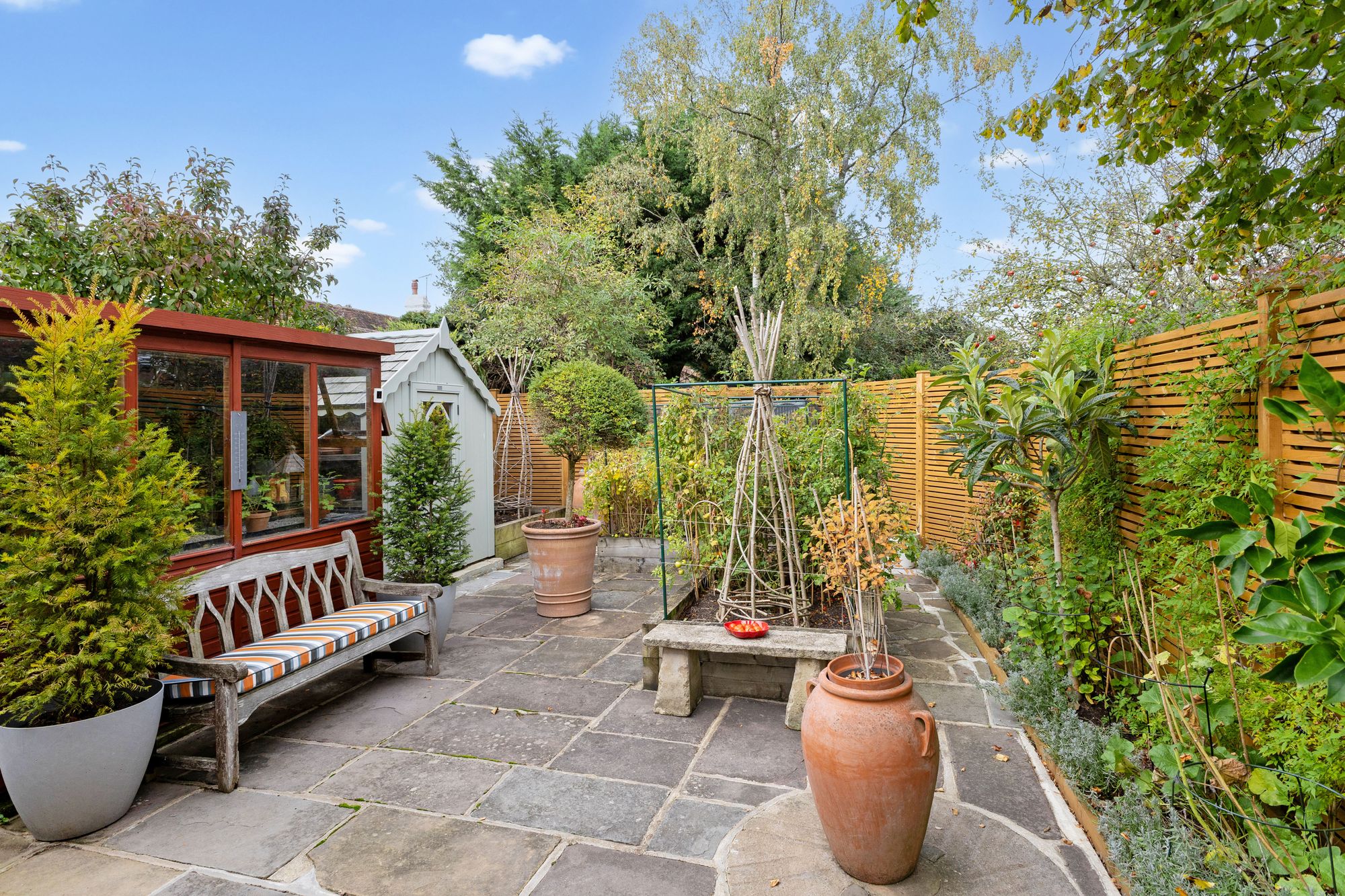 Outside, the gardens offer a high degree of privacy and are predominantly laid to lawn, enclosed by mature shrubs and trees. To the rear is a charming courtyard garden laid to flagstones, with three raised beds, a potting shed and an additional shed ideal for garden furniture and a lean to greenhouse by Woodpecker Joinery and terraced seating areas ideal for alfresco dining. The property further benefits from a private driveway providing parking for multiple vehicles, with gated access into the garden.