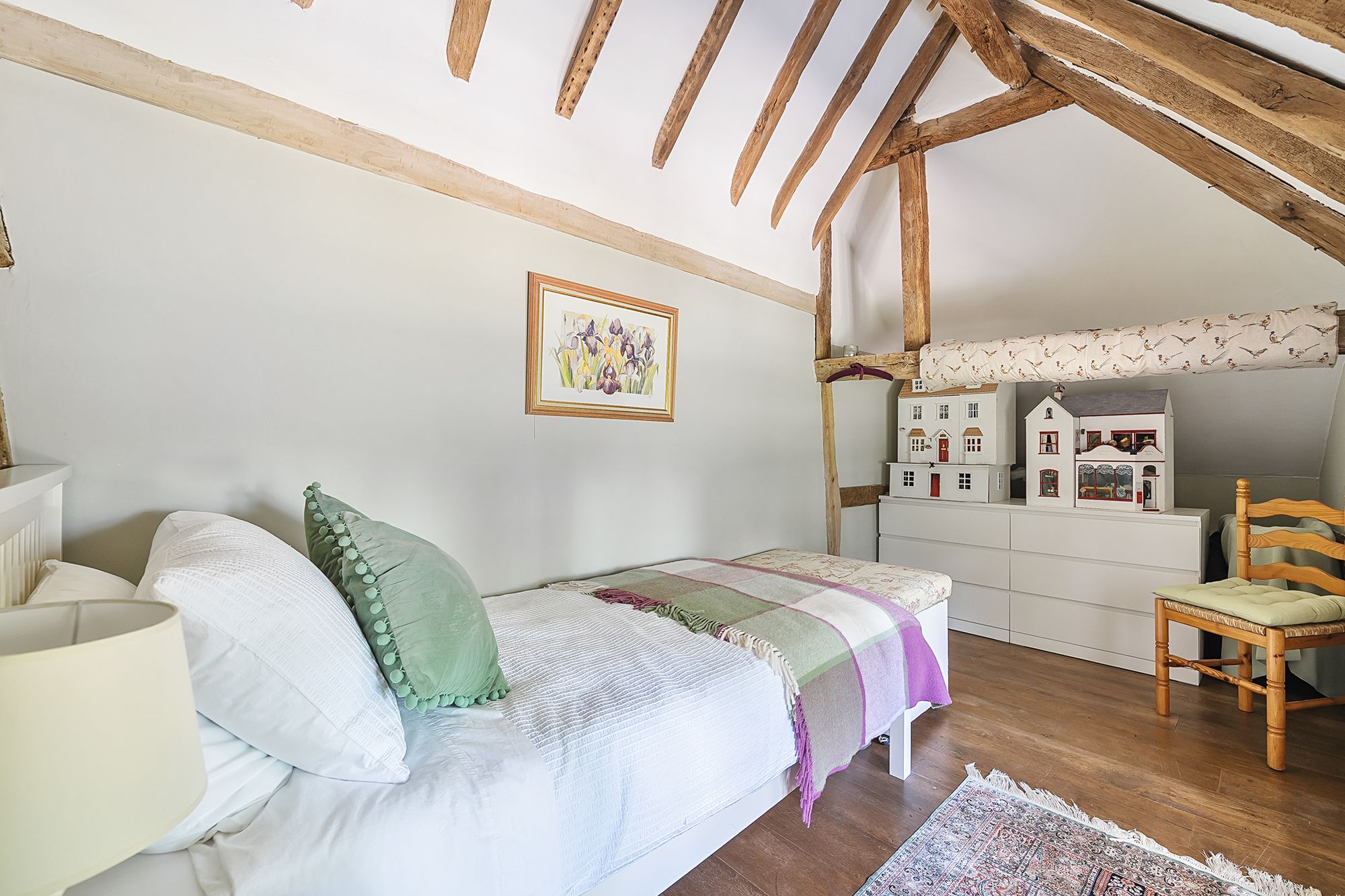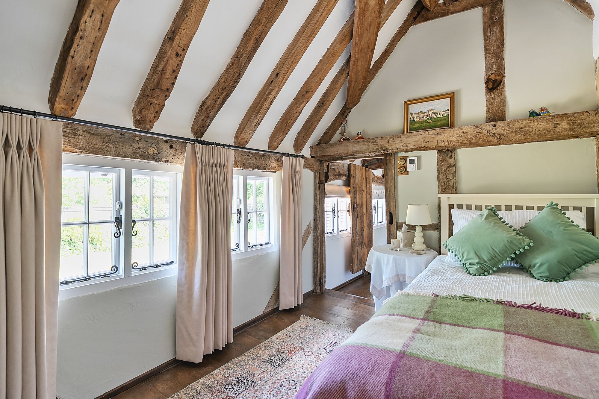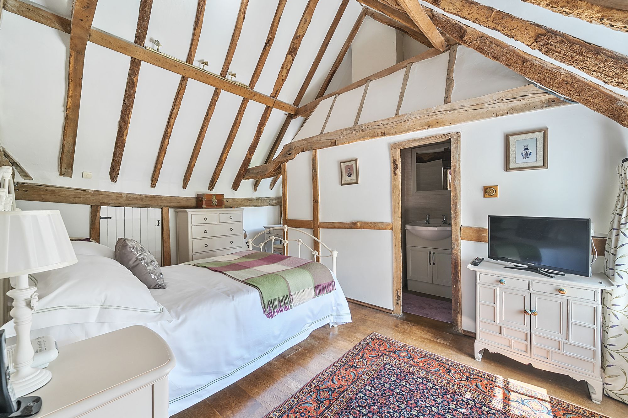 On the upper level, the double aspect vaulted main bedroom beckons with its charm and offers an en-suite shower room for added privacy and convenience. Two additional double bedrooms provide comfort and style, and a well-appointed family bathroom.