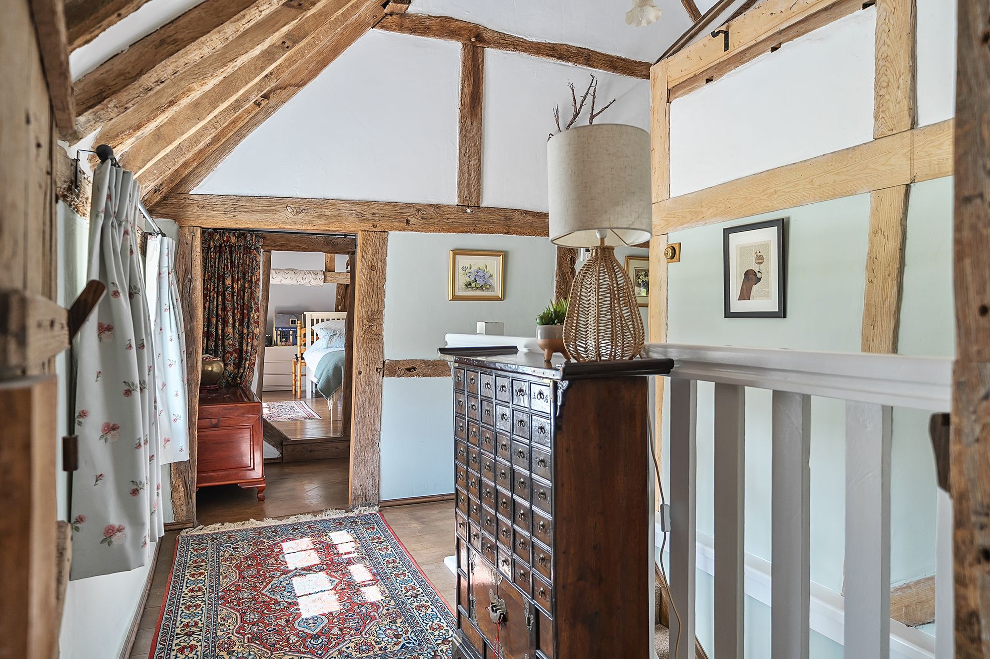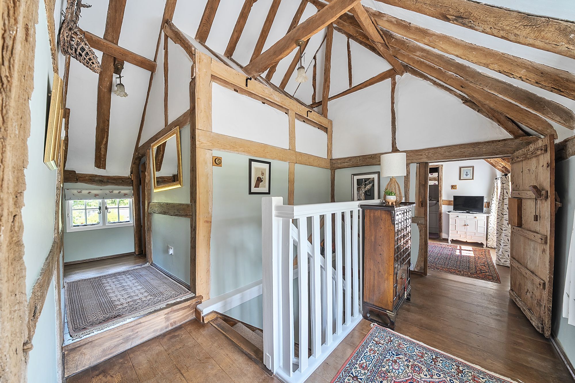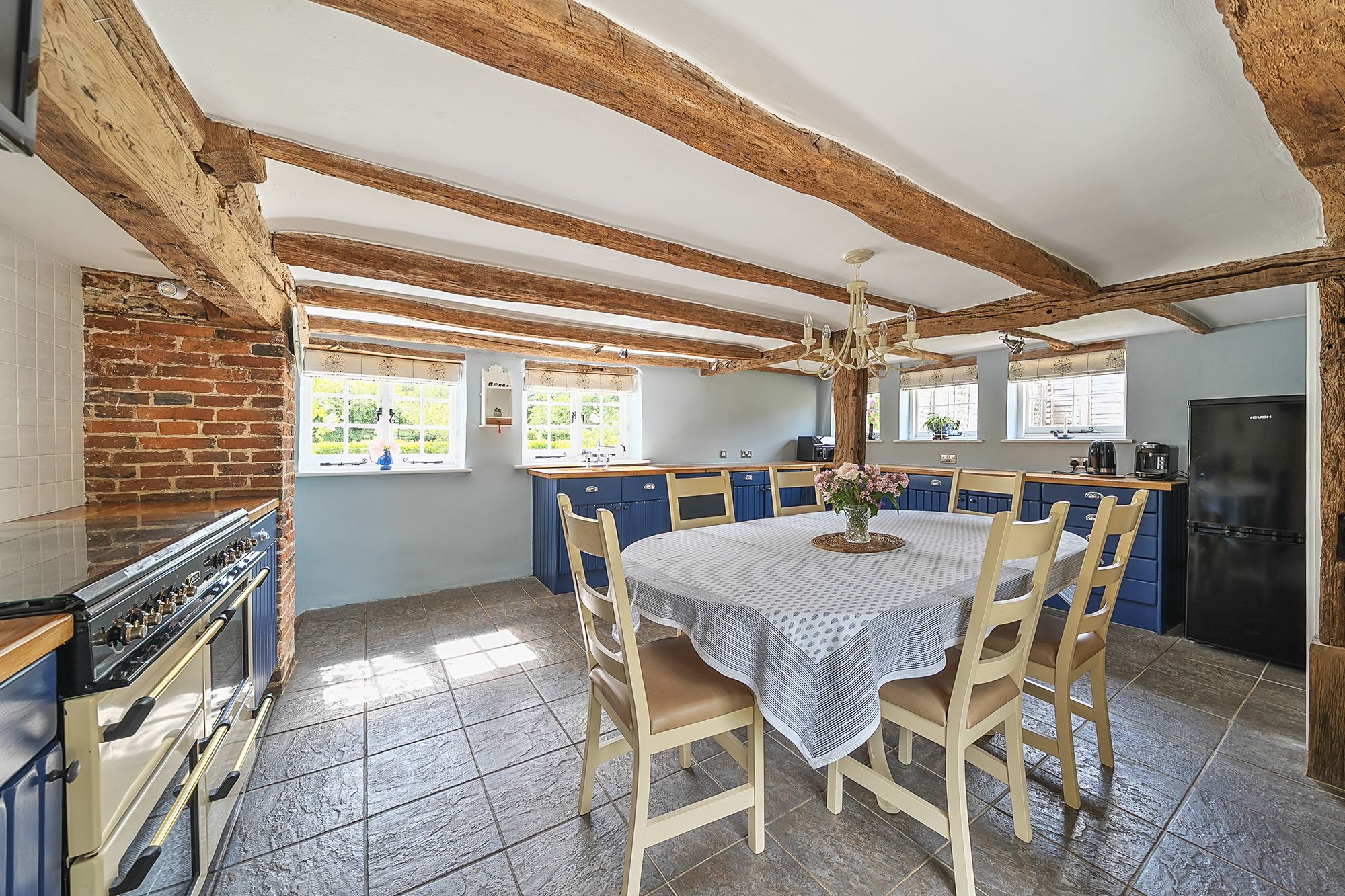 The interior seamlessly combines timeless elegance with contemporary amenities, as evidenced by the cosy sitting room showcasing a lovely feature inglenook fireplace with inset wood burner, and inviting French doors that lead out to the garden. A study provides a quiet retreat for work or relaxation, while the bespoke hand-made kitchen and dining room are highlighted by a range cooker and ample space for entertaining. A practical touch is the good-sized utility room offering space for essential appliances. Underfloor heating on both the ground and first floors ensures comfort throughout the year, while a convenient ground floor cloakroom adds to the functionality of the space.