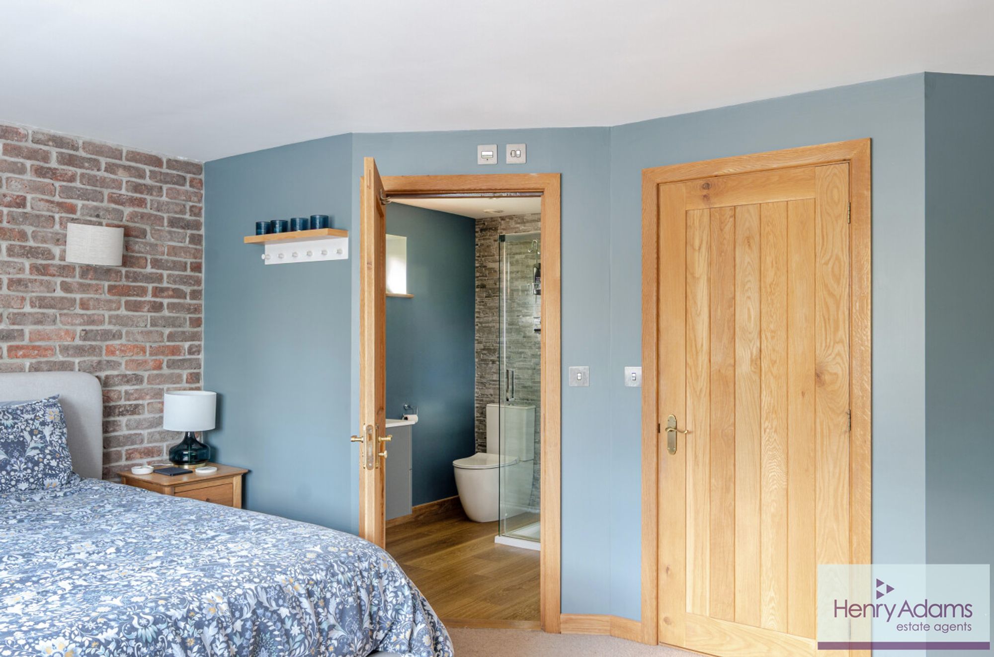 Upstairs, the property features five well-proportioned bedrooms, each benefiting from built-in storage and attractive outlooks across the garden or the wider village setting. The principal bedroom includes a large walk-in wardrobe with fitted storage and a beautifully finished en-suite. A guest suite also benefits from its own en-suite shower room, while the remaining bedrooms are served by a high-quality family bathroom. All bath and shower rooms mirror the same level of finish, with bespoke cabinetry and coordinated materials that complement the home’s overall design.