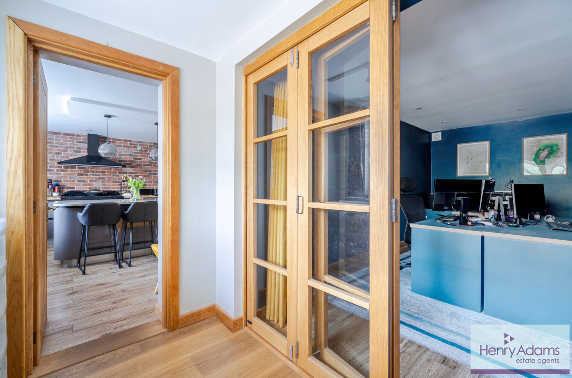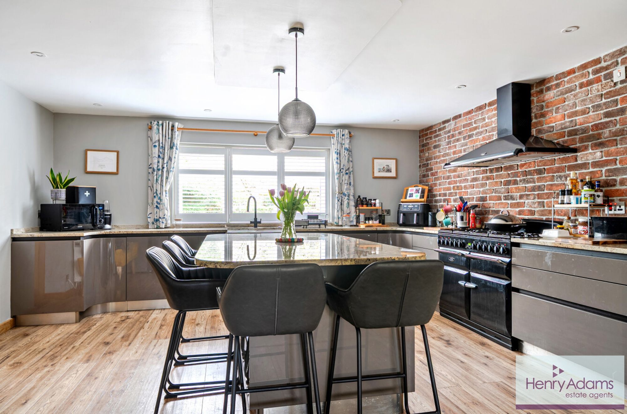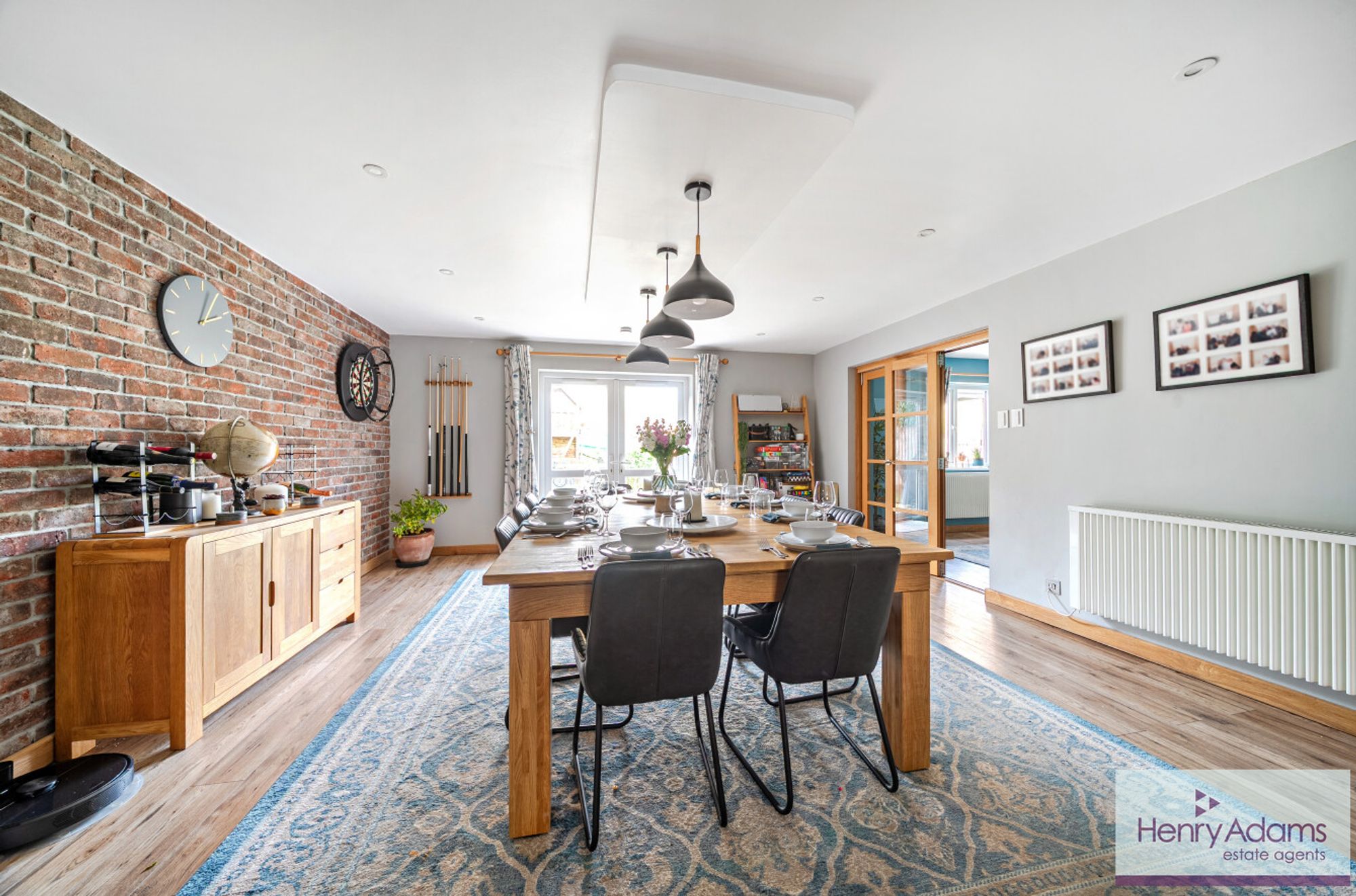 At the heart of the property is a superb bespoke kitchen and dining room. Fitted with extensive cabinetry, granite work surfaces, a butler sink, and a modern AGA cooker, the space is designed for both everyday life and entertaining. There is generous room for a dining table and relaxed seating, and double doors open directly to the garden, creating a strong connection with the outdoors. A substantial central island provides a practical hub for cooking, gathering, or working informally, and an exposed brick feature wall adds understated character.
