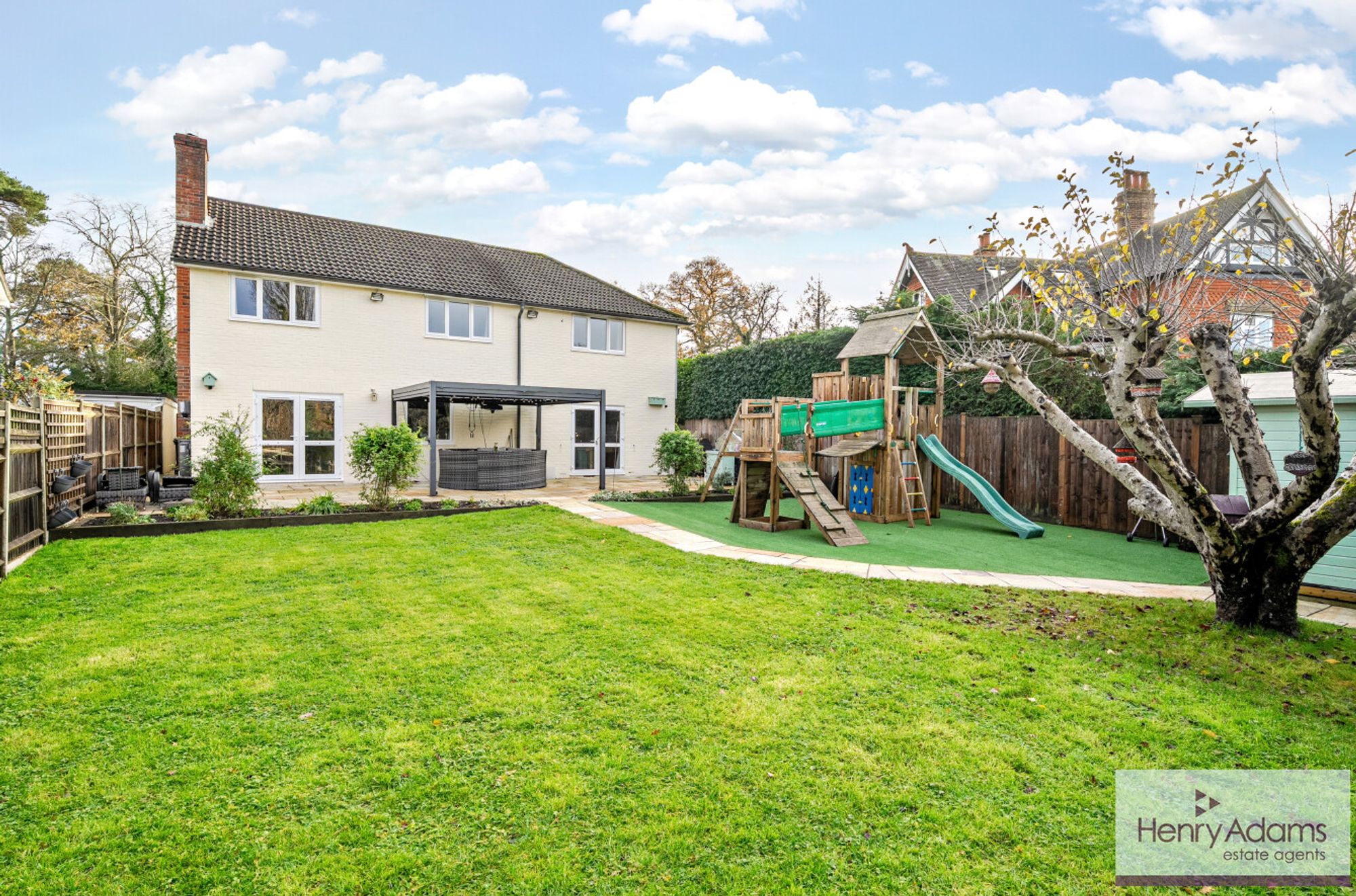 The rear garden has been landscaped to provide a versatile and low-maintenance outdoor space. A paved terrace beneath a substantial pergola offers an excellent setting for outdoor dining or relaxation. The garden features a blend of lawn, artificial grass, established planting, and a mature apple tree, creating an appealing and functional environment throughout the year.
