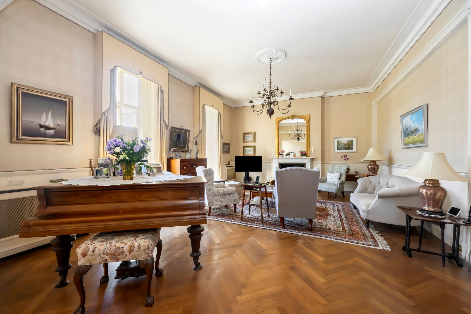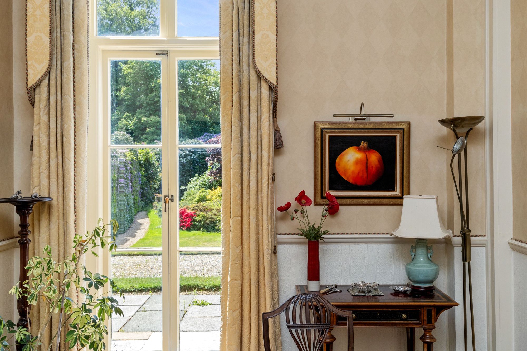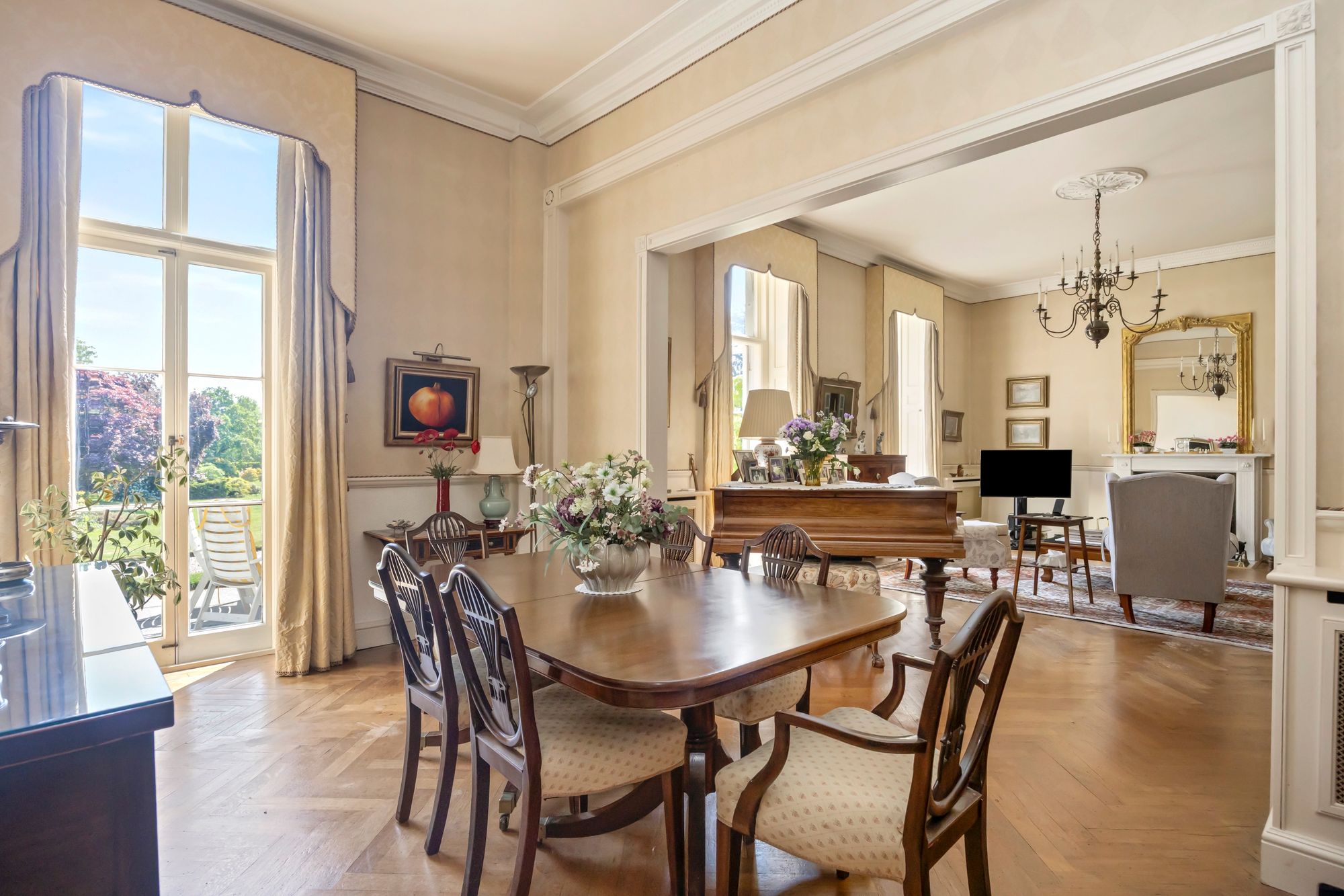 There is the opportunity to reside as one generous family home with the living and bedroom space connected by the internal staircase, the main access is through a grand reception hallway, which sets the scene with a magnificent ceiling height and a herringbone parquet floor running through. The reception Hallway leads into the main living room/drawing room which has several sets of full height opening doors opening onto the well-kept gardens, there is much retained character with the full height working shutters. The character and feeling of space continues over the ground floor with bedroom and living place including the main bedroom suite with a full ensuite bathroom. There is a second bedroom suite as well as an opportunity for a study or further bedroom, there is also a family bathroom along with a utility room and a fully functioning kitchen with a quality arrangement of wall and base cabinets and integrated appliances.