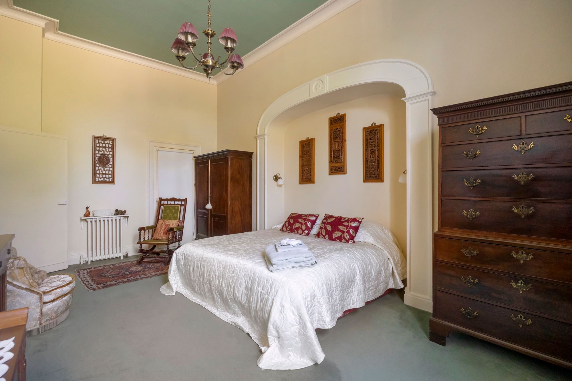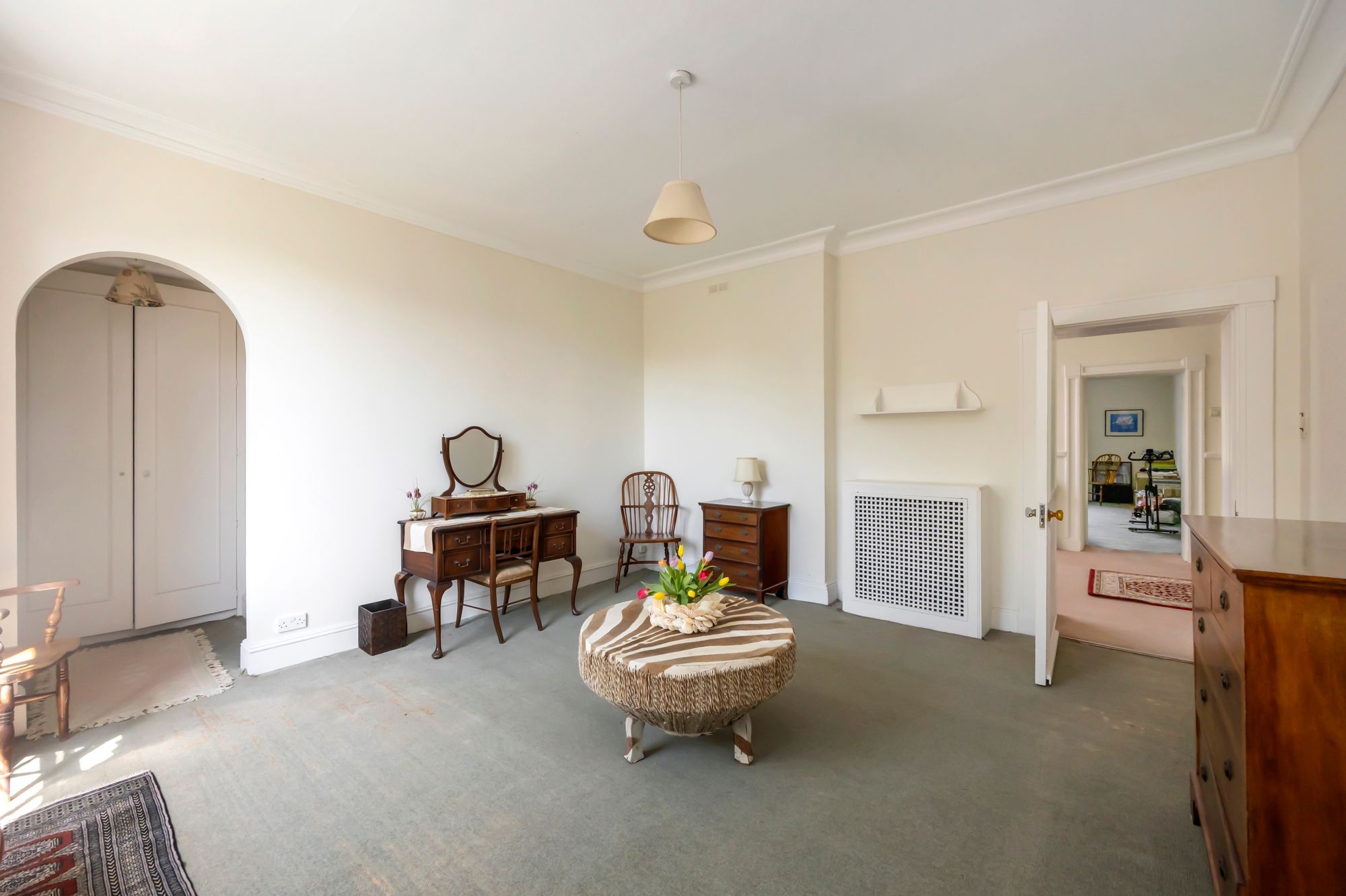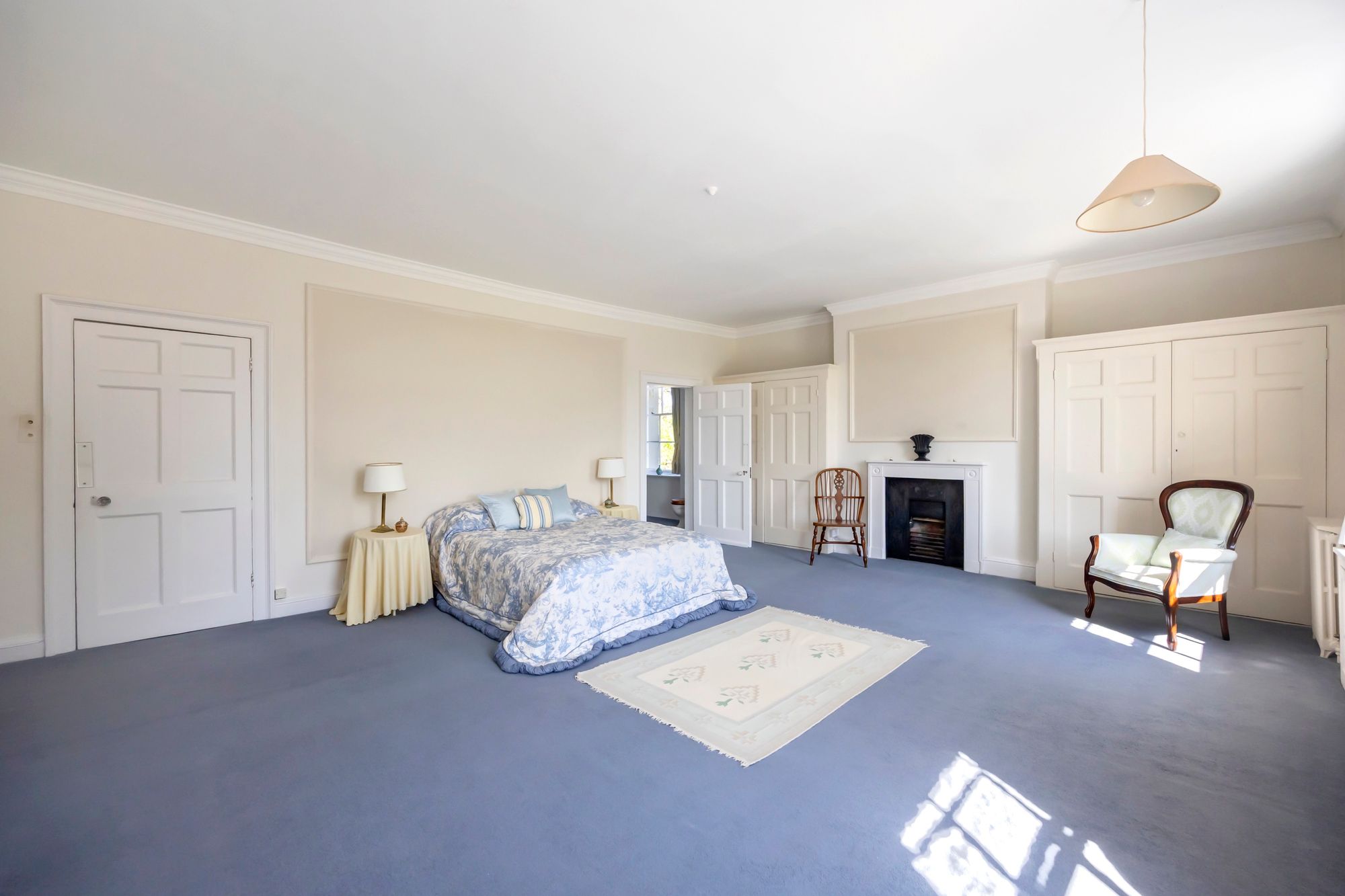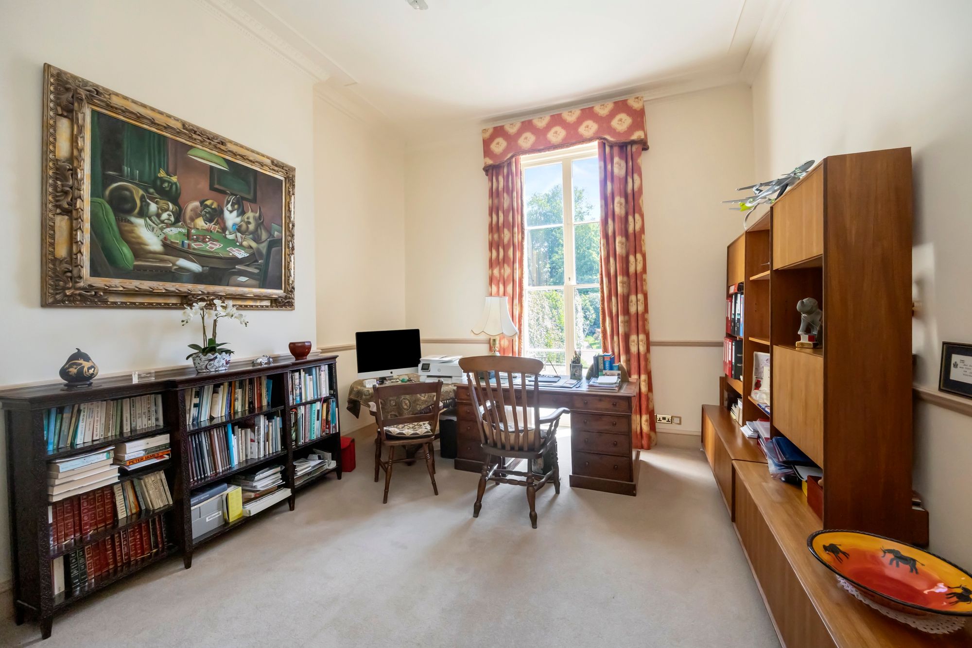 There is the opportunity to reside as one generous family home with the living and bedroom space connected by the internal staircase, the main access is through a grand reception hallway, which sets the scene with a magnificent ceiling height and a herringbone parquet floor running through. The reception Hallway leads into the main living room/drawing room which has several sets of full height opening doors opening onto the well-kept gardens, there is much retained character with the full height working shutters. The character and feeling of space continues over the ground floor with bedroom and living place including the main bedroom suite with a full ensuite bathroom. There is a second bedroom suite as well as an opportunity for a study or further bedroom, there is also a family bathroom along with a utility room and a fully functioning kitchen with a quality arrangement of wall and base cabinets and integrated appliances.