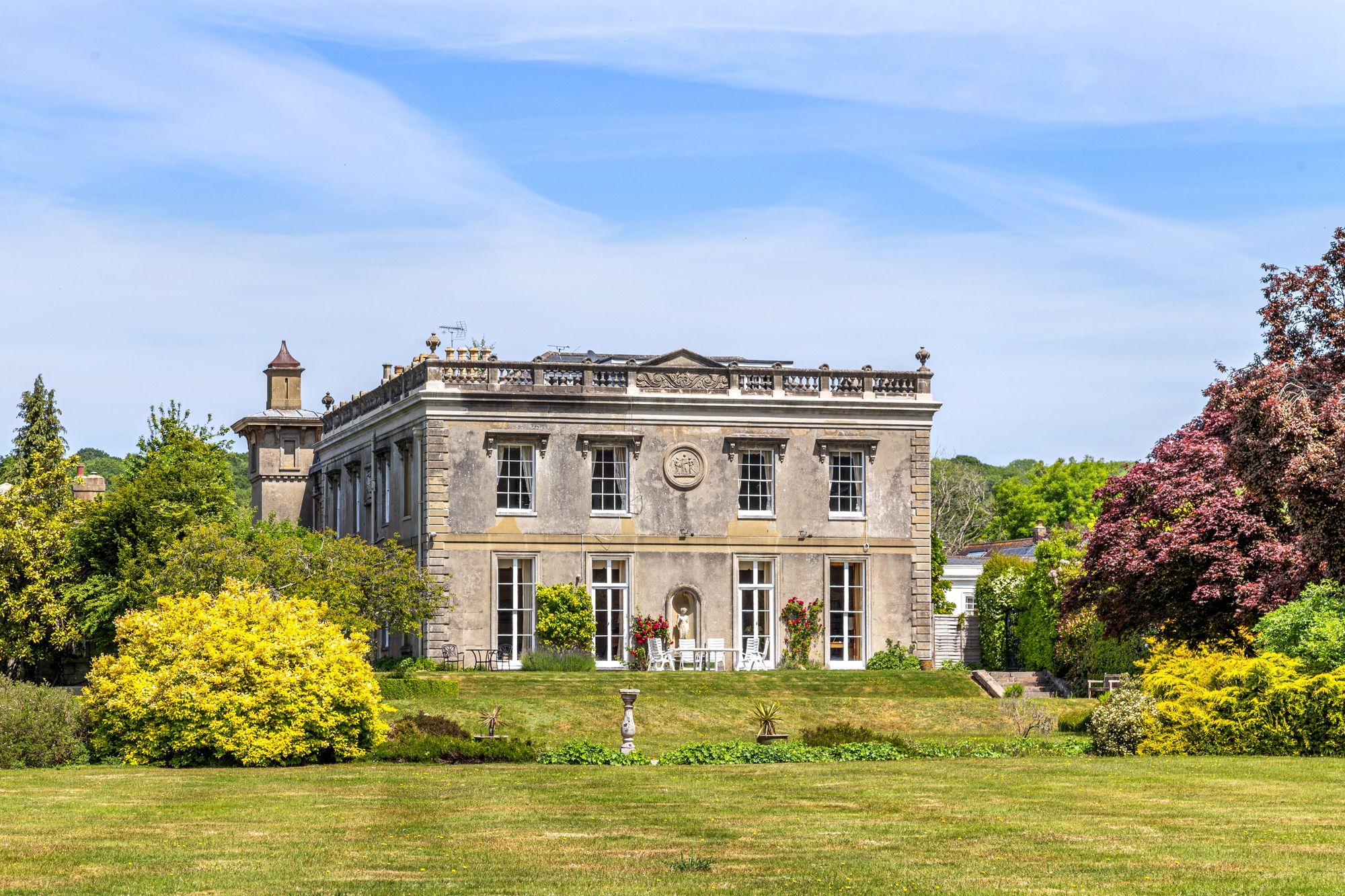 The first-floor apartment is either accessed by the internal staircase or it can be used as an independent dwelling accessed by the separate entrance and hallway, the continuation of this significant family home offers a duplex apartment that is arranged over two floors and upon entrance you are greeted with a superb feeling of light and airiness due to the sky-lantern window, it has extensive living and bedroom space with large, light and airy well proportioned rooms that enjoy stunning elevated views over the mature and well kept gardens and countryside. In total there are four bedrooms, three bathrooms and a working kitchen, there is also a staircase leading to the second floor and two further loft rooms which offers access to the roof terrace.