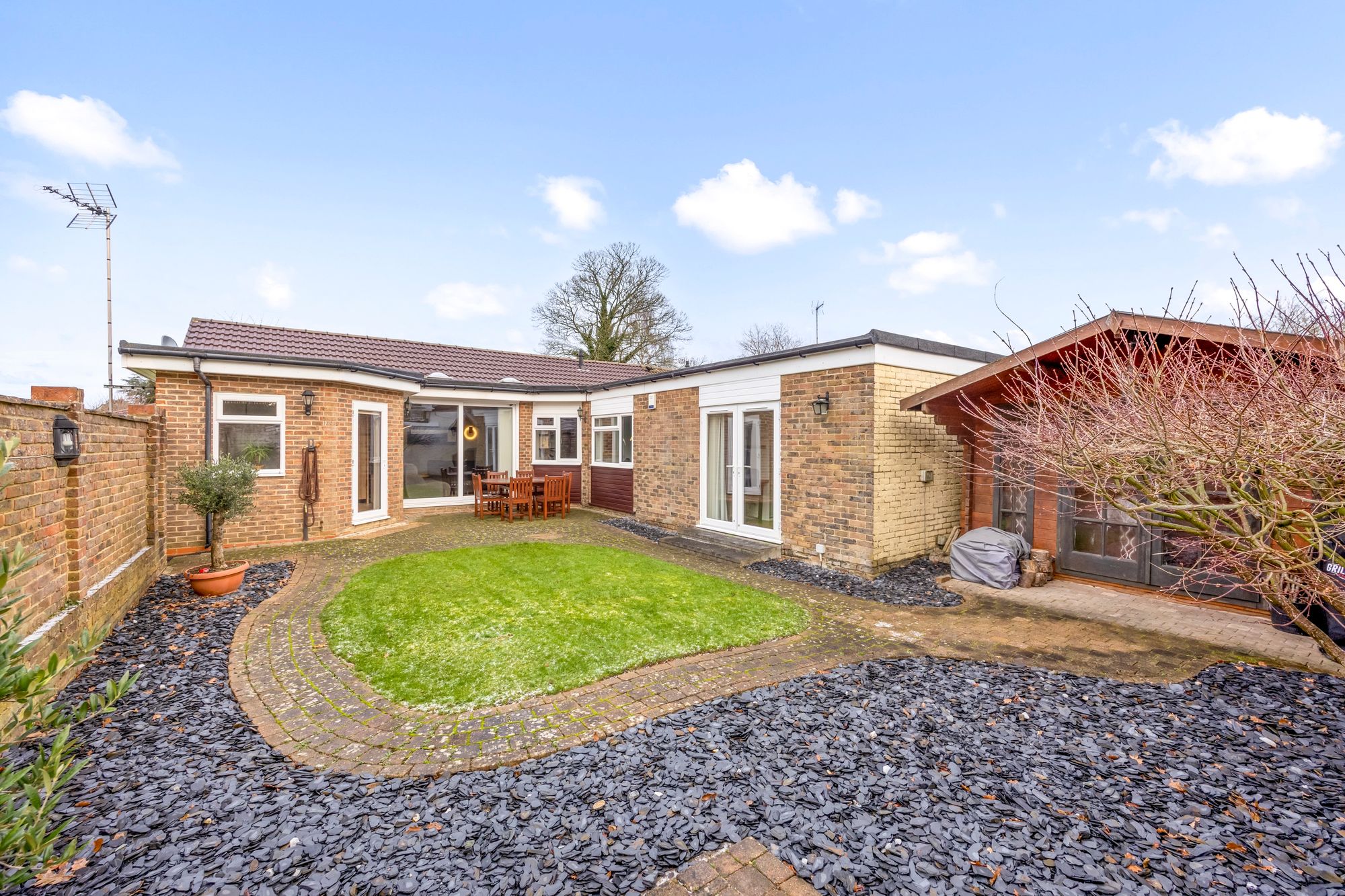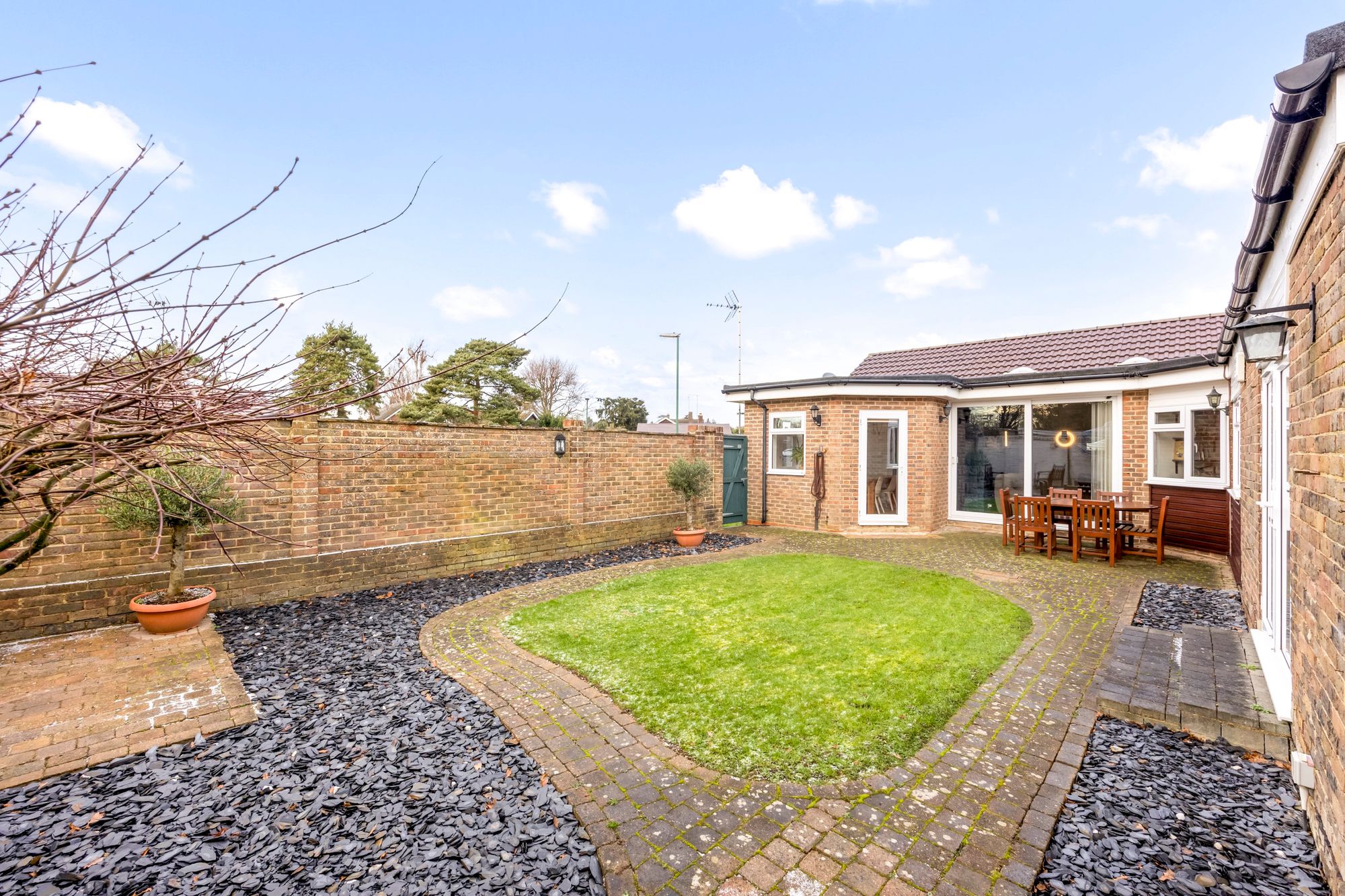 The bathroom benefits from a walk-in shower cubicle, low level WC and vanity wash hand basin and storage. An inner hallway leads to three double bedrooms, all with views of the rear garden and built-in wardrobes. Bedroom one also benefits from double doors to the garden and en-suite shower room .Beautifully presented three-bedroom bungalow situated in North West of Horsham town centre.