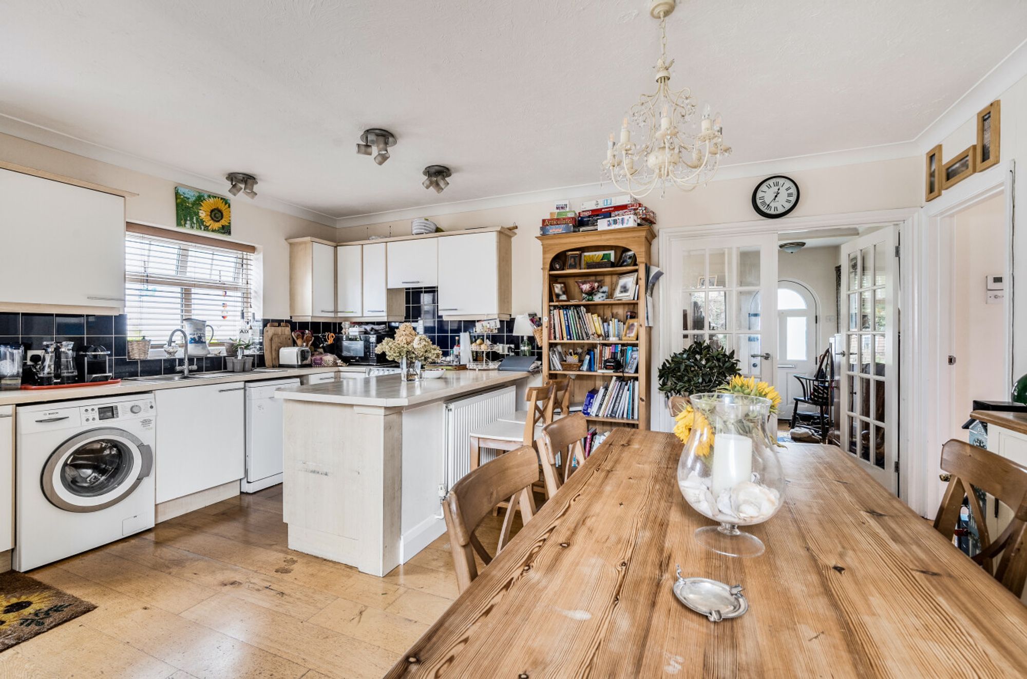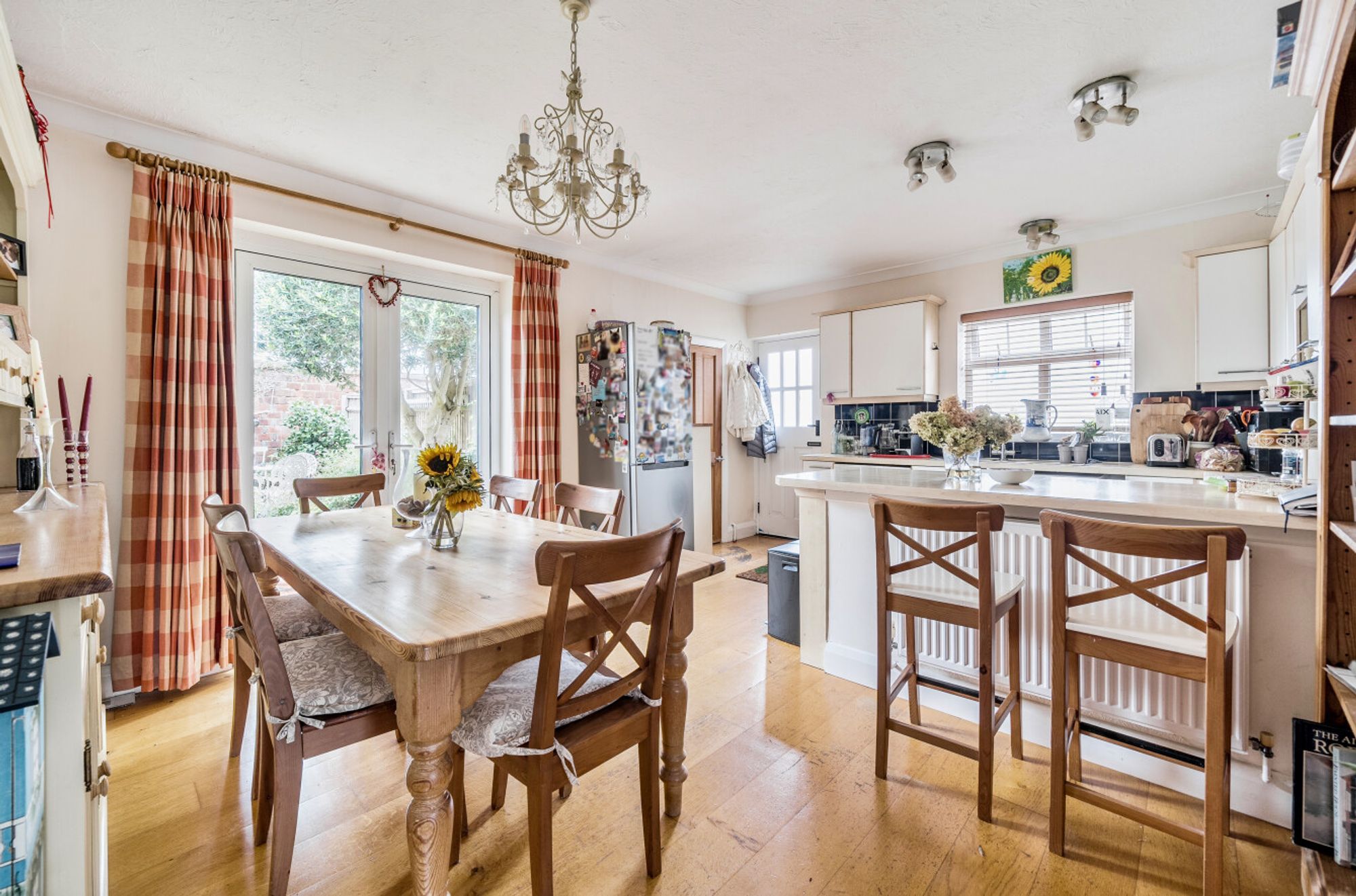 A welcoming entrance opens directly into a charming sitting room, where a large bay window fills the space with natural light and an open fireplace, complete with wood-burning stove, creates a cosy focal point. From here, glazed double doors lead into the heart of the home, a spacious kitchen/dining room. The kitchen is well-fitted with a comprehensive range of cupboards and work surfaces, as well as a breakfast bar for casual dining. The adjoining dining area is ideal for entertaining, with French doors opening directly to the garden for seamless indoor-outdoor living.
