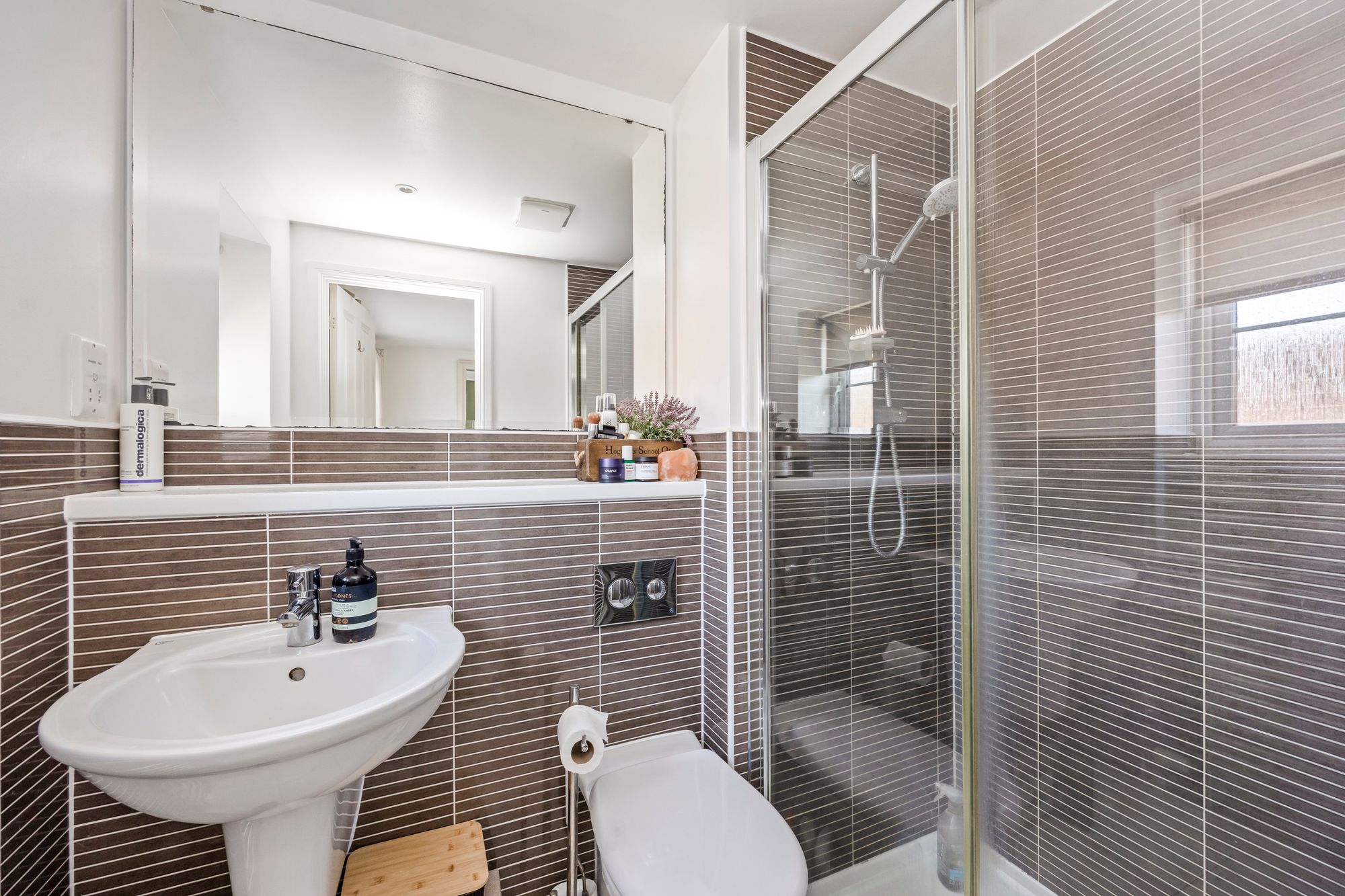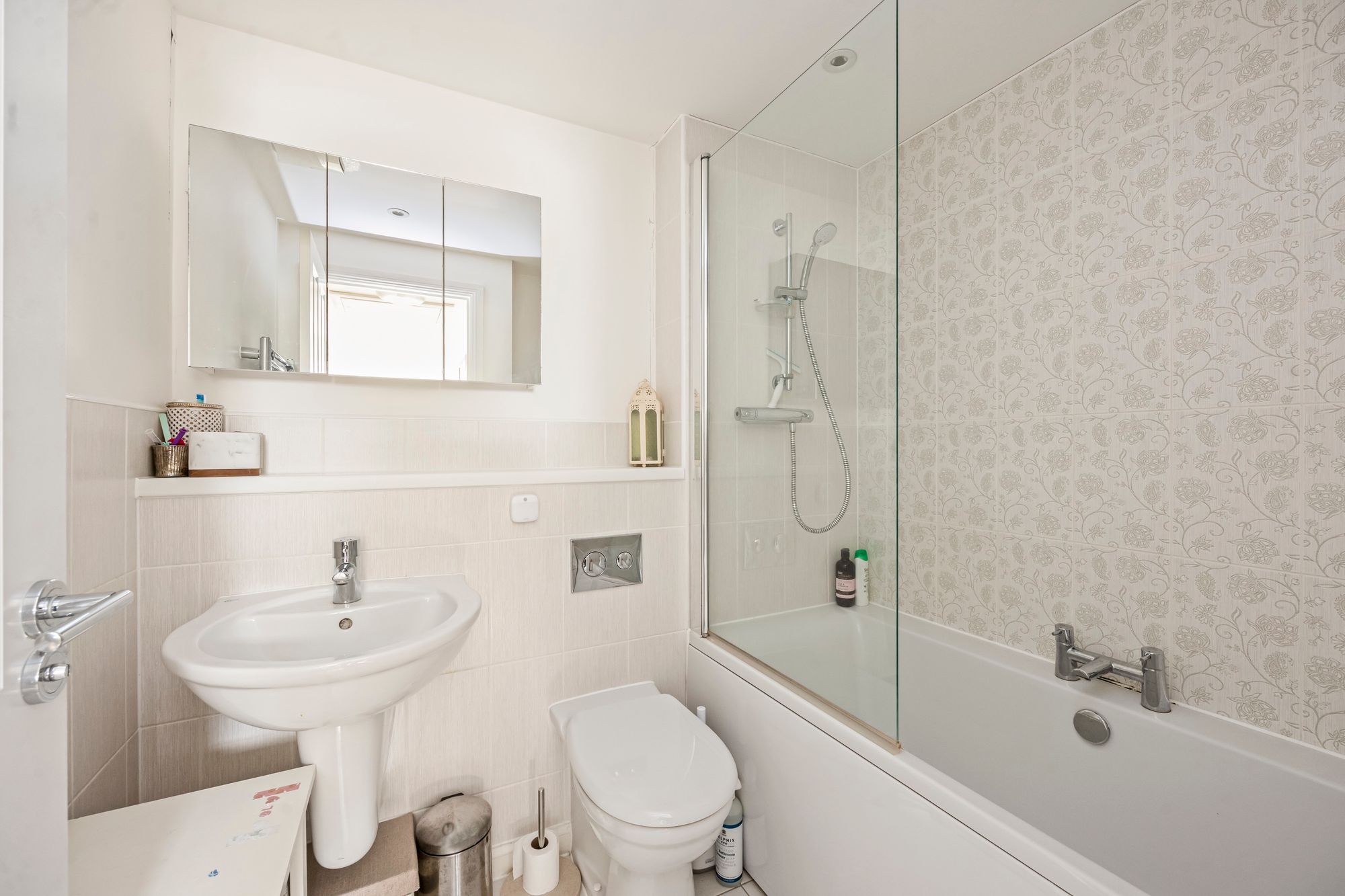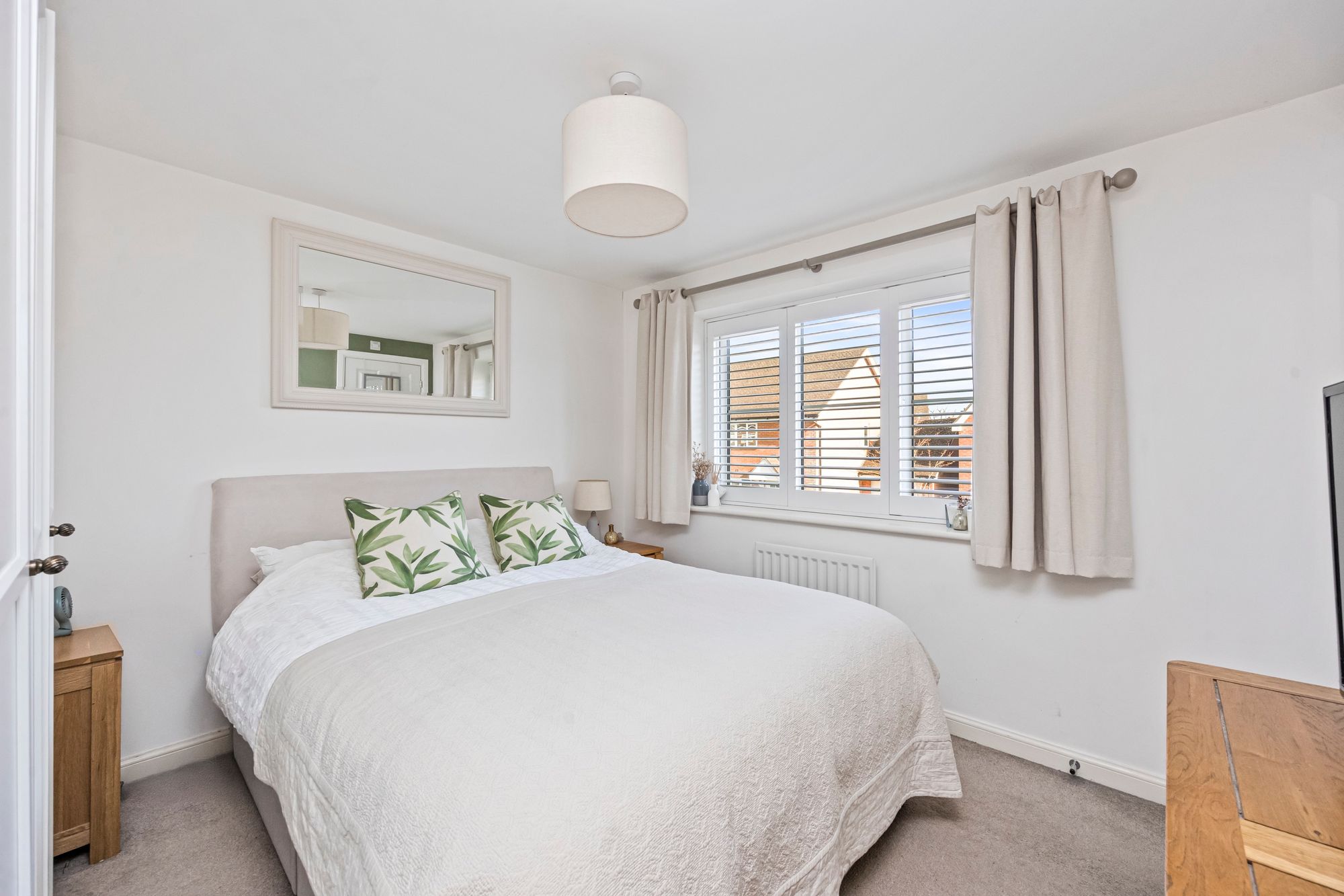 To the first floor, the principal bedroom features a spacious walk in wardrobe and a modern en-suite shower room. There are two further well-proportioned bedrooms and a family bathroom, fully tiled and complete with a heated towel rail.