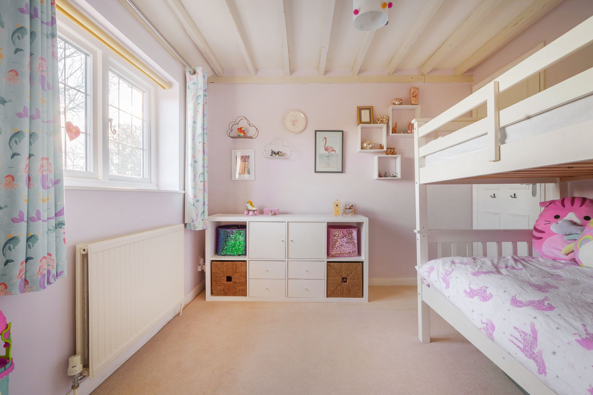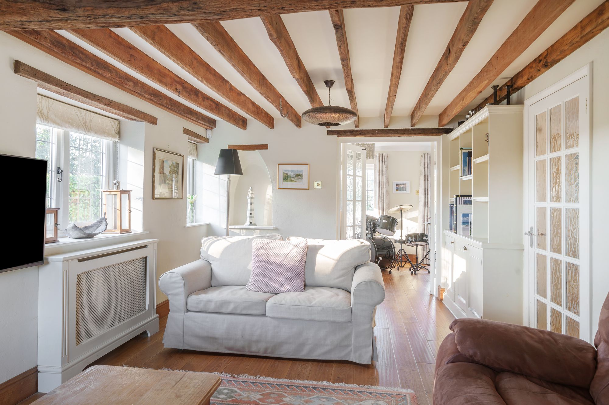 Upstairs, the sense of character continues, with exposed beams featuring on the landing and within several of the bedrooms. There are four well-proportioned double bedrooms, including a principal suite with en-suite shower room. The second and fourth bedrooms both benefit from attractive painted beams, adding further personality, while the remaining bedrooms are served by a well-appointed family bathroom.