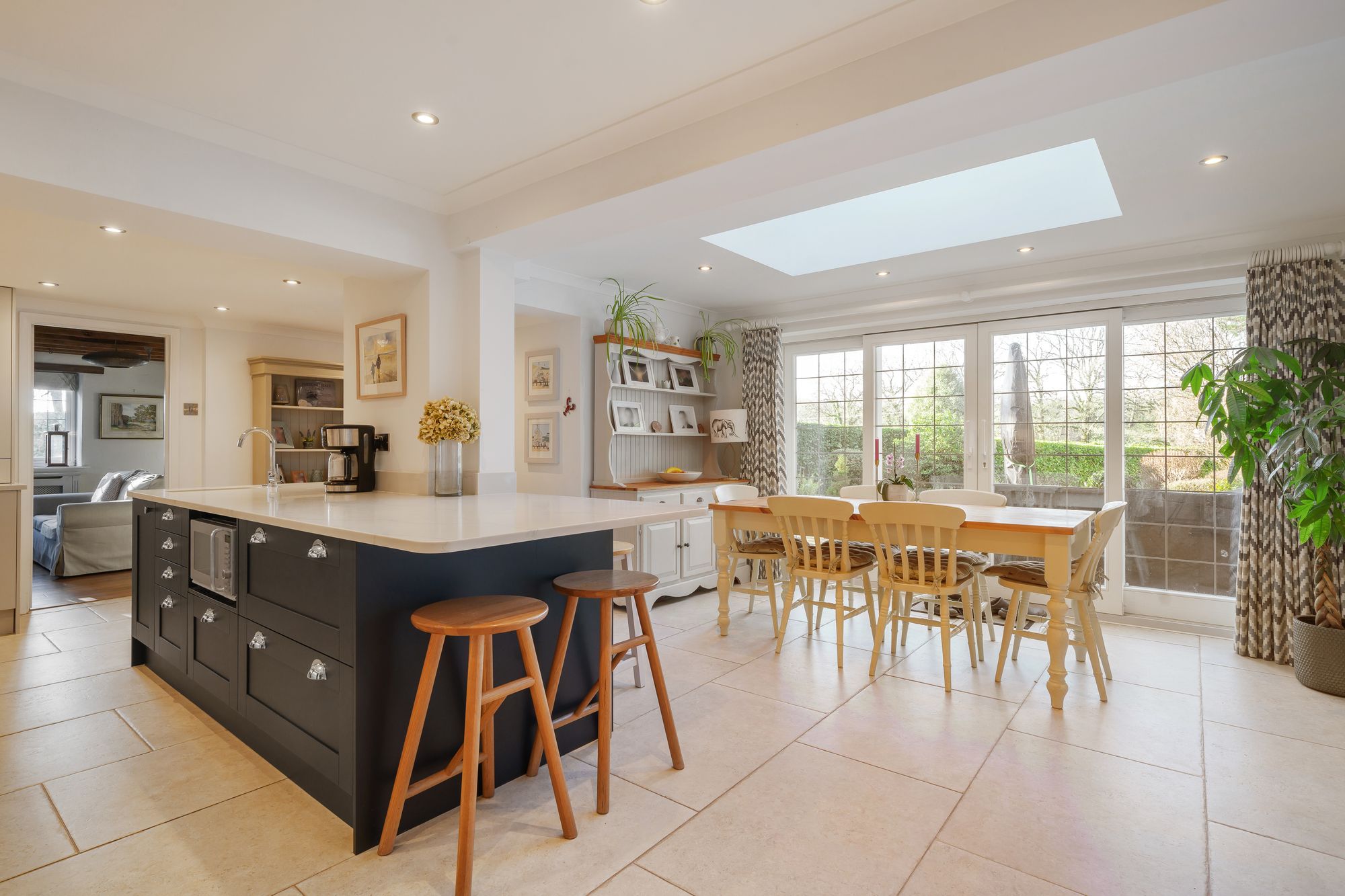 The property has been thoughtfully improved by the current owners, most notably with the creation of an impressive open-plan kitchen/dining room. This contemporary space forms the heart of the home, featuring extensive cabinetry, generous preparation areas and wide sliding doors opening directly onto the garden, perfect for both relaxed family living and entertaining.