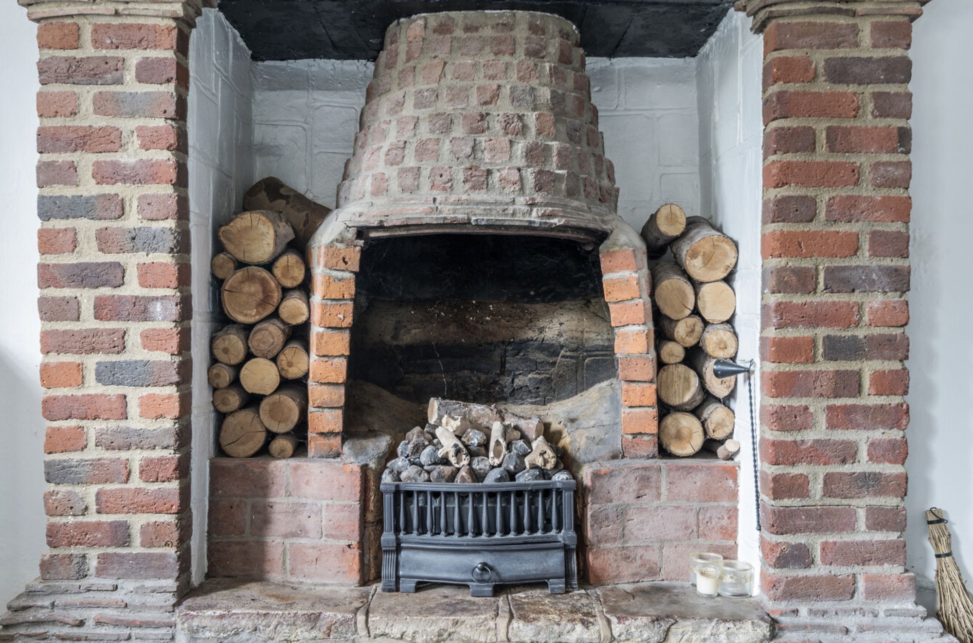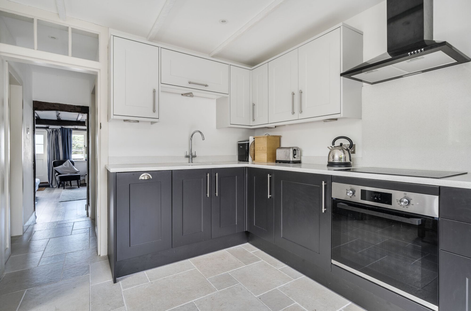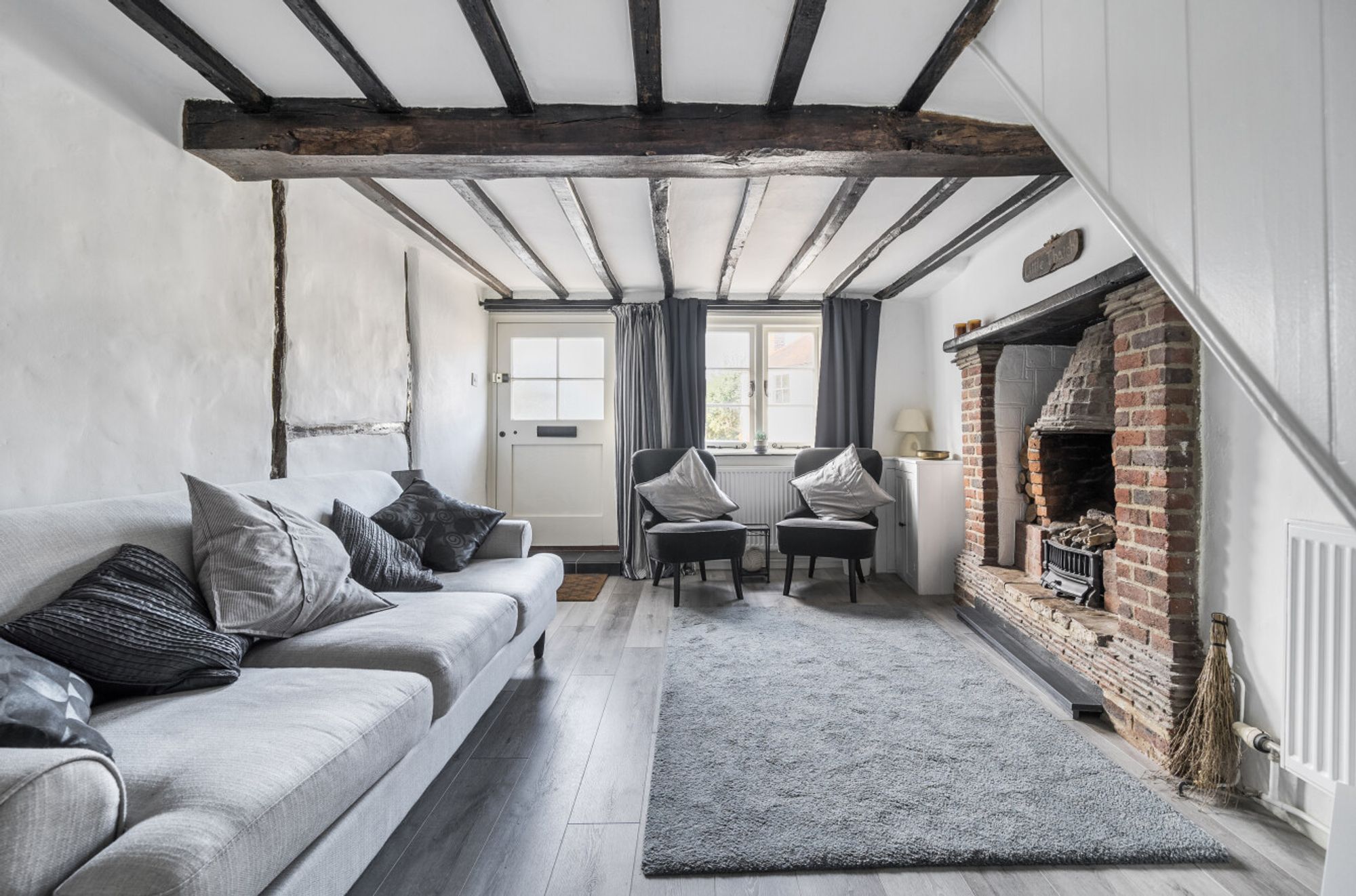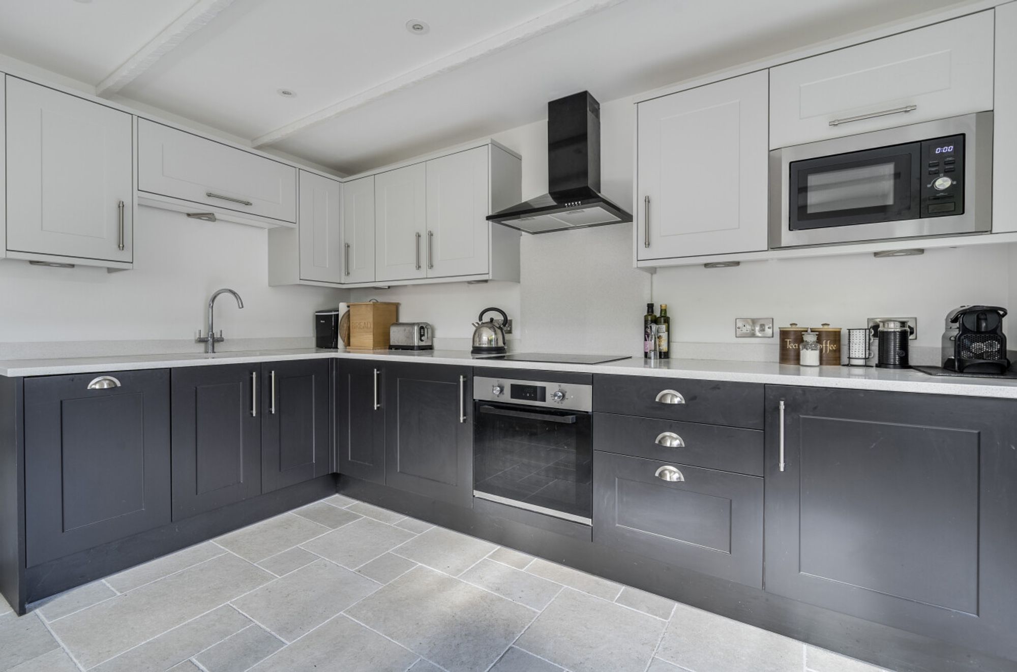 The front door opens into a welcoming reception room, where exposed timber beams and a captivating beehive fireplace create a warm and distinguished ambience. From here, a hallway leads past a cloakroom and a separate shower room to the generously proportioned kitchen. This space exudes a sleek, contemporary style, with bespoke cabinetry that harmoniously blends modern design with the home’s period character. Full-width bi-fold doors frame the view and open onto a private courtyard garden, where a raised terrace and a discreet storage shed add both charm and practicality.