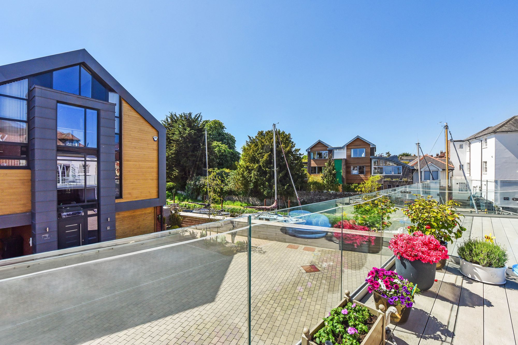 The principal living space is arranged on the first floor to maximise both light and water views. A generous open-plan sitting and dining area, complete with bespoke media cabinetry, flows seamlessly into a fully integrated kitchen fitted with premium appliances. Full-height glazed doors open onto a south-facing terrace with glass balustrades and privacy screening, an ideal extension of the living space for entertaining and summer dining.