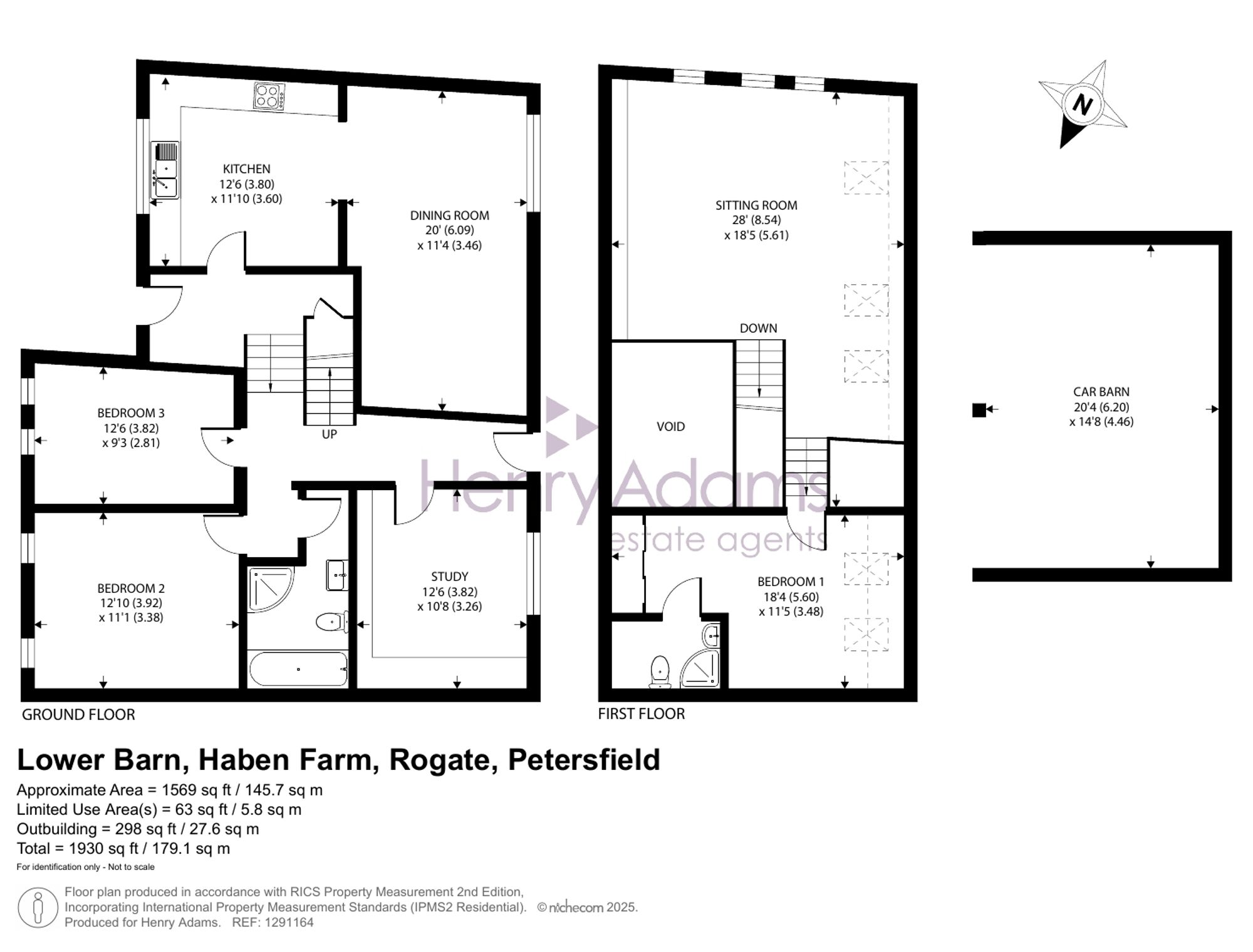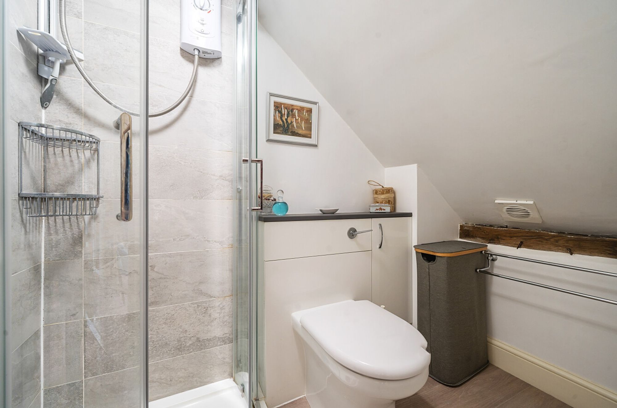 Stairs from the ground floor lead up to a large bright living room with wonderful views across farmland to the South Downs. The wood burner, wooden floor and beams all add to the character. Off this room is the main bedroom with an en-suite shower room and built in wardrobe. There is also a large eaves cupboard off of the living room providing plenty of storage space.