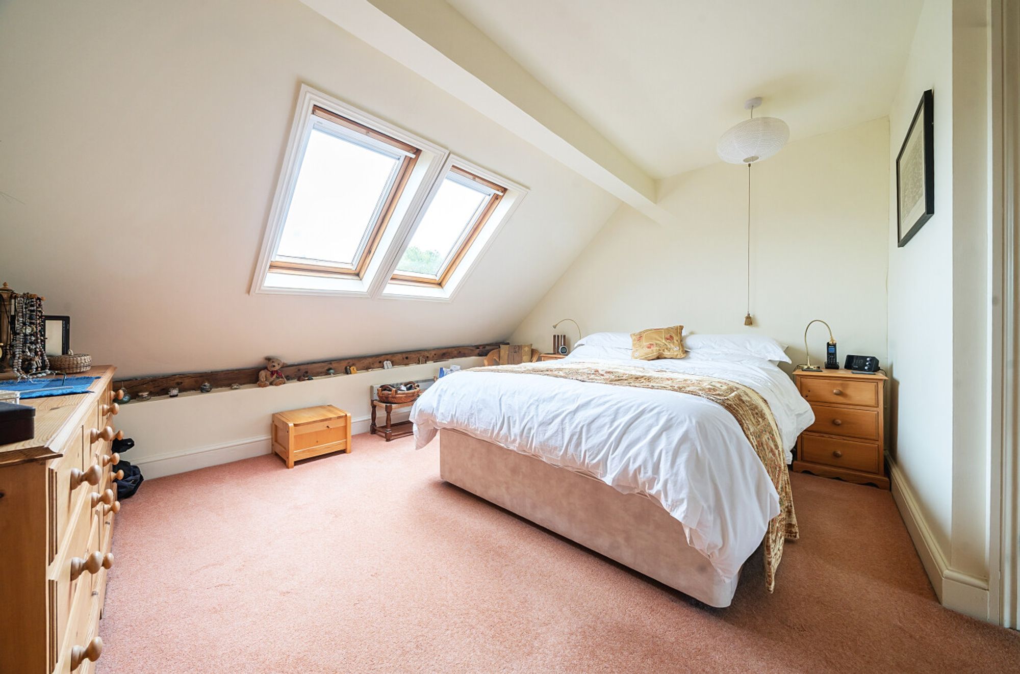 The entrance hall leads to an impressive bespoke fitted study with desk area, cupboards, drawers and shelving. This could also be used as a fourth bedroom. Also on this floor are two good sized double bedrooms with original beams and views over the back garden. There is also a main bathroom which has a bath and separate shower.