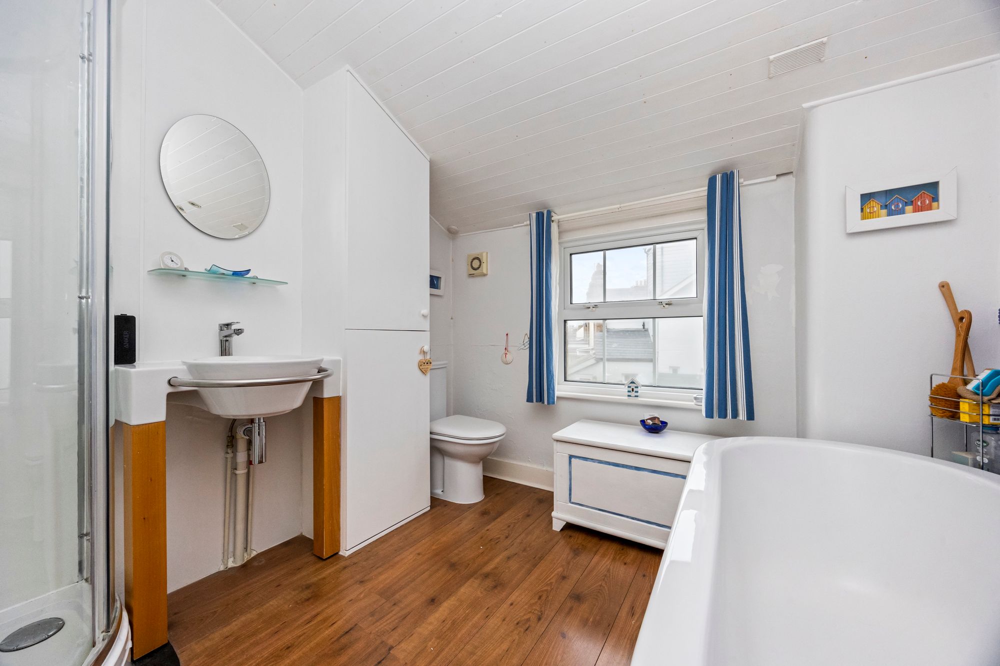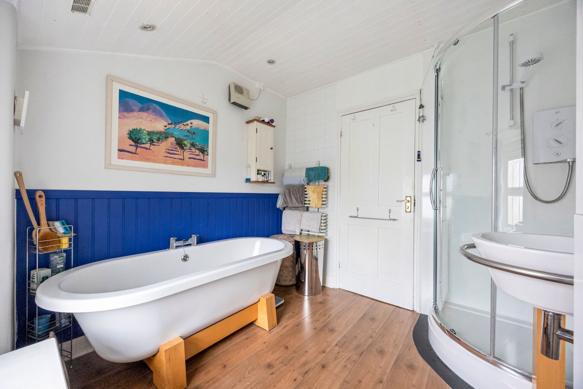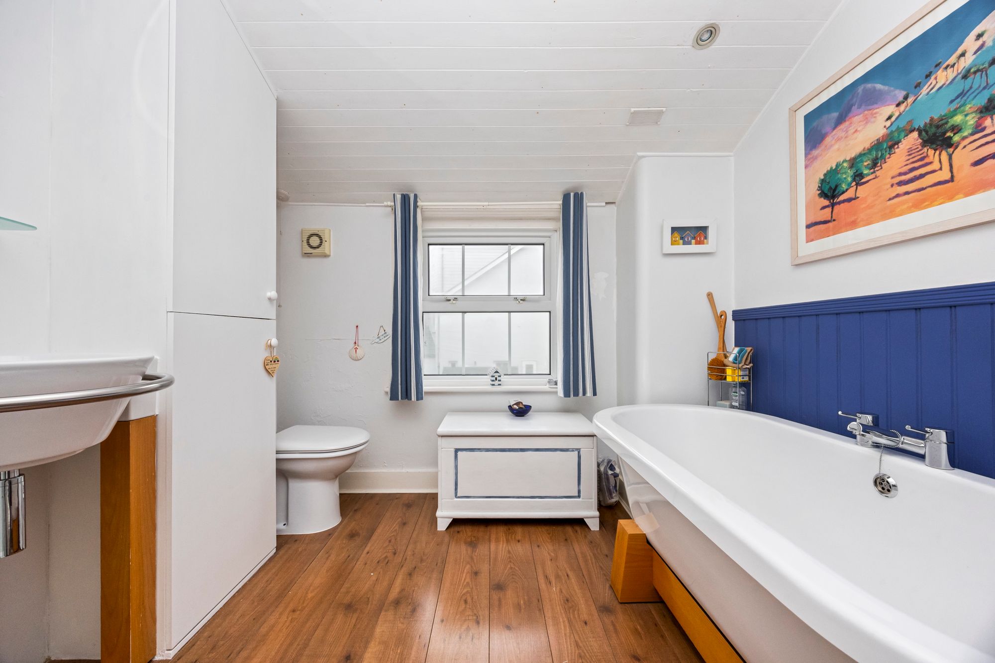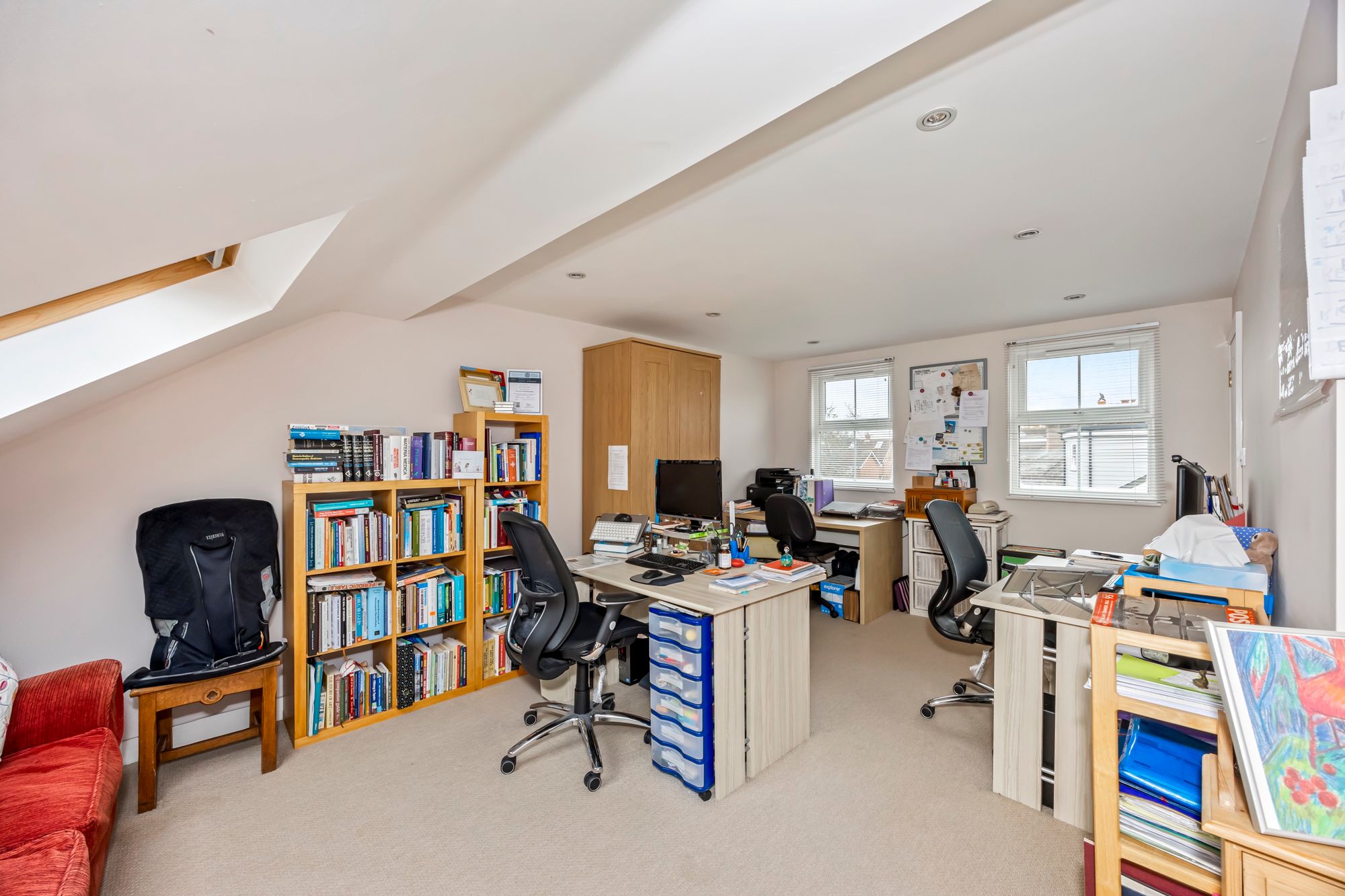 As you ascend to the first floor, you will find two generously sized double bedrooms, each offering ample built in storage options and natural light. The stunning bathroom is spacious and features a luxurious roll-top bath and separate shower. Additionally, the property includes a loft converted third bedroom which spans the whole of the house and has dual aspect and is currently utilised as a work form home office.