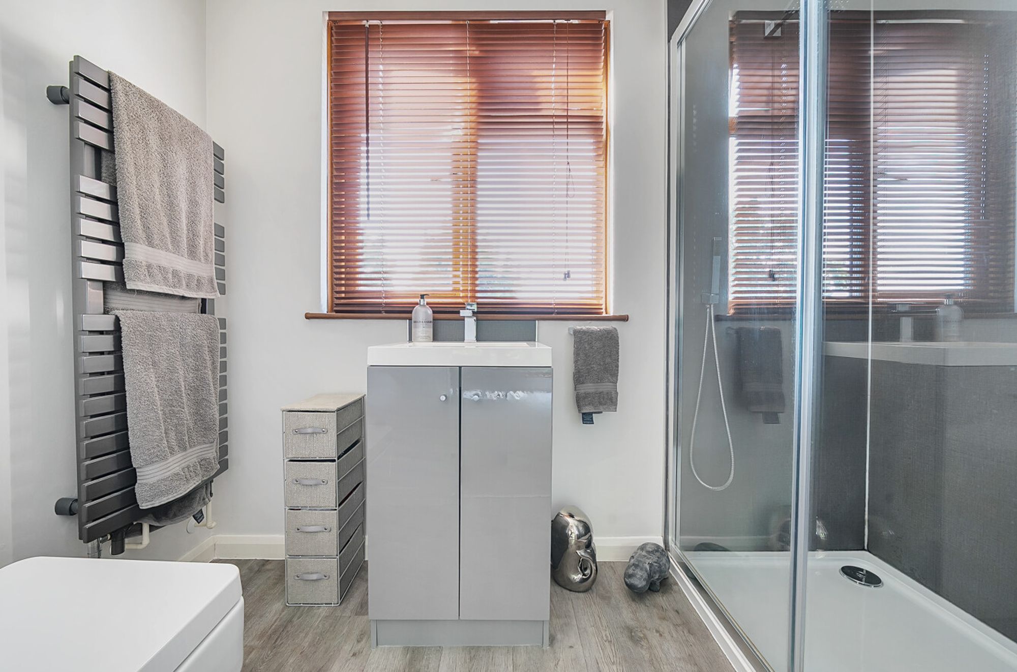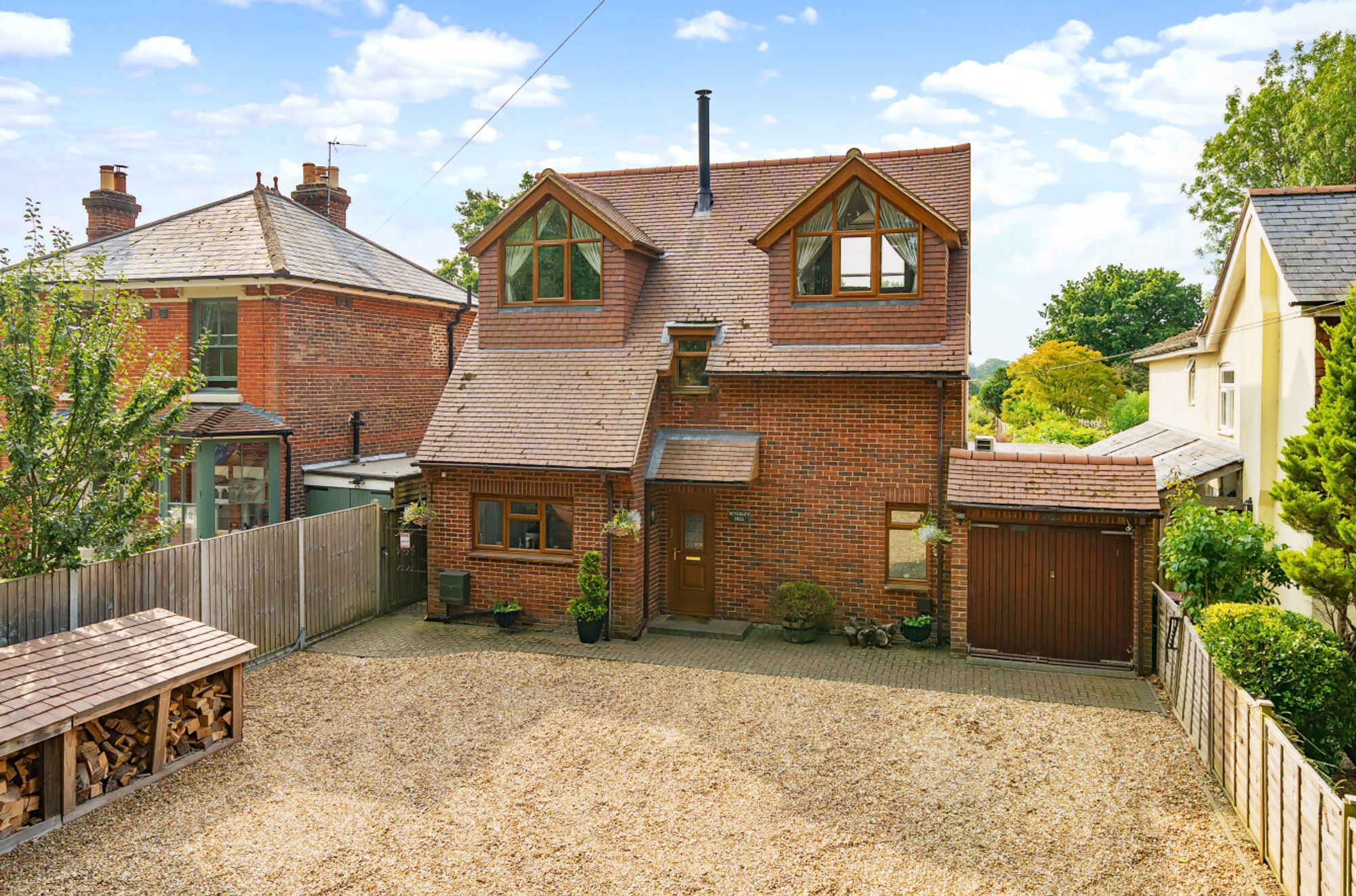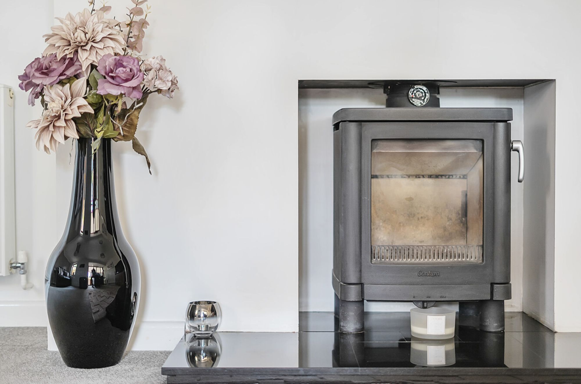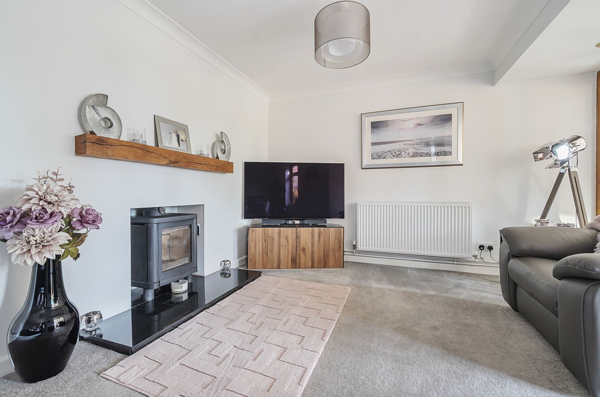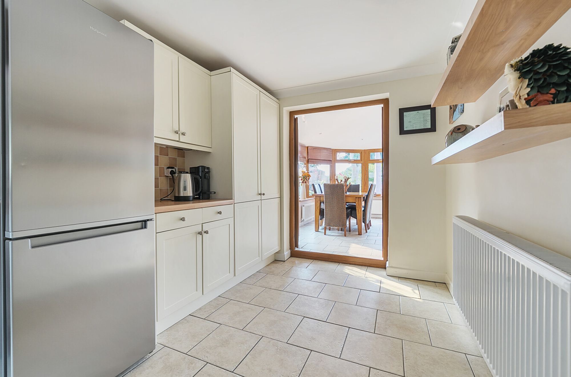 Inside, the house has been thoughtfully designed to make the most of the light and outlook. The welcoming entrance hall leads to a bright sitting room with a wood-burning stove, the perfect place to gather on cooler evenings. Sliding doors open into a large sun room that works beautifully as a dining and entertaining space, with French doors flowing directly out to the garden. The classic shaker-style kitchen is both practical and inviting, offering plenty of storage alongside space for family breakfasts and casual meals.