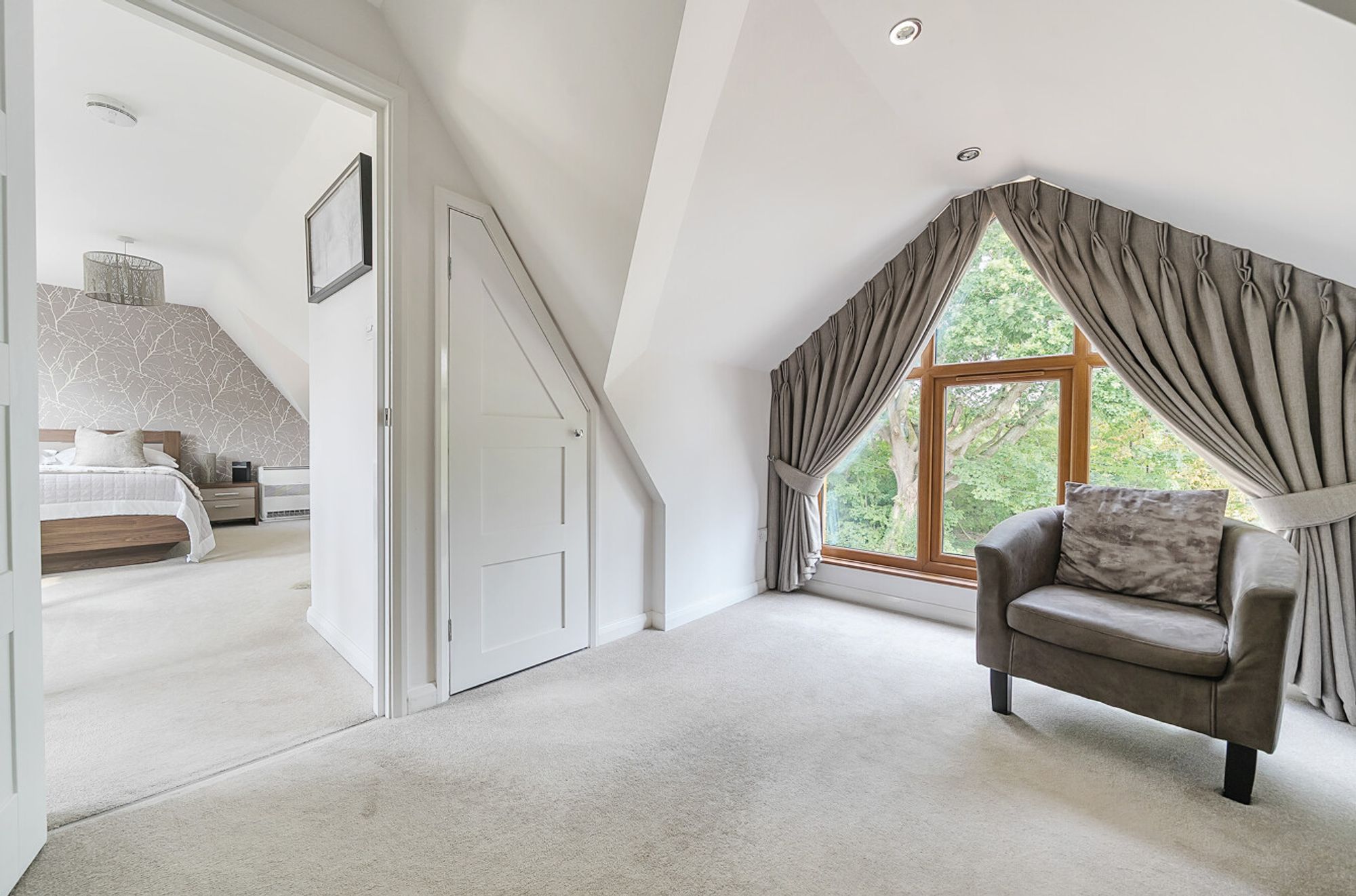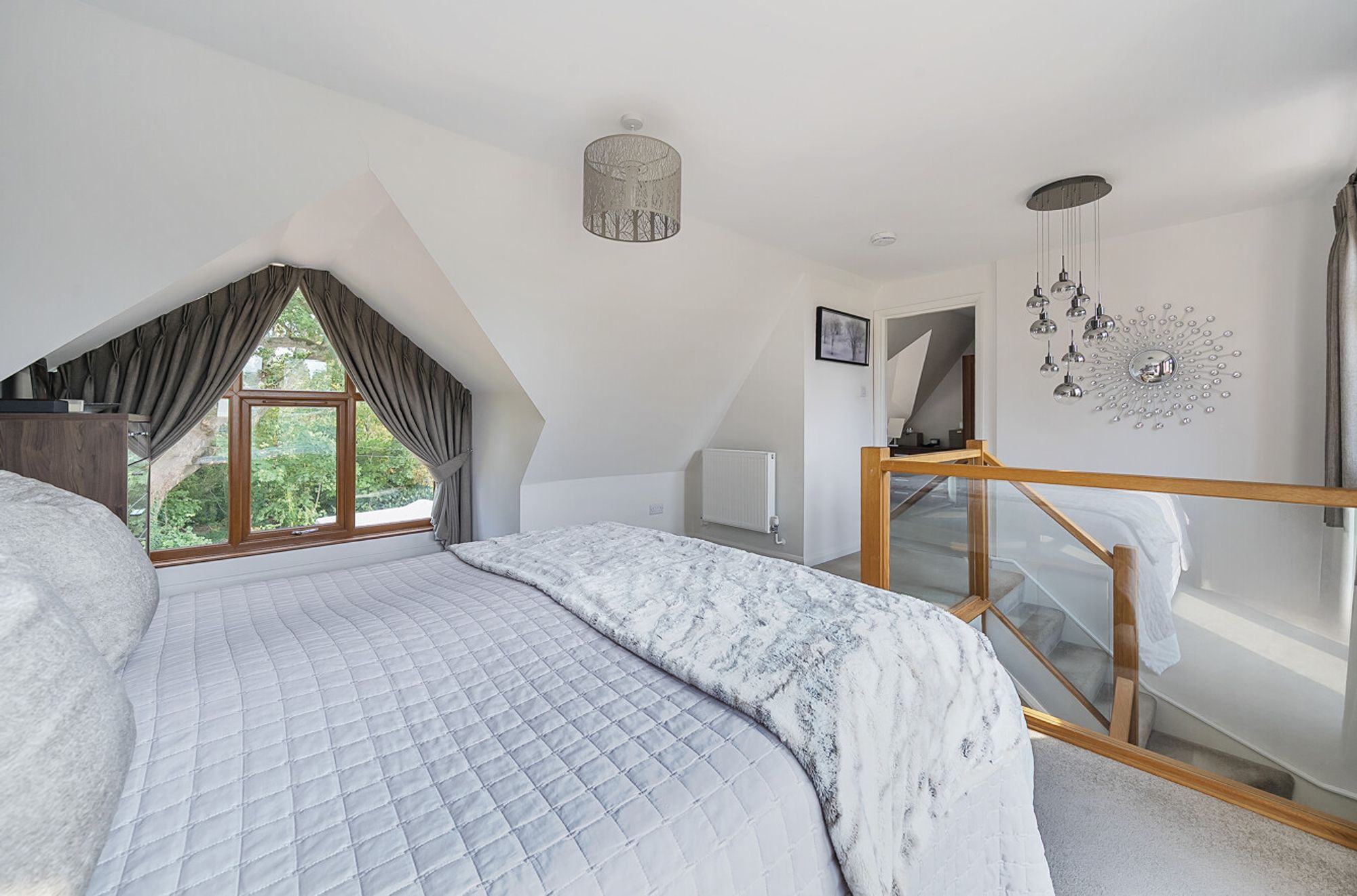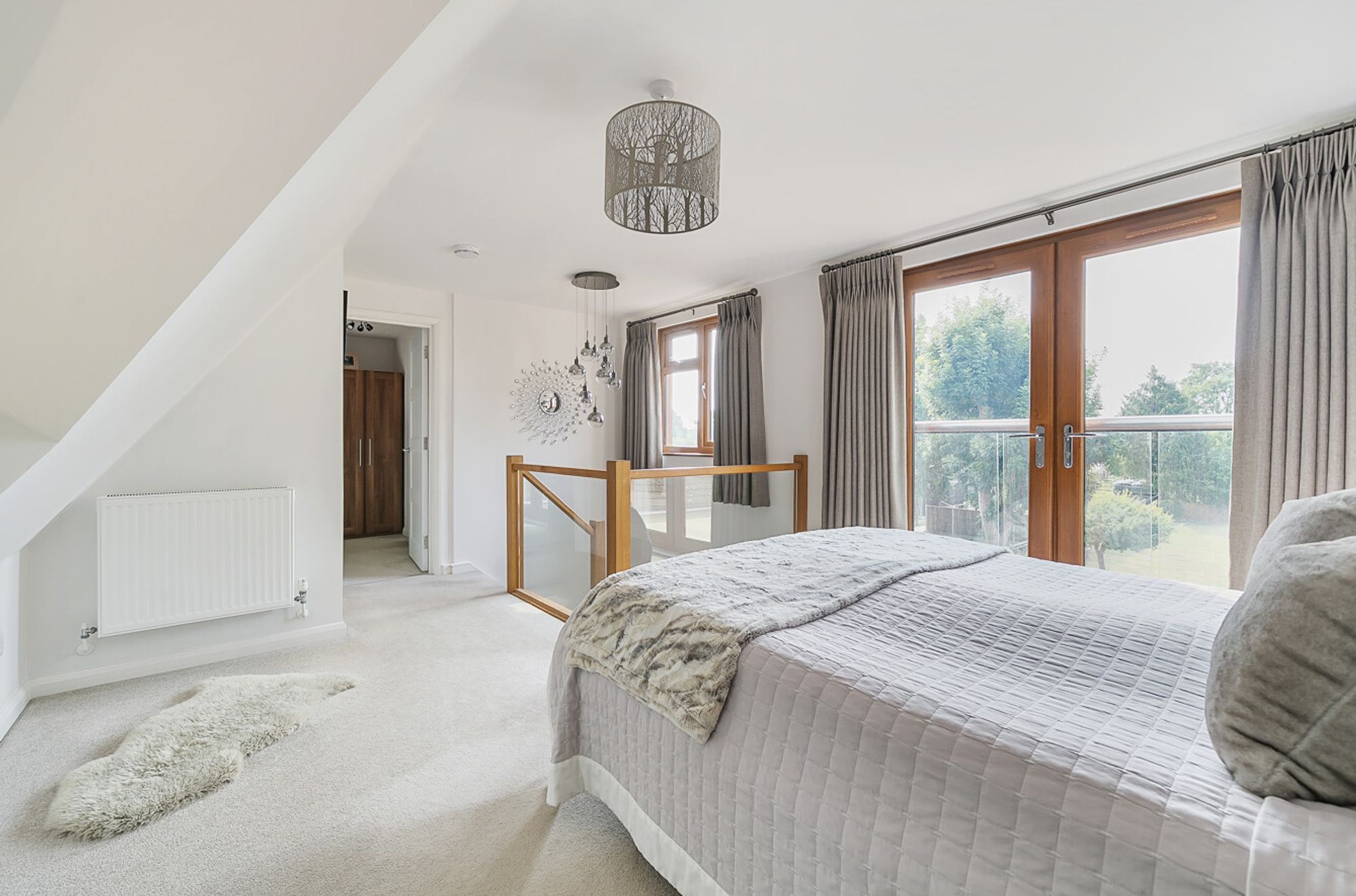 Upstairs, the first floor provides two well-proportioned bedrooms and a family bathroom. A door from the landing reveals stairs leading up to a stunning principal bedroom suite. This light-filled retreat occupies the entire top floor, with striking angular windows, air conditioning for comfort and French doors opening to a Juliet balcony where you can take in the peaceful countryside views. A dressing room and luxurious ensuite shower room complete this very special space.
