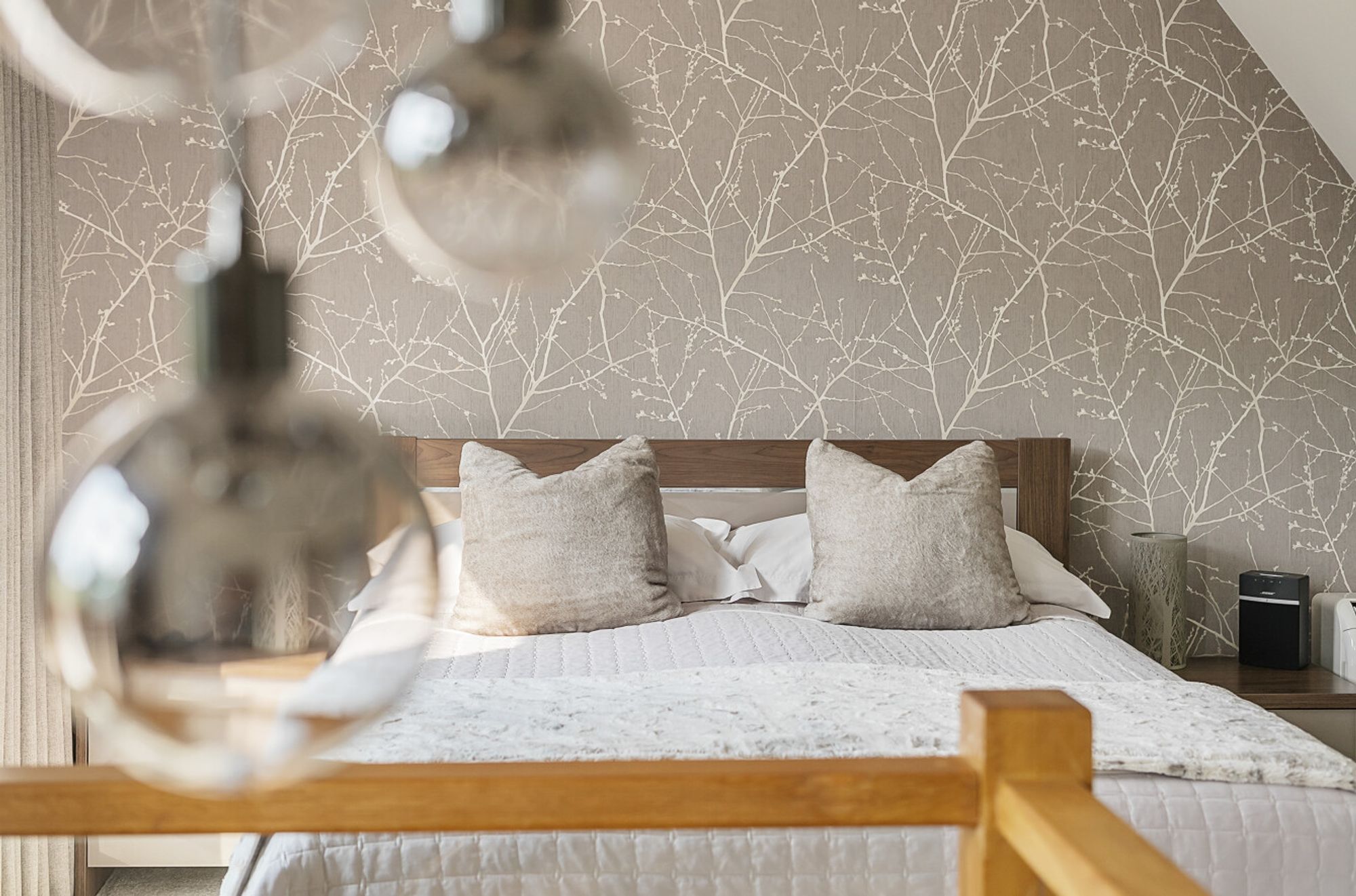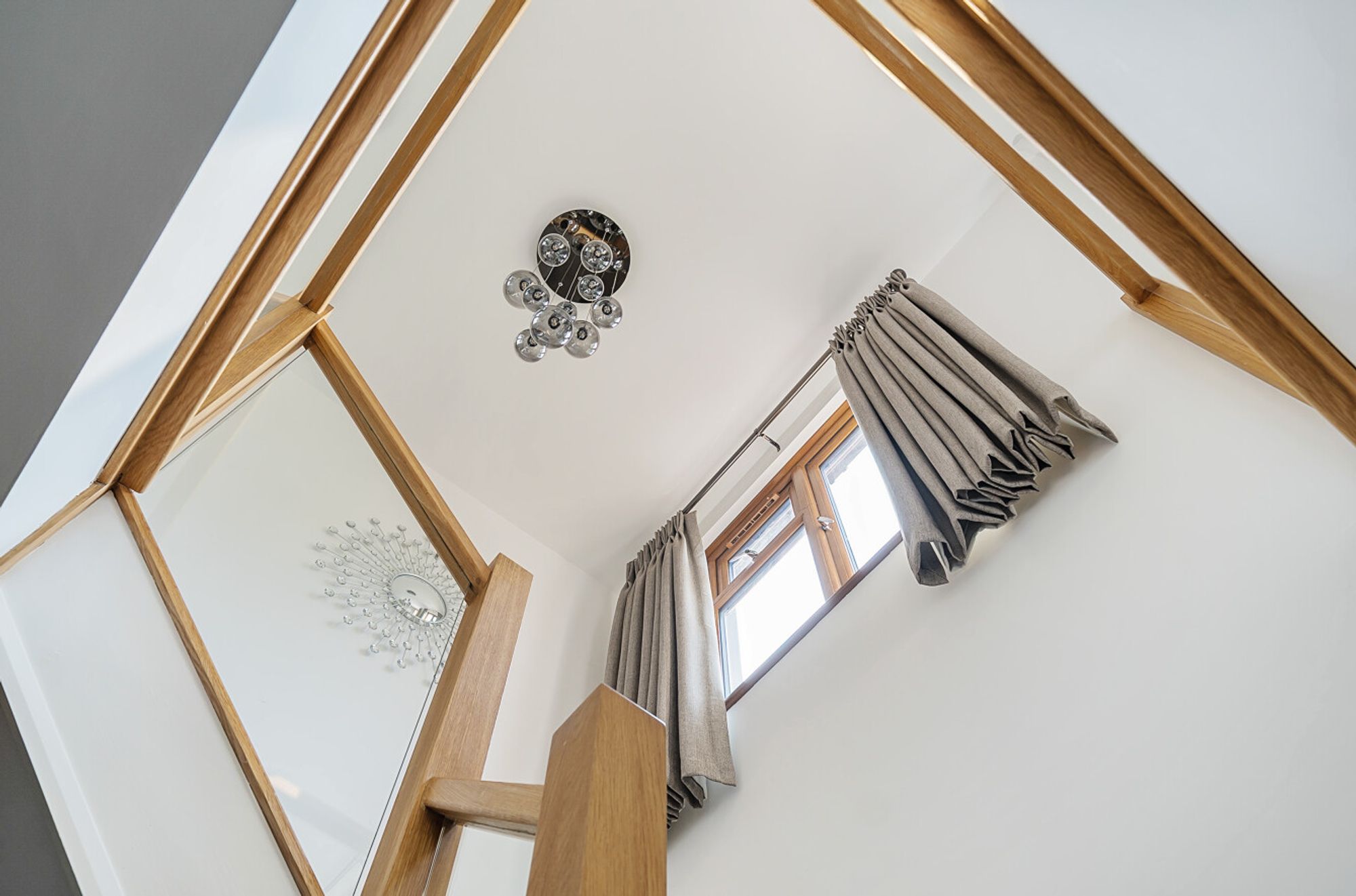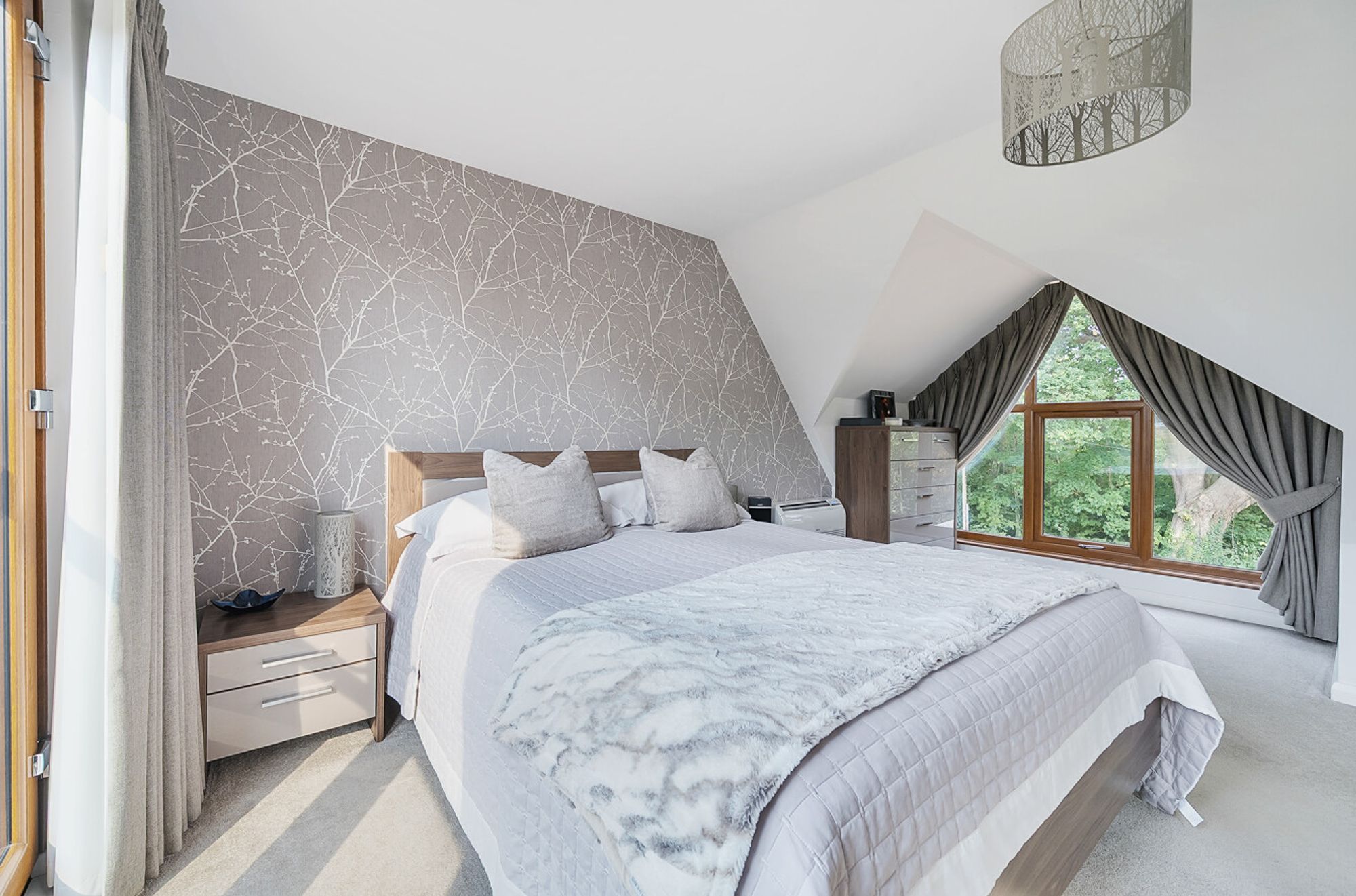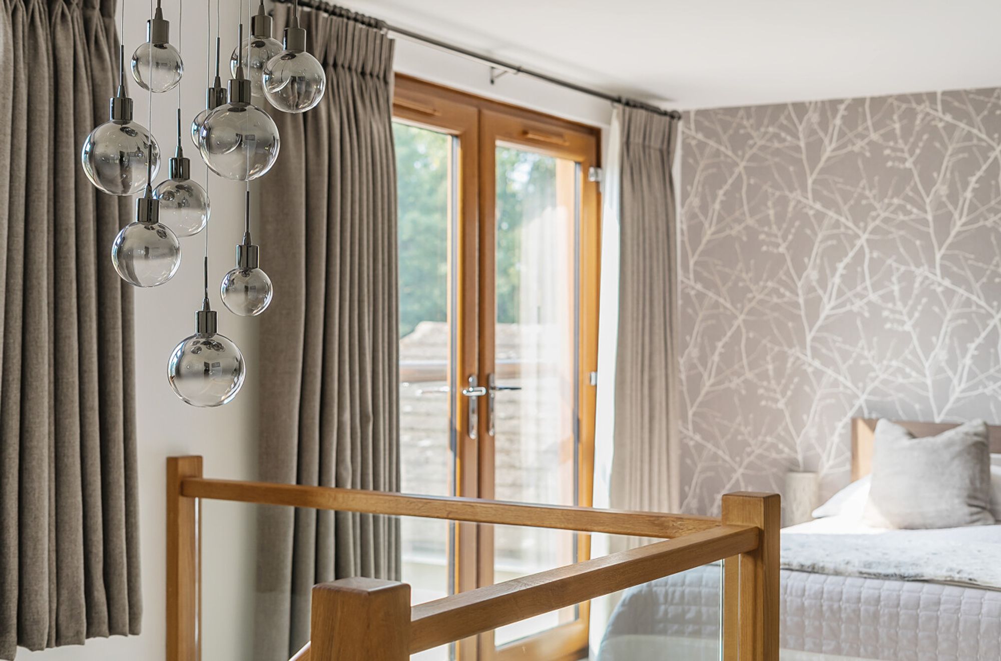 Upstairs, the first floor provides two well-proportioned bedrooms and a family bathroom. A door from the landing reveals stairs leading up to a stunning principal bedroom suite. This light-filled retreat occupies the entire top floor, with striking angular windows, air conditioning for comfort and French doors opening to a Juliet balcony where you can take in the peaceful countryside views. A dressing room and luxurious ensuite shower room complete this very special space.