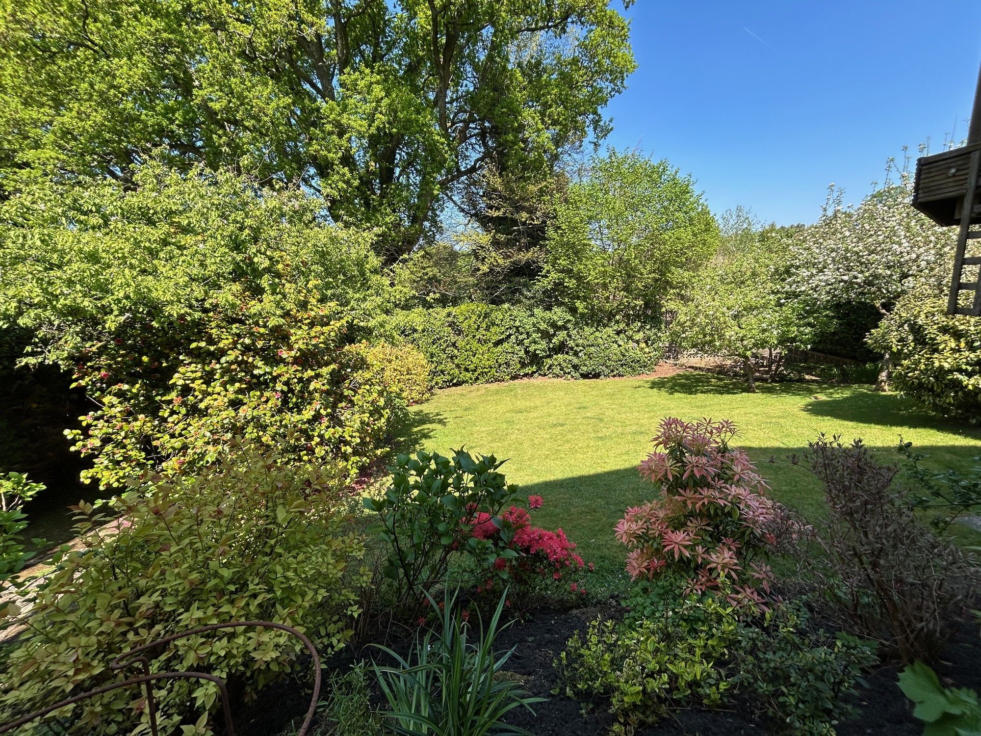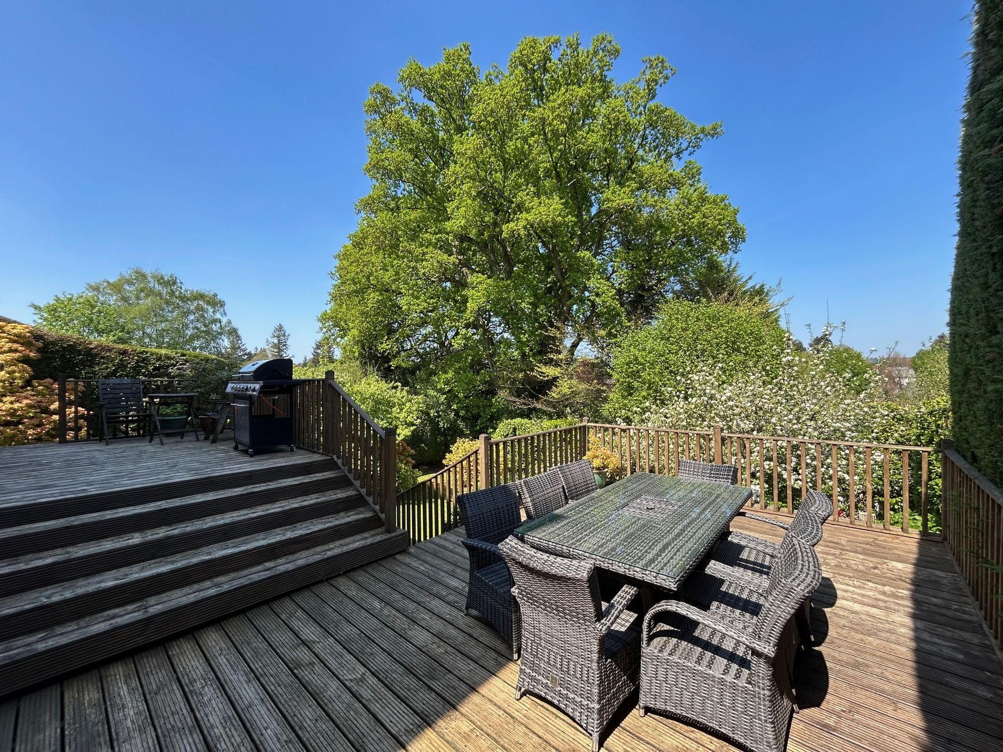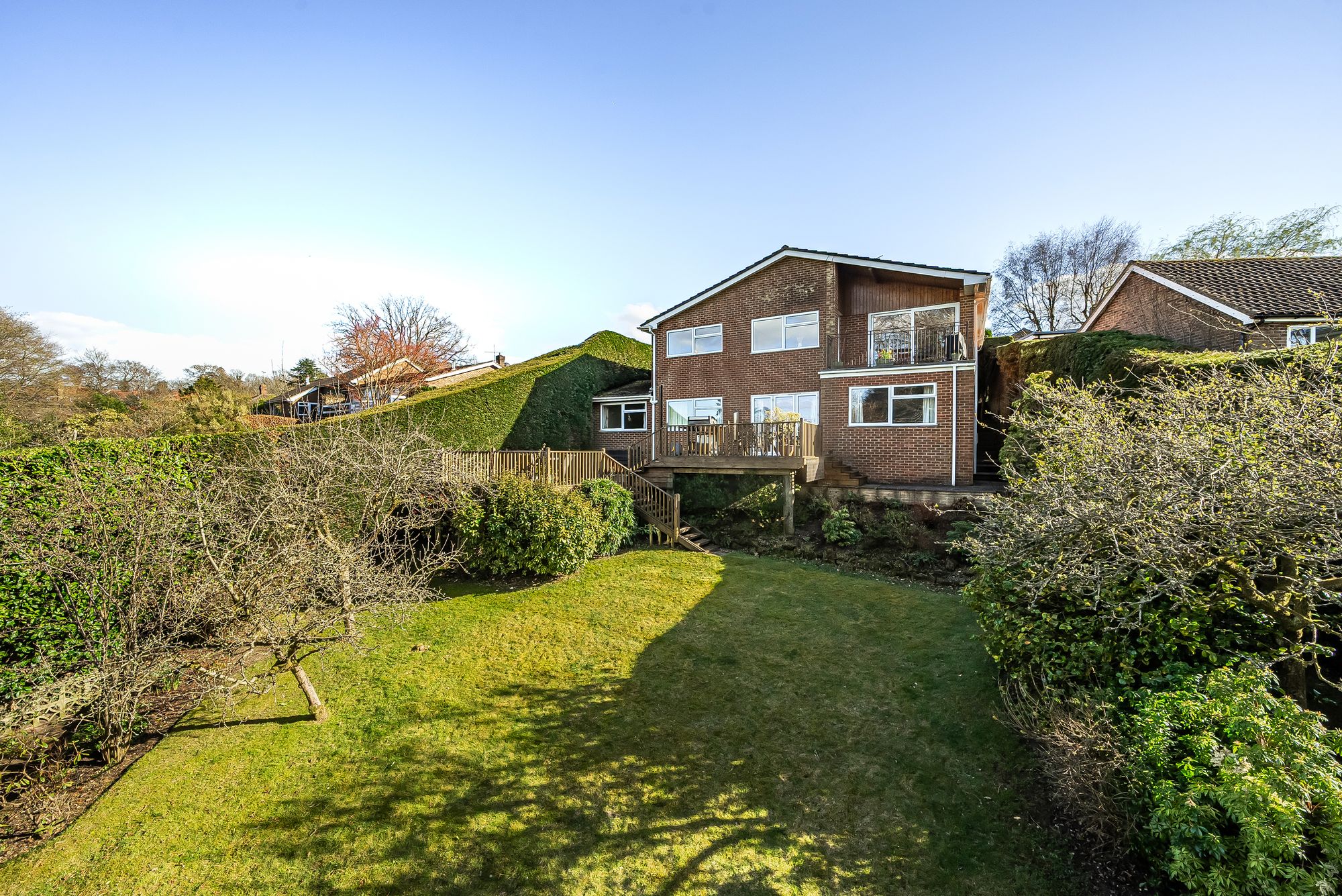 Presented in neutral tones throughout, the light-filled airy feel continues through the property. On entering, an expansive reception hall leads on to the dining area which enjoys stunning views across the mature tree-lined gardens with access to a raised balcony. Leading from the hall is a second reception room, currently used as a study by the owners, but with its useful fitted storage could easily be utilised as a fifth bedroom / guest room. A sitting room with wood burning stove enjoys a rear aspect, again, taking in the wonderful views with sliding patio doors lead out onto the raised balcony. The well-appointed kitchen also enjoys a rear aspect looking out onto the garden, from here there is small utility/larder space and back door. A useful coat cupboard and W/C complete the upper level accommodation.