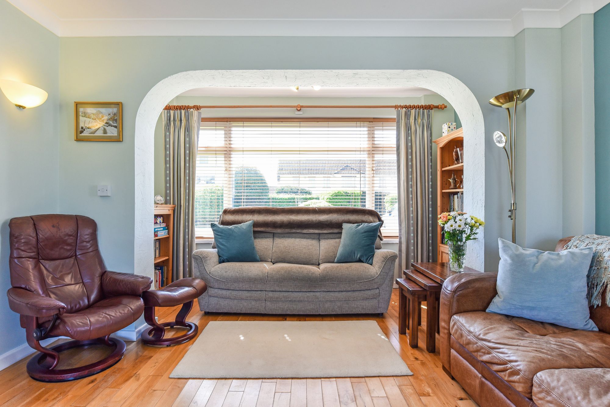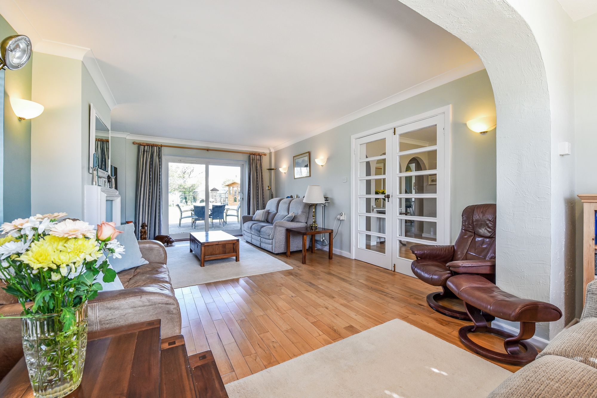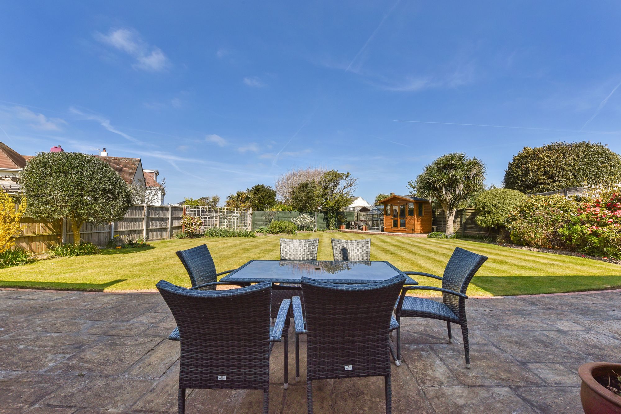 Outside, the enclosed front garden is mainly laid to lawn with mature hedges providing privacy. The driveway provides ample parking and leads to the attached garage with it’s up and over door at both ends for easy access. The rear garden also provides a good level of privacy and is mainly laid to lawn with two areas of patio, a greenhouse and summerhouse perfectly positioned to capture the sunsets in the evening.