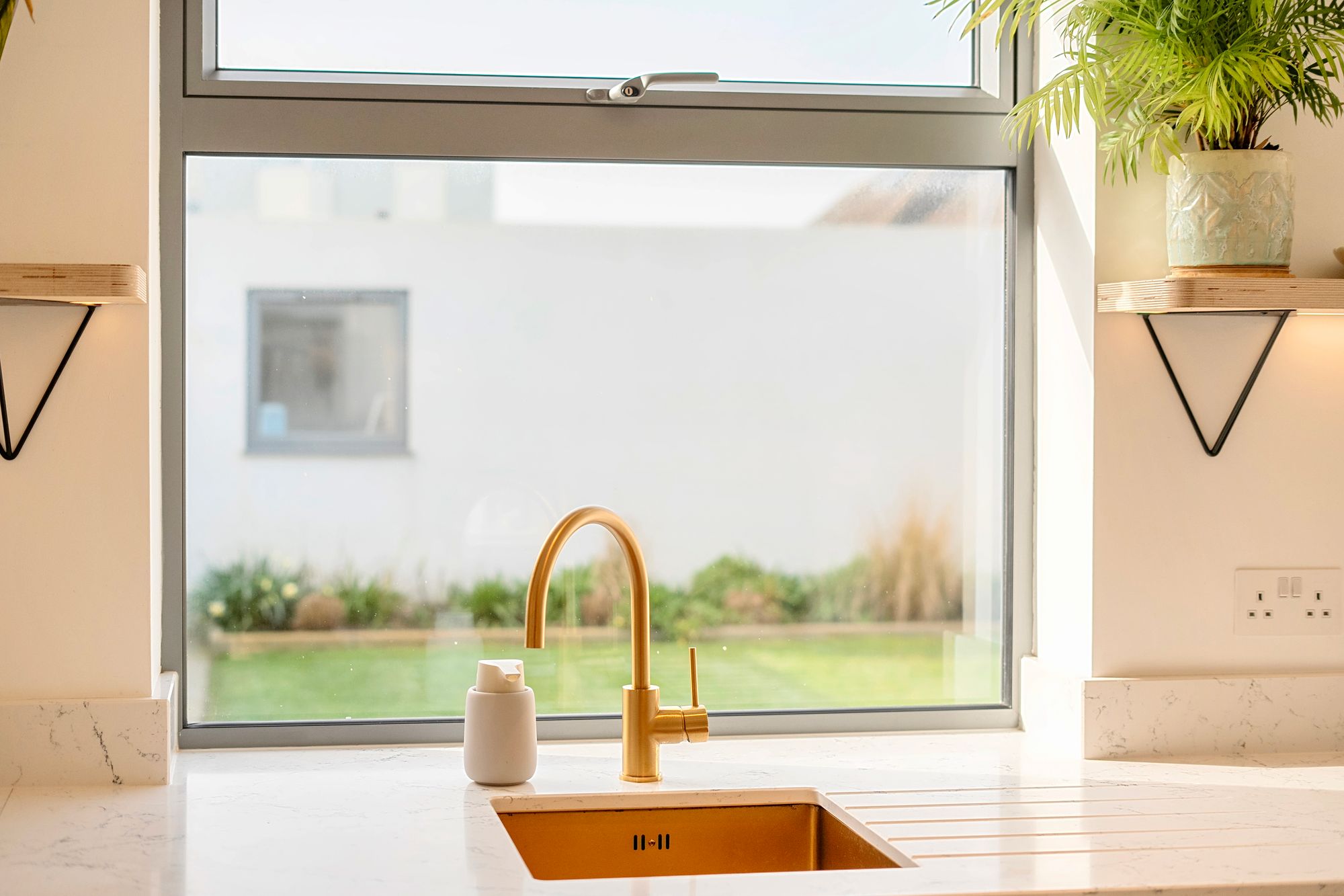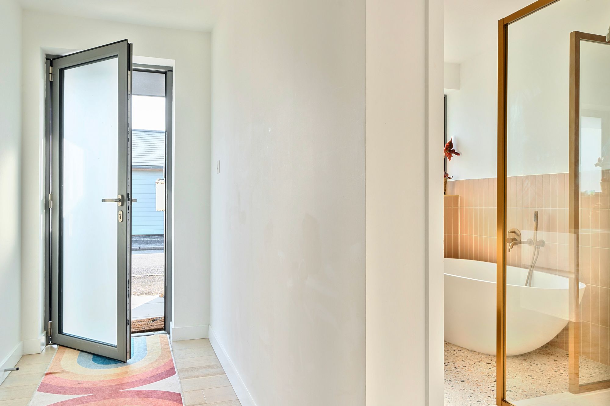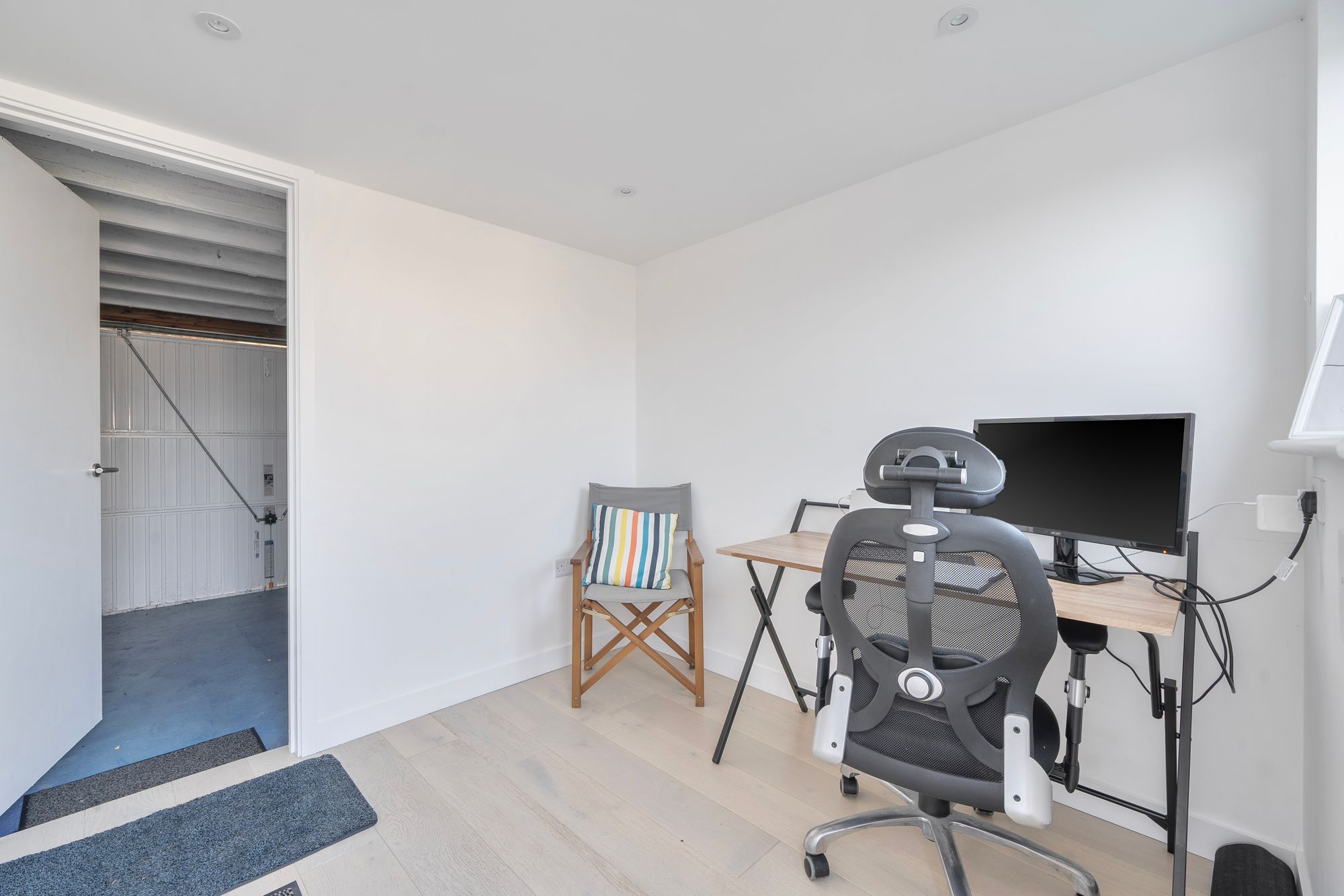 Outside, the walled rear garden is private and fully enclosed, mainly laid to lawn with a patio area and border planting. There is also a convenient warm outdoor shower to the side, ideal for rinsing off after a swim, surf or dog walk. The garage has been cleverly divided to create a useful home office with power and heating, again finished with engineered oak flooring, and a separate storage area for bikes or beach gear. The driveway offers ample parking as well as a practical EV charger and is neatly finished with contemporary planters, adding to the property’s smart kerb appeal.
