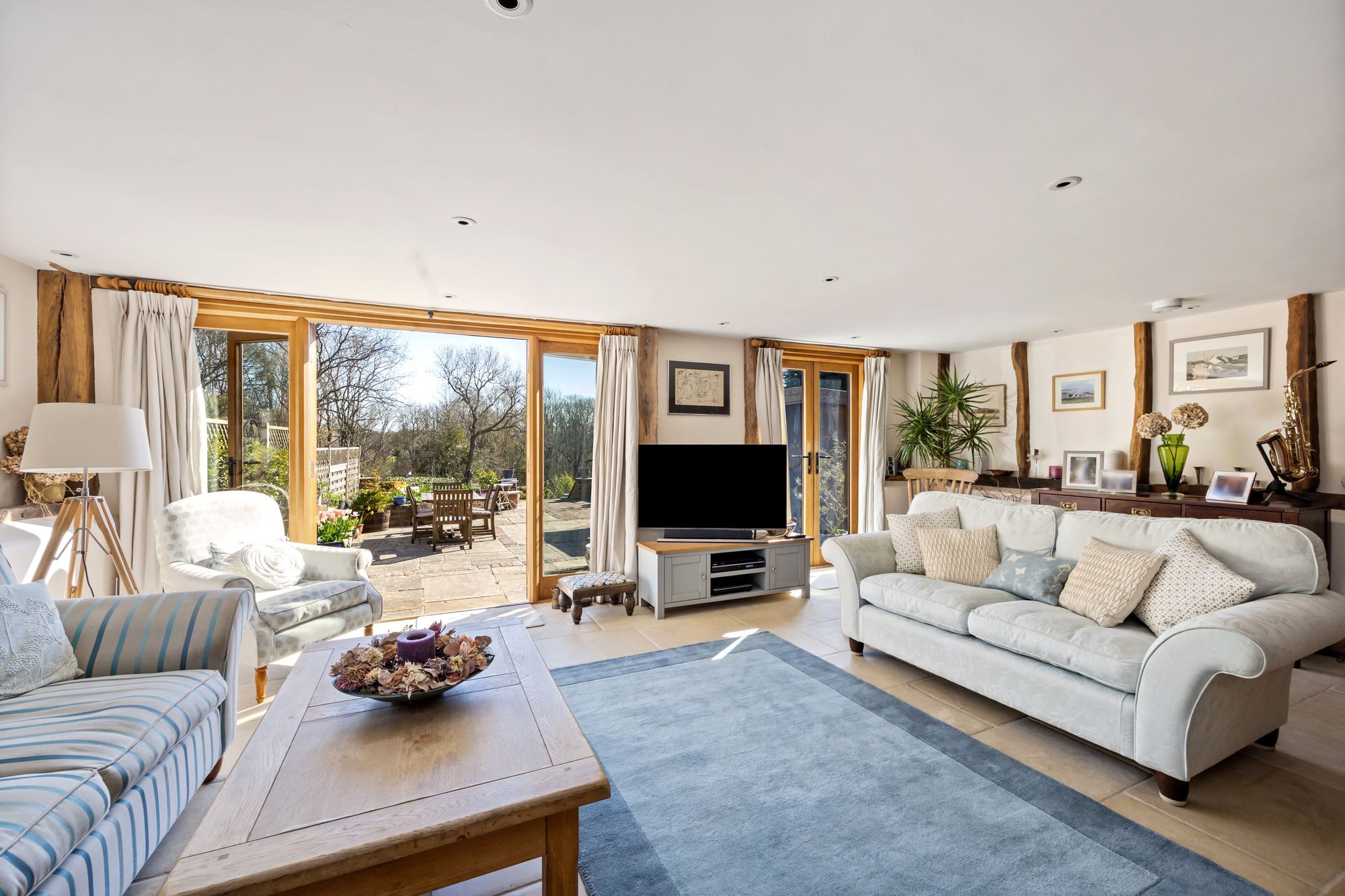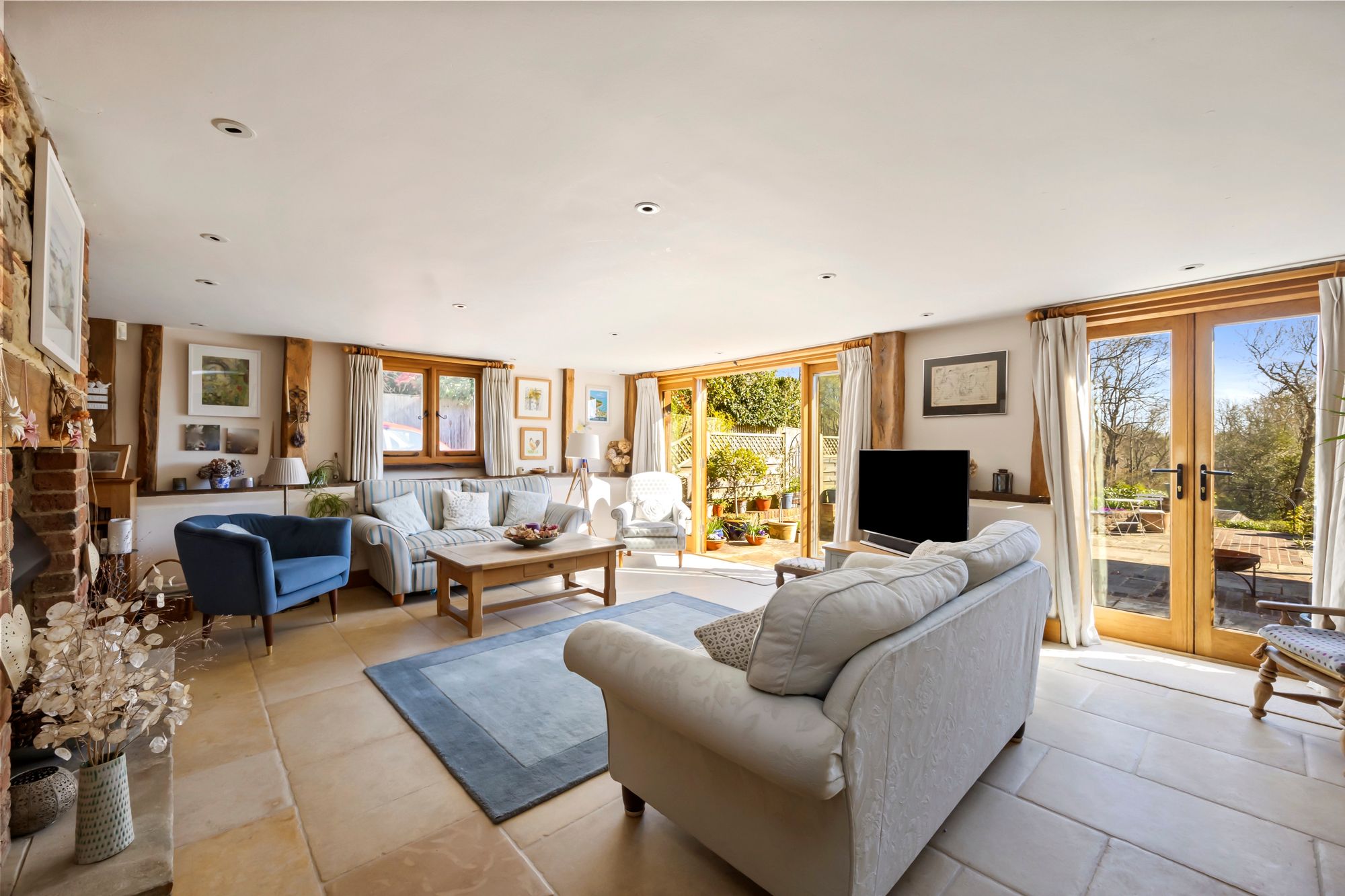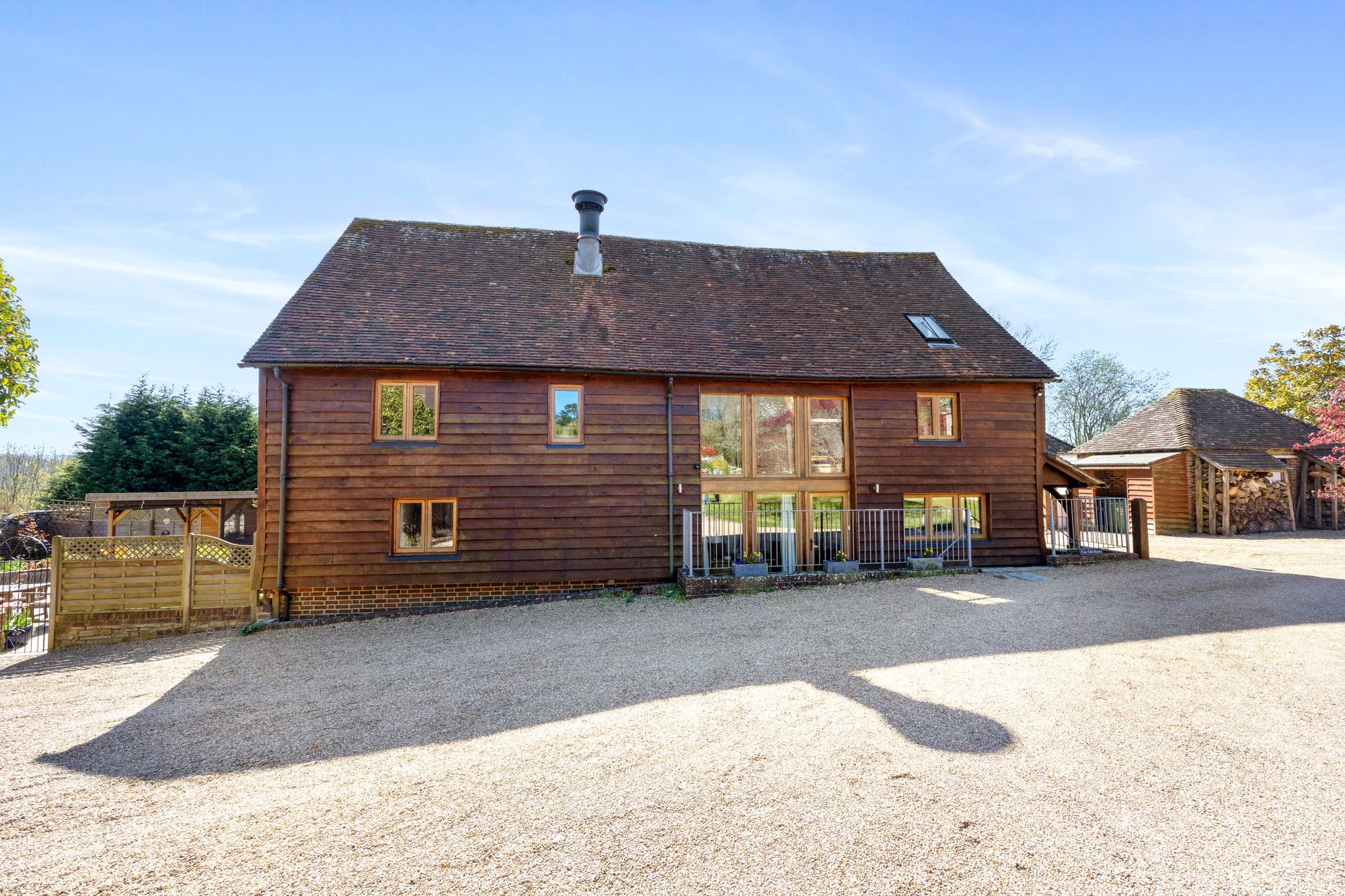 Situated in an idyllic location is this stunning four bedroom barn conversion. If you are looking for a peaceful retreat yet within 4 miles of Horsham this is the perfect location. The property itself offers as you would expect many characterful and charming qualities of a barn conversion such as a vaulted ceiling in the central living room. The whole of the downstairs has a beautiful limestone flooring with underfloor heating. The accommodation comprises a spacious open plan downstairs with kitchen presented to a classic high standard with bespoke oak fitted kitchen with space for a range cooker and a separate utility room with split barn style door leading outside and separate W.C, The dining area and living room are split by a central fireplace providing a wonderful ambient feature between the living room and dining area. The living room offers double doors opening out to the fantastic views from the back of the property. There is a gorgeous oak stair case leading up to the first floor leading to the principle bedroom at one end of the barn which again benefits from the views to the back and includes an ensuite bathroom room and vaulted ceiling. There is also a built in wardrobe. There are two further bedrooms on this floor from walking across the gallery landing providing lovely light accommodation and viewing to the ground floor. There is also the family bathroom. On the third floor is a further bedroom