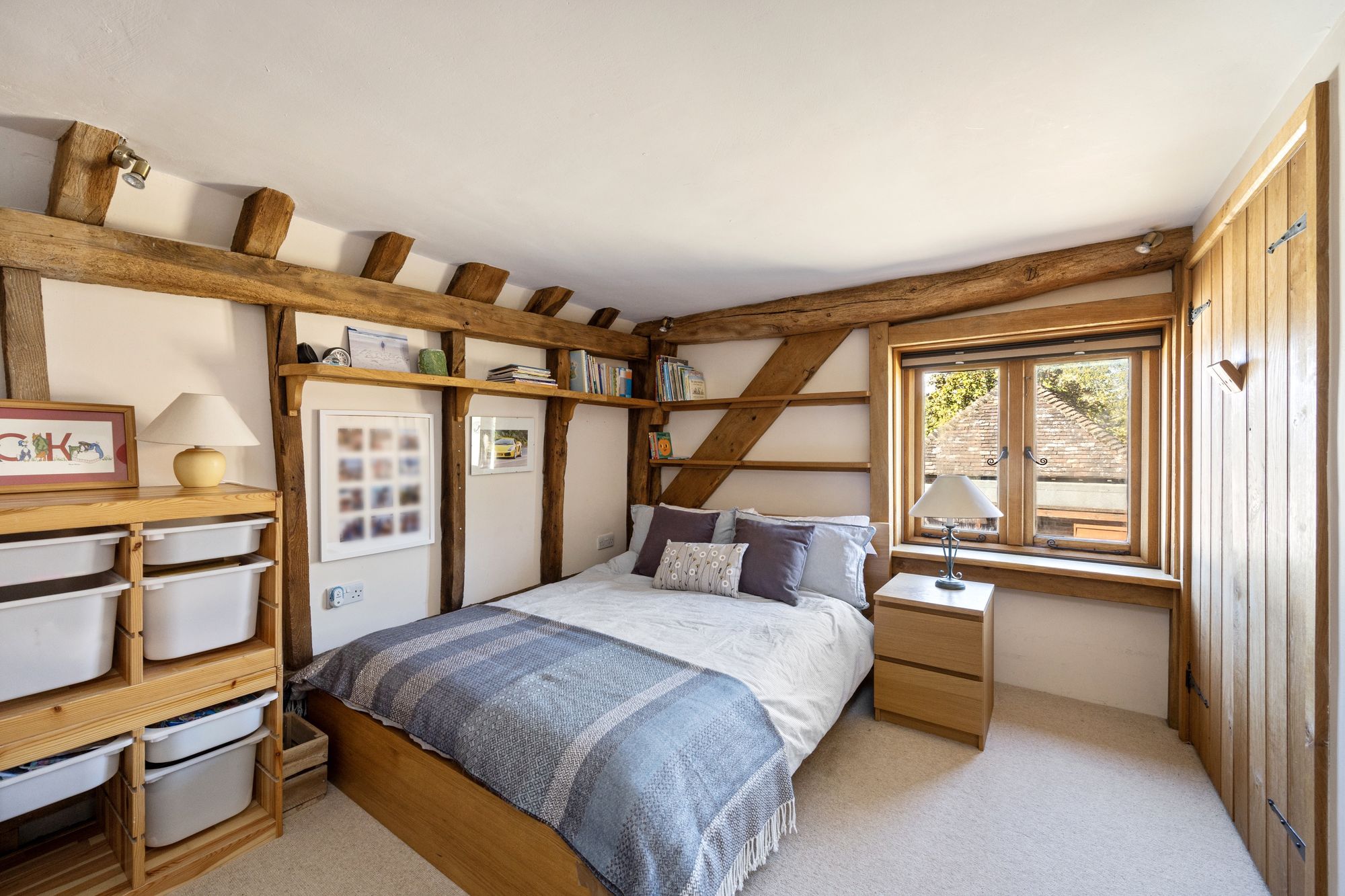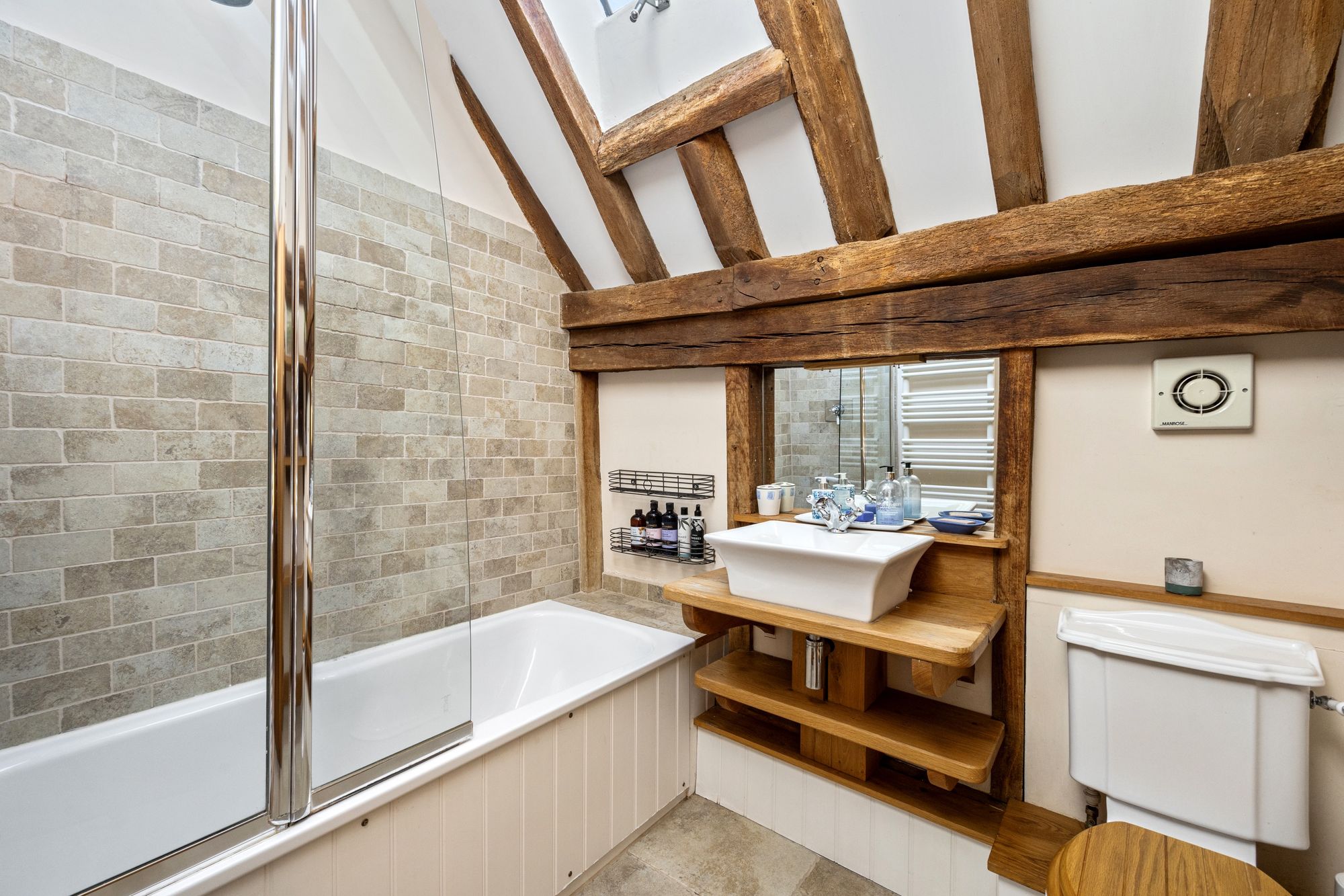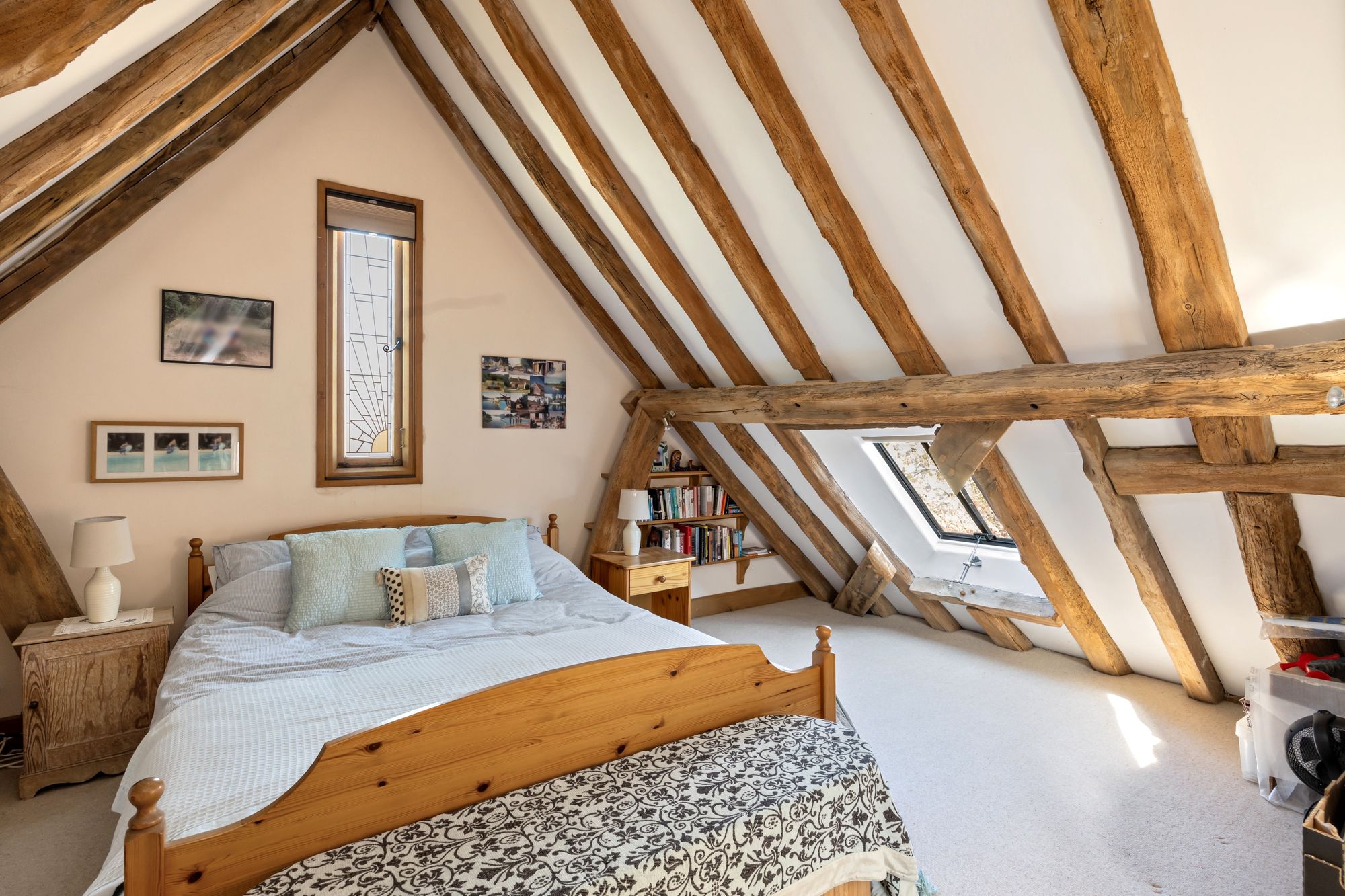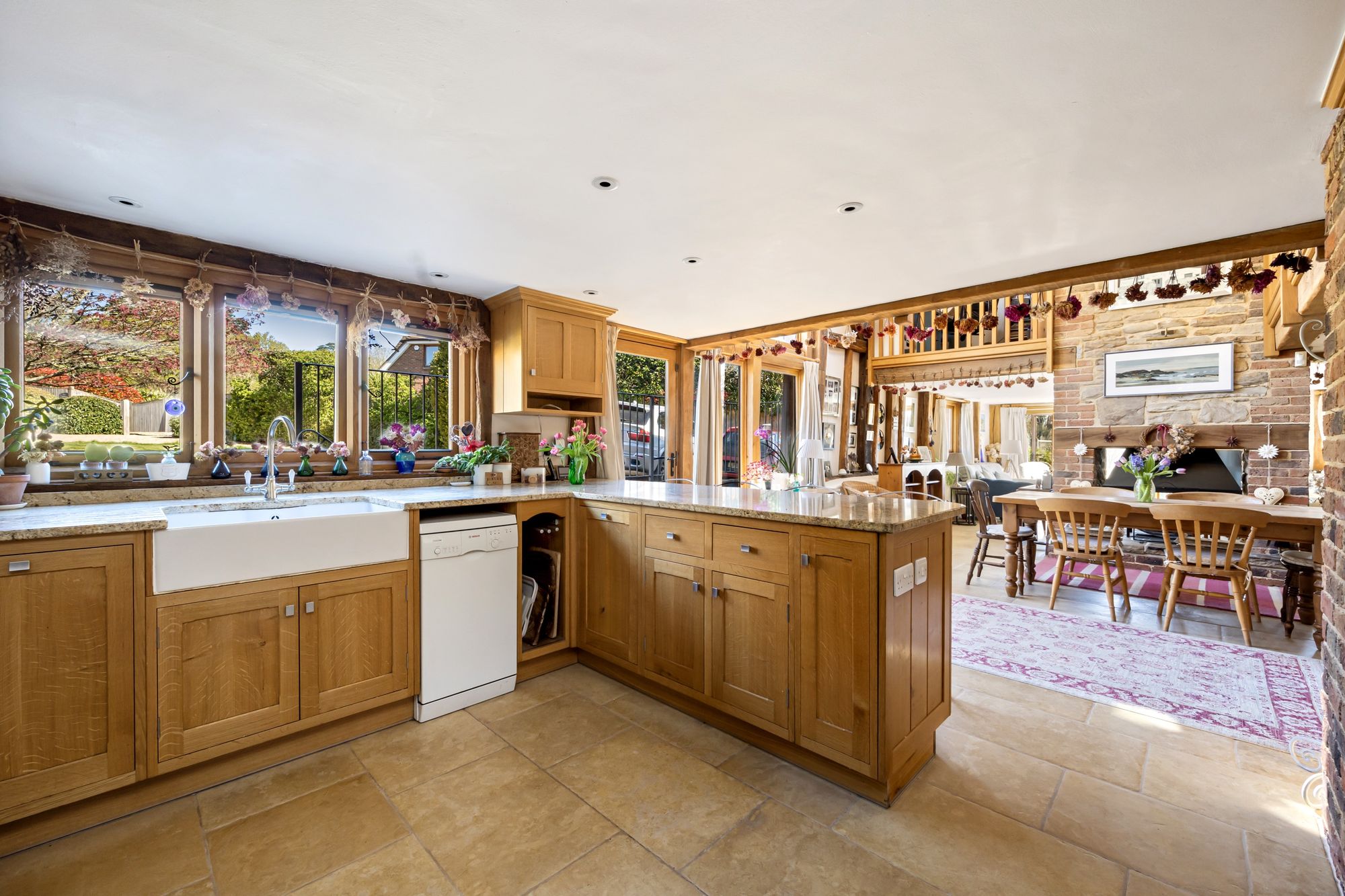 Situated in an idyllic location is this stunning four bedroom barn conversion. If you are looking for a peaceful retreat yet within 4 miles of Horsham this is the perfect location. The property itself offers as you would expect many characterful and charming qualities of a barn conversion such as a vaulted ceiling in the central living room. The whole of the downstairs has a beautiful limestone flooring with underfloor heating. The accommodation comprises a spacious open plan downstairs with kitchen presented to a classic high standard with bespoke oak fitted kitchen with space for a range cooker and a separate utility room with split barn style door leading outside and separate W.C, The dining area and living room are split by a central fireplace providing a wonderful ambient feature between the living room and dining area. The living room offers double doors opening out to the fantastic views from the back of the property. There is a gorgeous oak stair case leading up to the first floor leading to the principle bedroom at one end of the barn which again benefits from the views to the back and includes an ensuite bathroom room and vaulted ceiling. There is also a built in wardrobe. There are two further bedrooms on this floor from walking across the gallery landing providing lovely light accommodation and viewing to the ground floor. There is also the family bathroom. On the third floor is a further bedroom