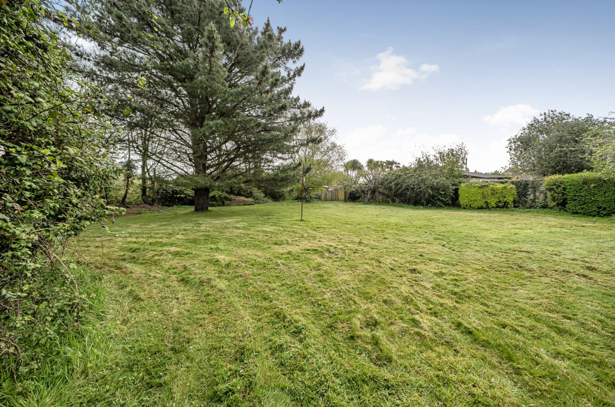 The rear garden is a standout feature, offering expansive lawns and a variety of mature trees, creating a delightful outdoor setting.
