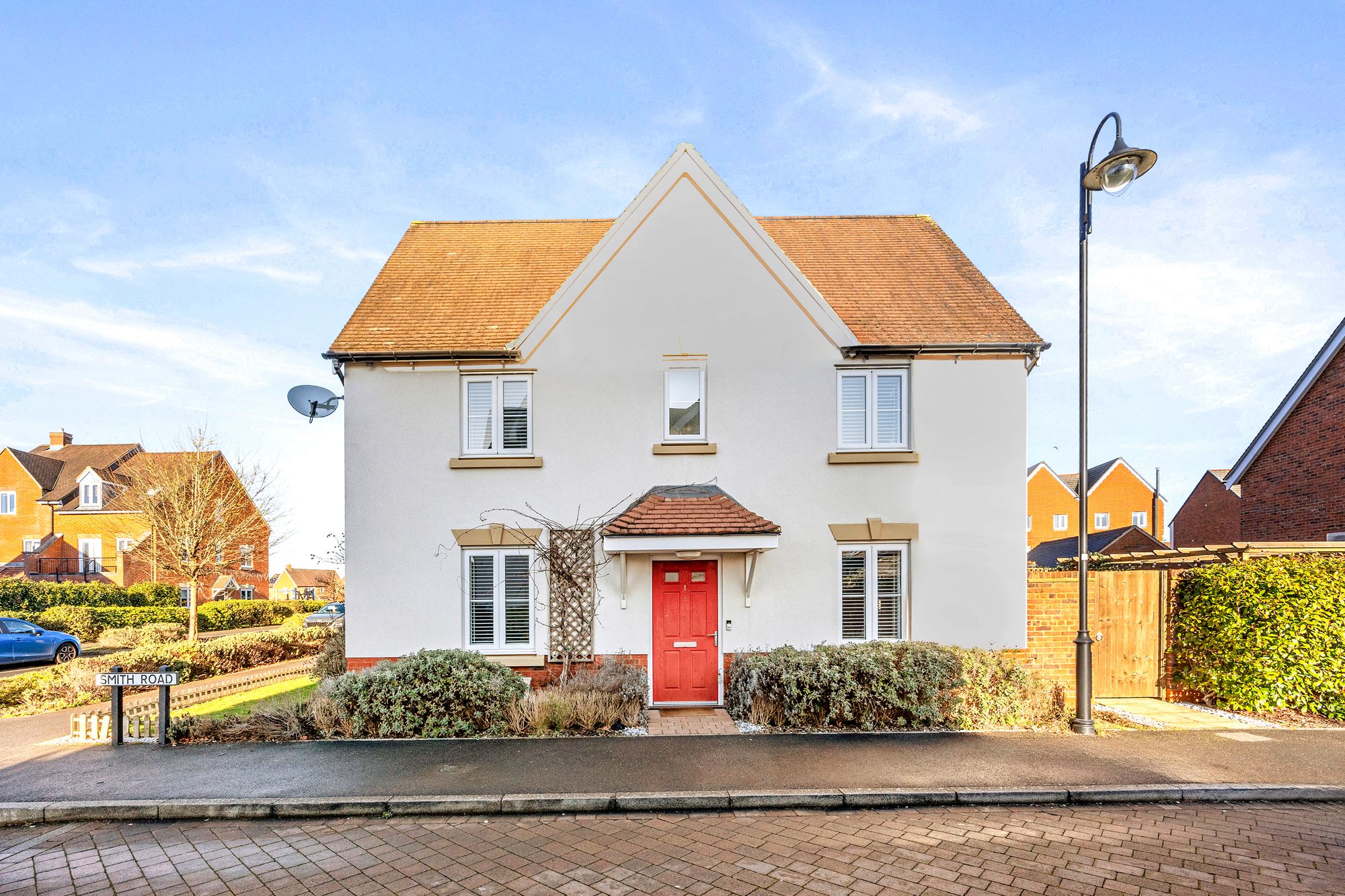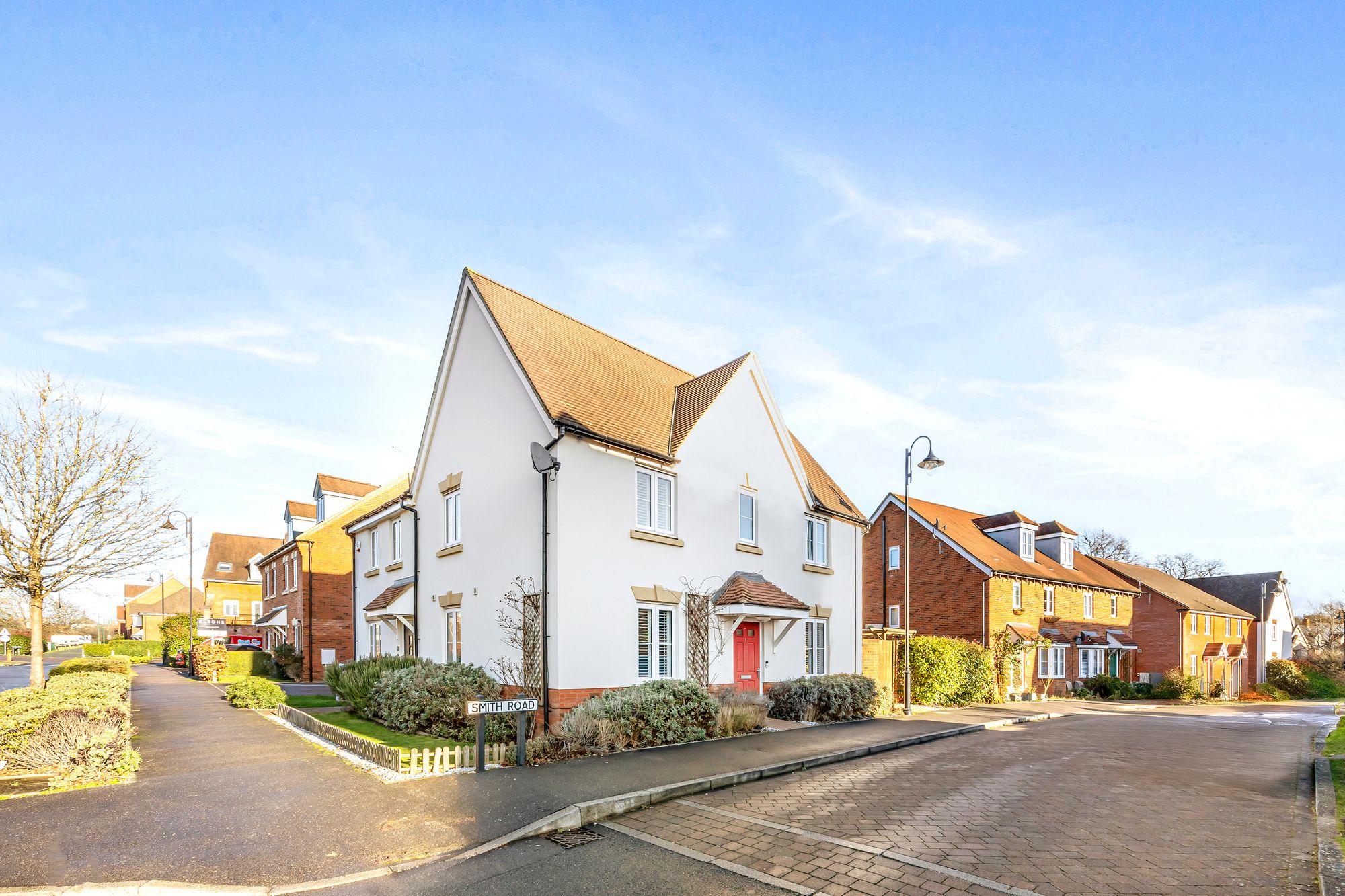 The front garden is landscaped with a selection of shrubs and borders with a path leading to the front door.