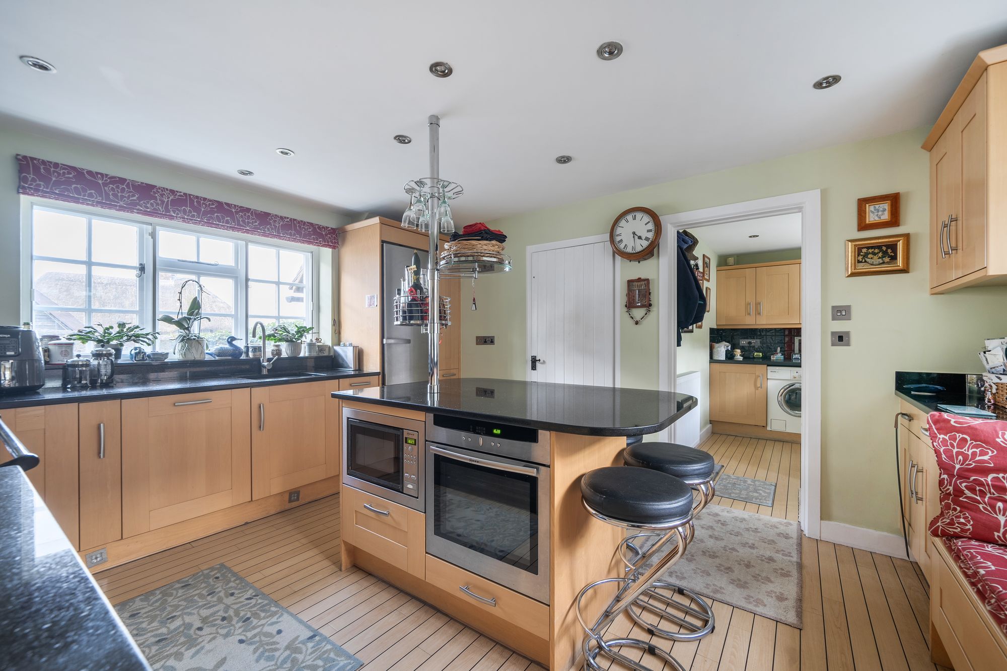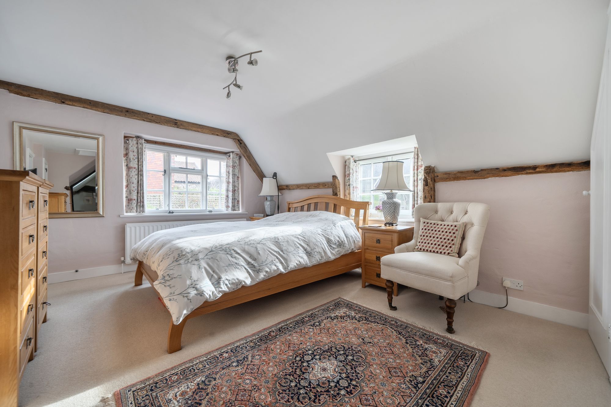 The welcoming sitting room features a wood burner set within an impressive inglenook fireplace, complemented by solid wood flooring crafted by the Sussex Wood Company and French doors that fill the space with natural light whilst accessing the rear garden. The double aspect dining room, boasting its own feature fireplace, provides an inviting setting for family meals or entertaining guests. The well-appointed kitchen is equipped with an electric AGA, a separate oven and hob, solid granite work surfaces, a central island and ample storage catering to the needs of keen cooks and busy households alike. A flexible ground floor bedroom, which can also serve as an additional reception space which benefits from a charming mezzanine level above, ideal for a study area or reading library. Further ground floor accommodation includes a cloakroom, a dedicated study, and a utility room with stable door access to the garden.