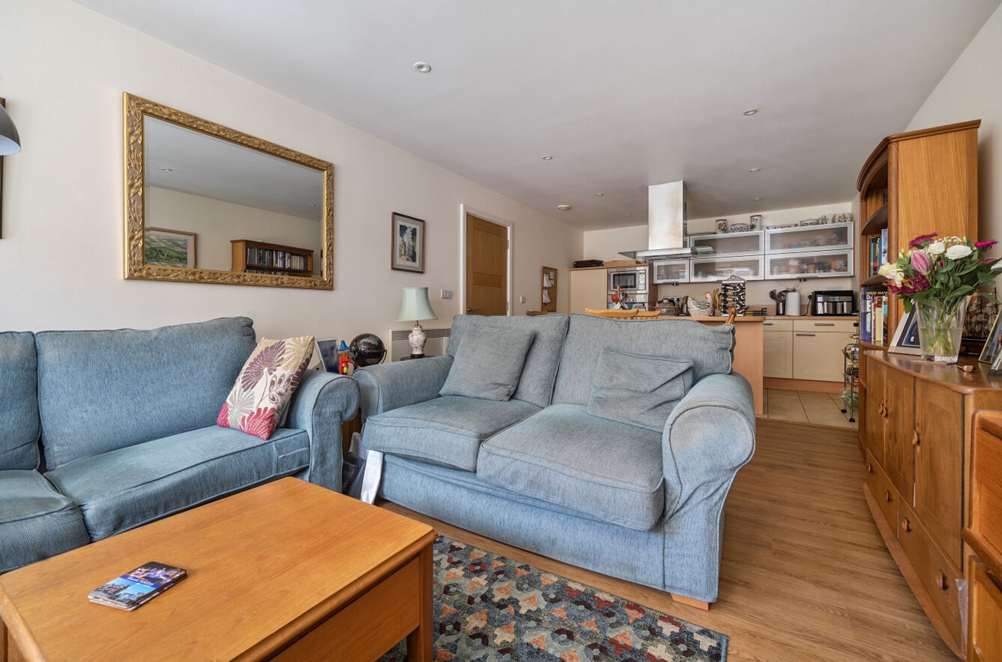 The open-plan living area flows seamlessly into a fitted kitchen with integrated appliances, while two generous double bedrooms, both with fitted wardrobes, include a principal suite with en-suite shower room. A sleek bathroom/WC completes the interior.