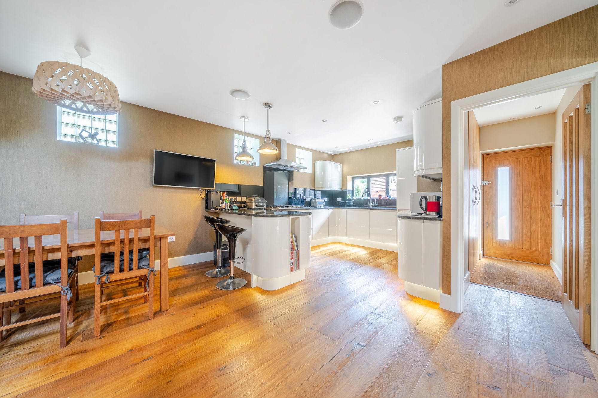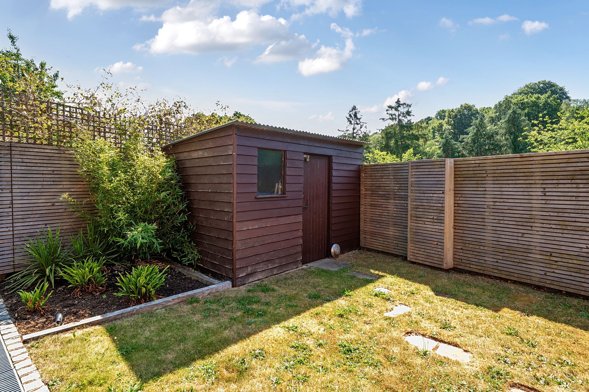 Outside the courtyard style paved garden to the rear is low maintenance enclosed by panel fencing with built-in wrap round covered seating areas.