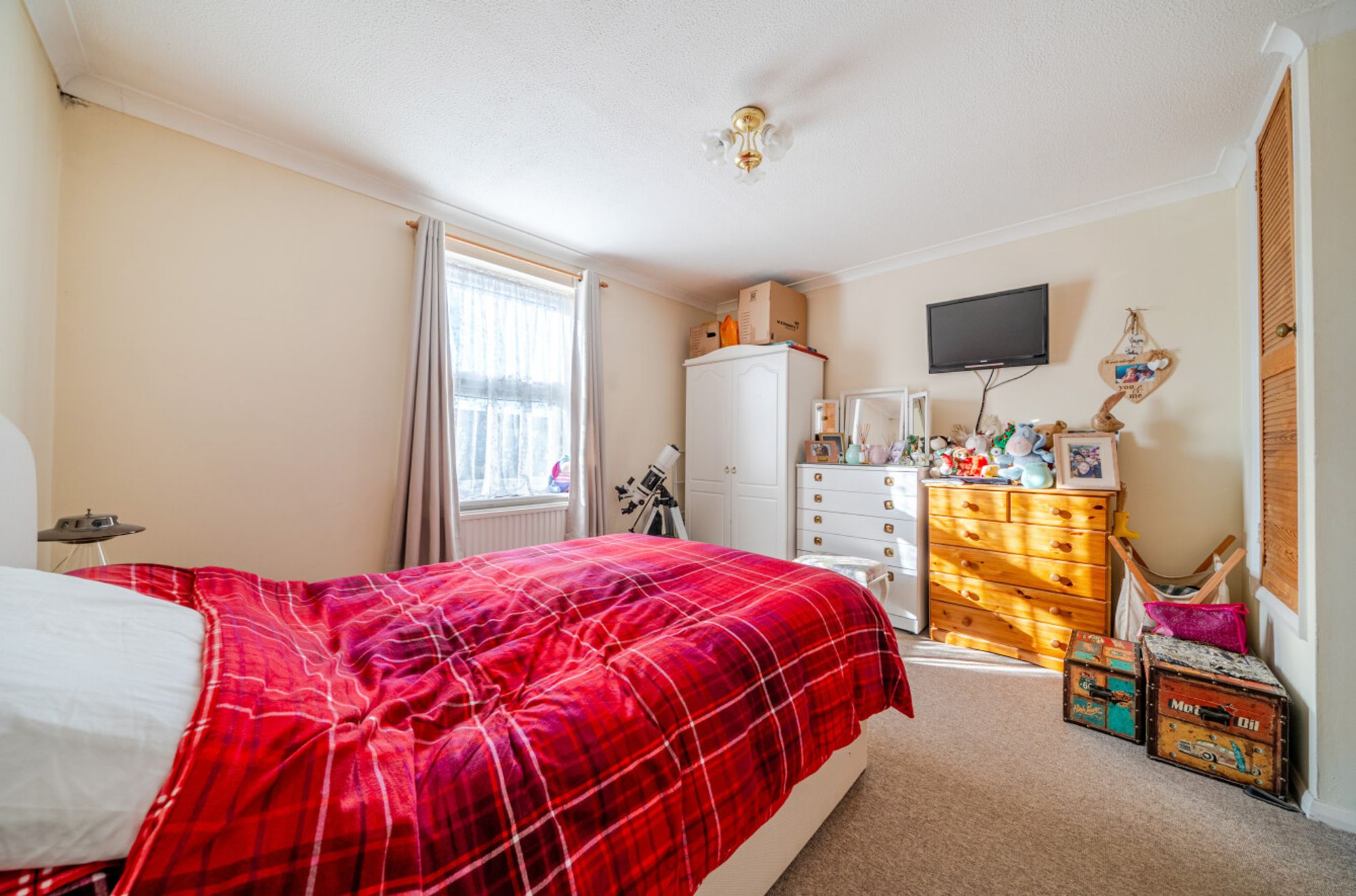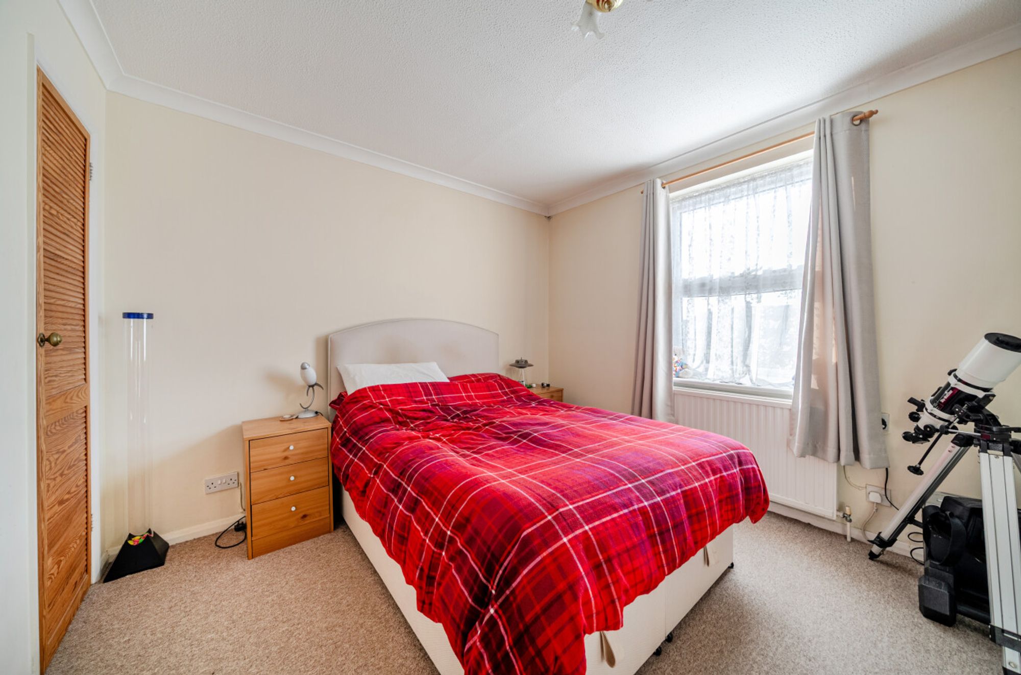 Upstairs, the generous double bedroom benefits from built-in storage, ensuring a clutter-free environment, while the modern bathroom is fitted with a white suite and offers both functionality and comfort.