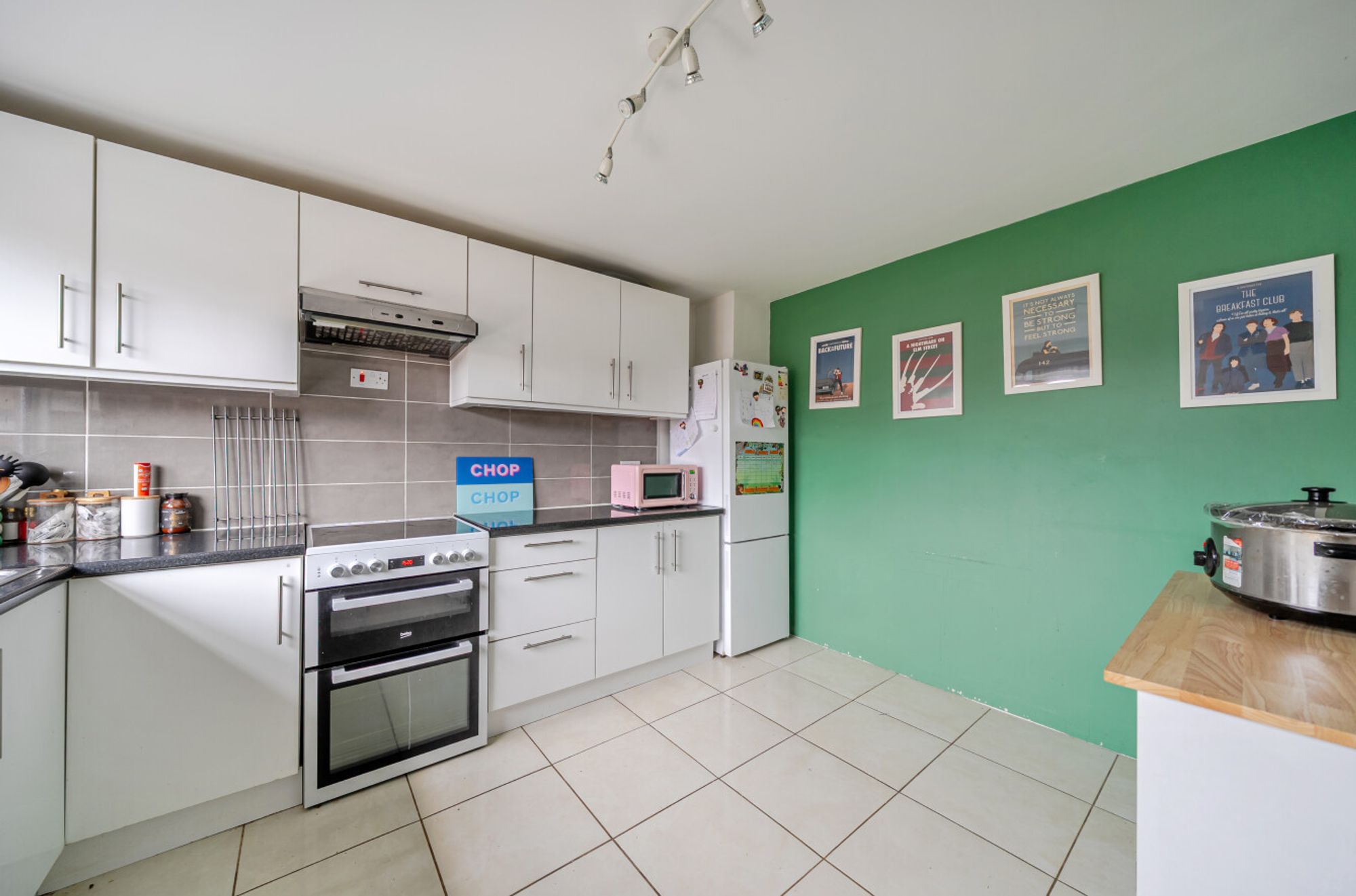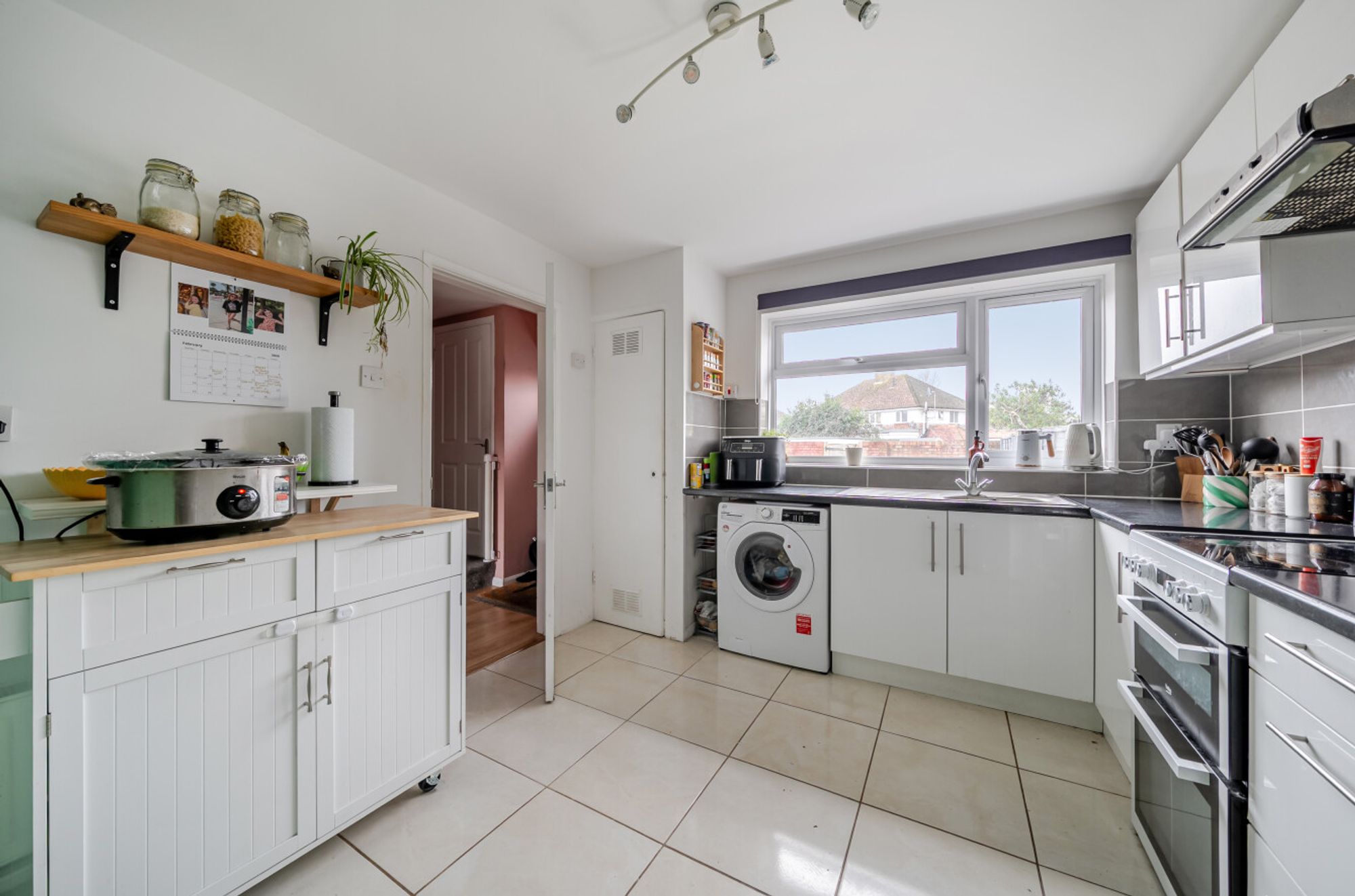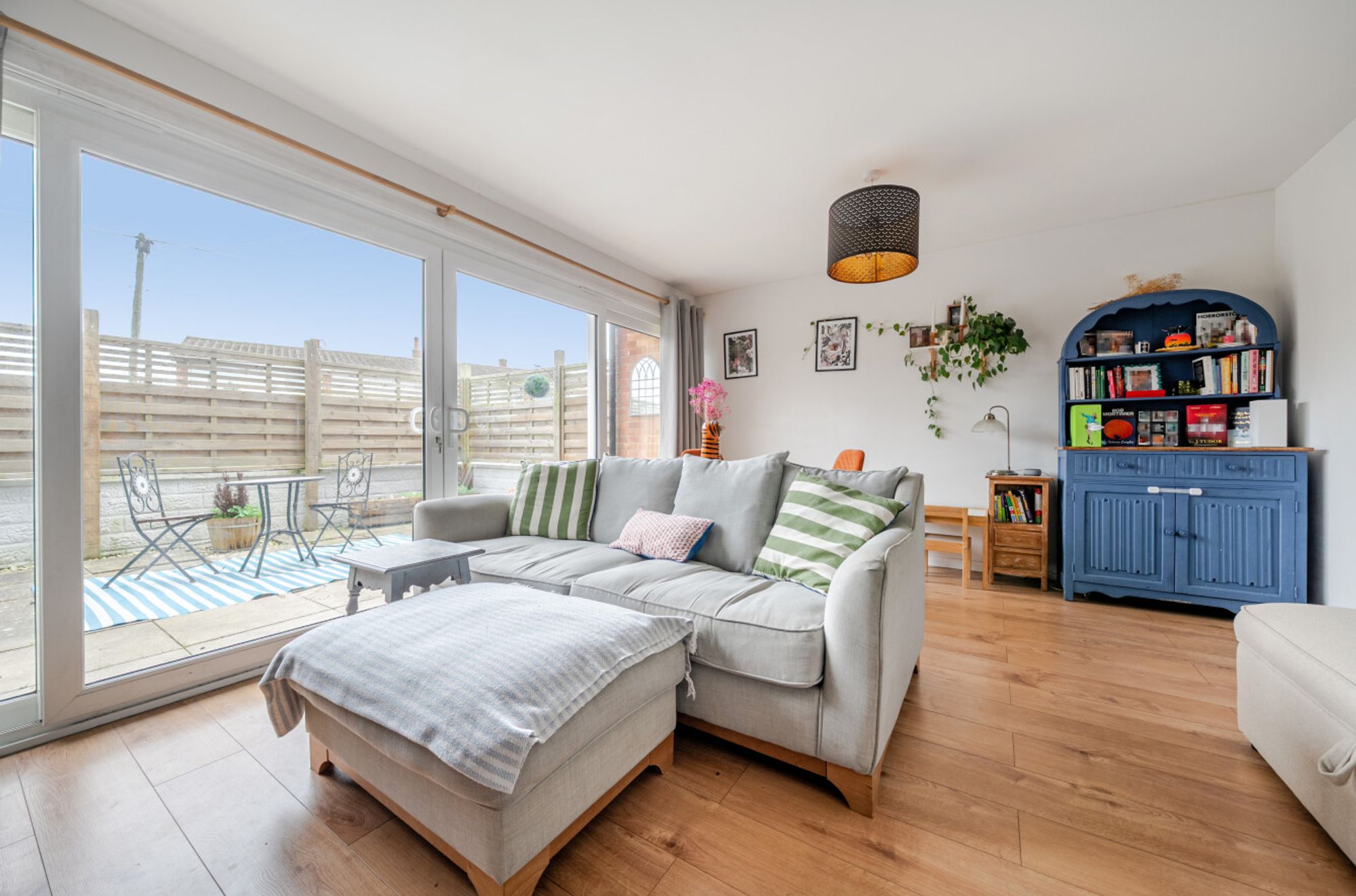 The accommodation comprises an entrance hall leading to a light and spacious sitting room, featuring wide patio doors that open onto a private courtyard garden at the front of the property. The modern kitchen is fitted with high-gloss white fronted units, providing a clean and contemporary finish.