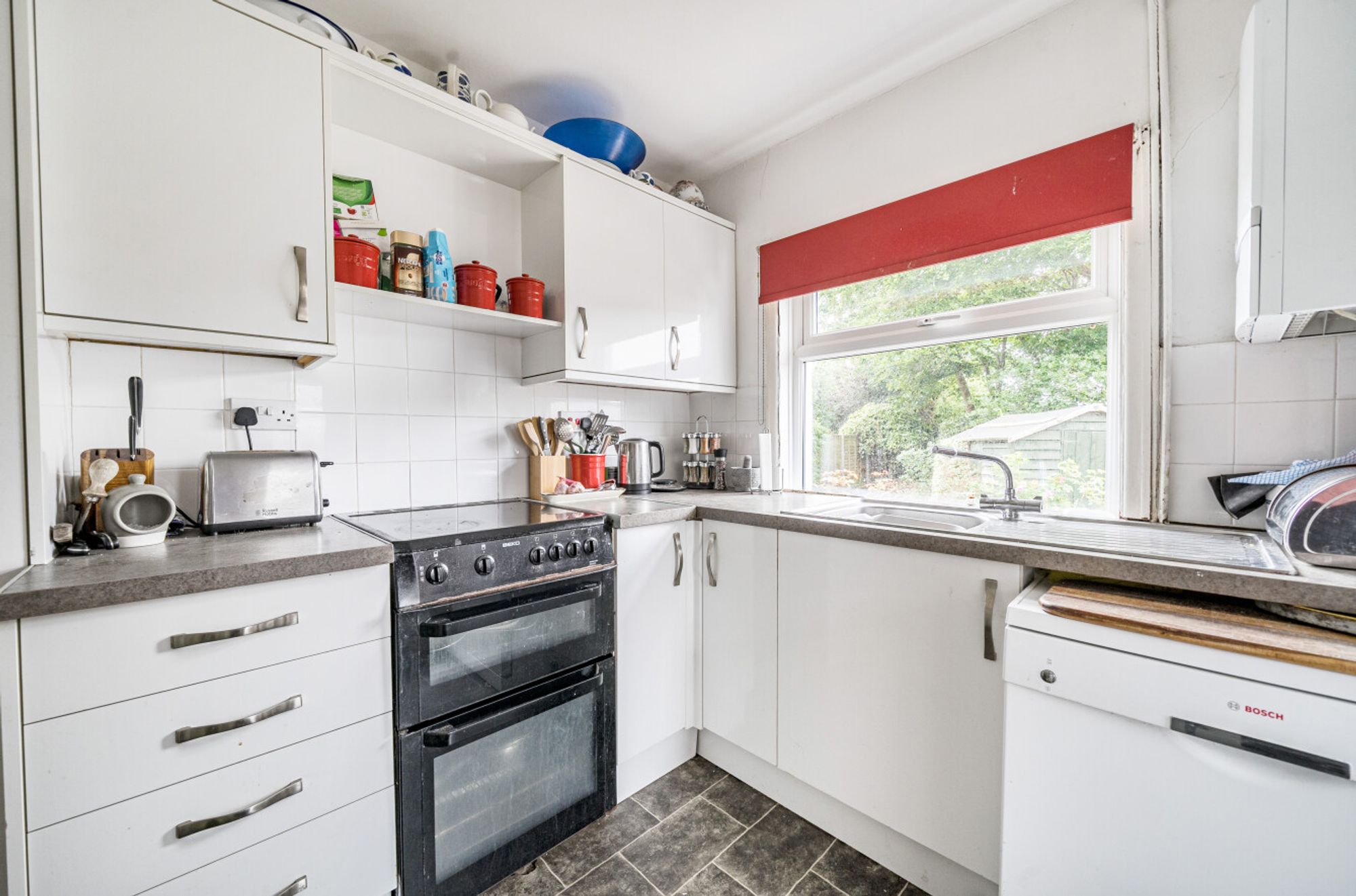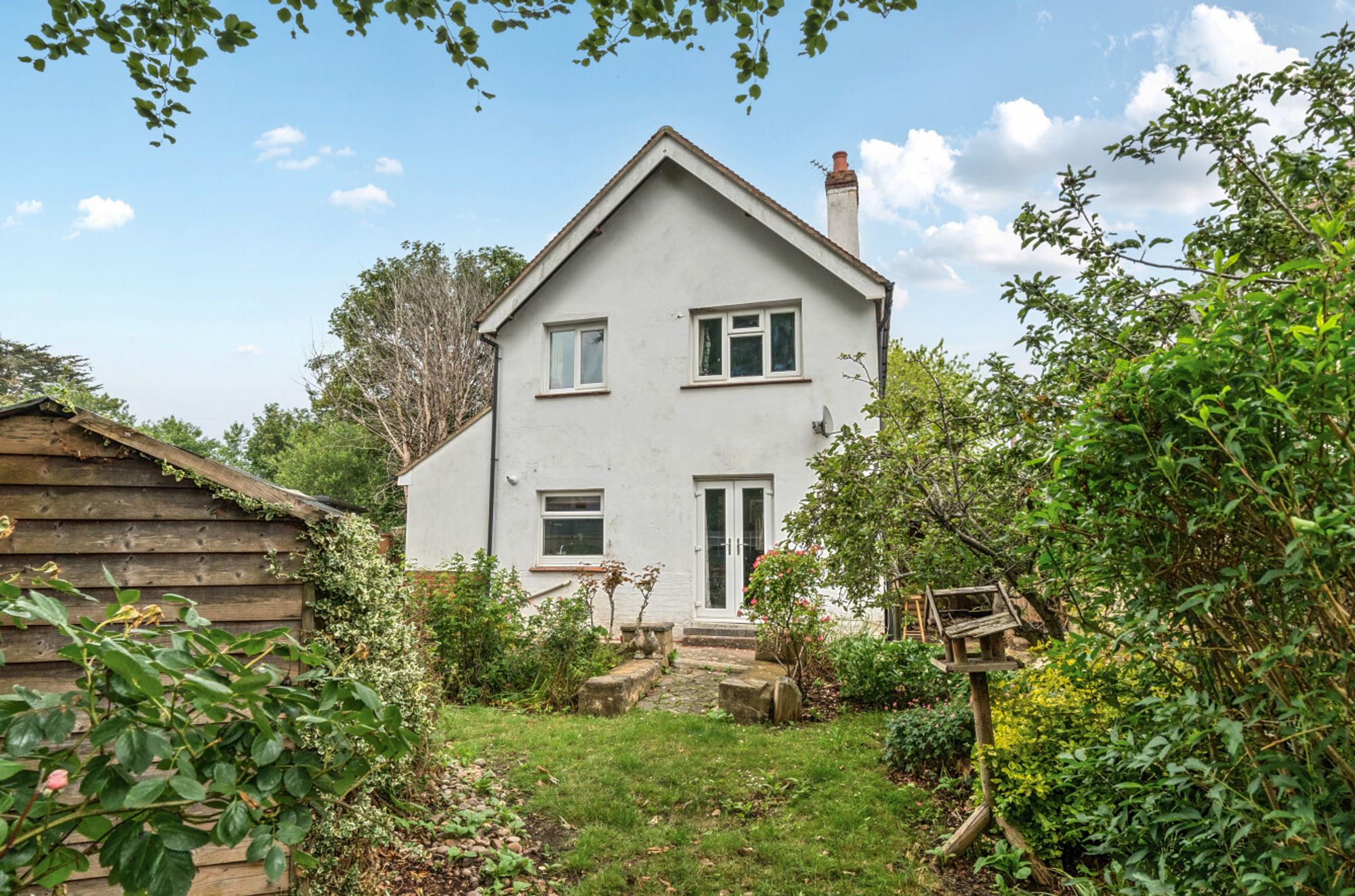 Externally, the property has a long rear garden planted with mature shrubs and roses, creating a pleasant and private outdoor space. There is also a wide patio area to the side of the house, perfect for outdoor seating or entertaining, as well as a timber workshop providing useful storage.