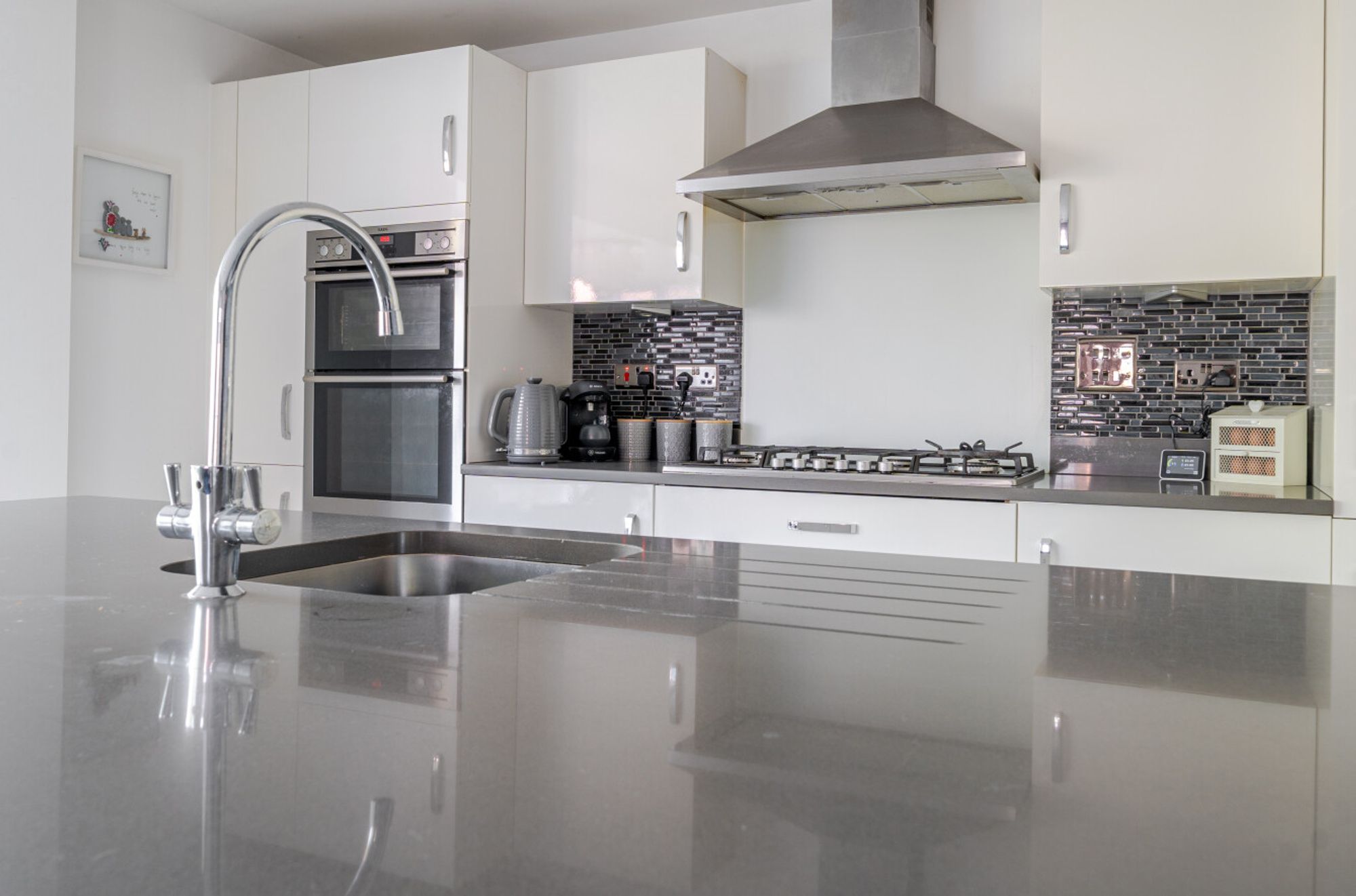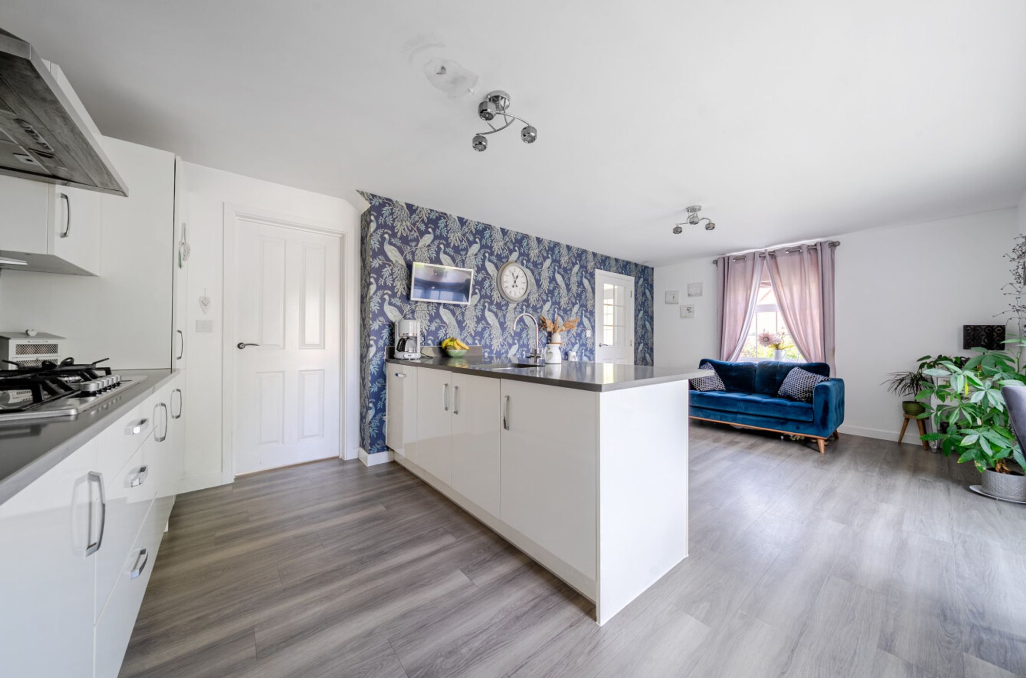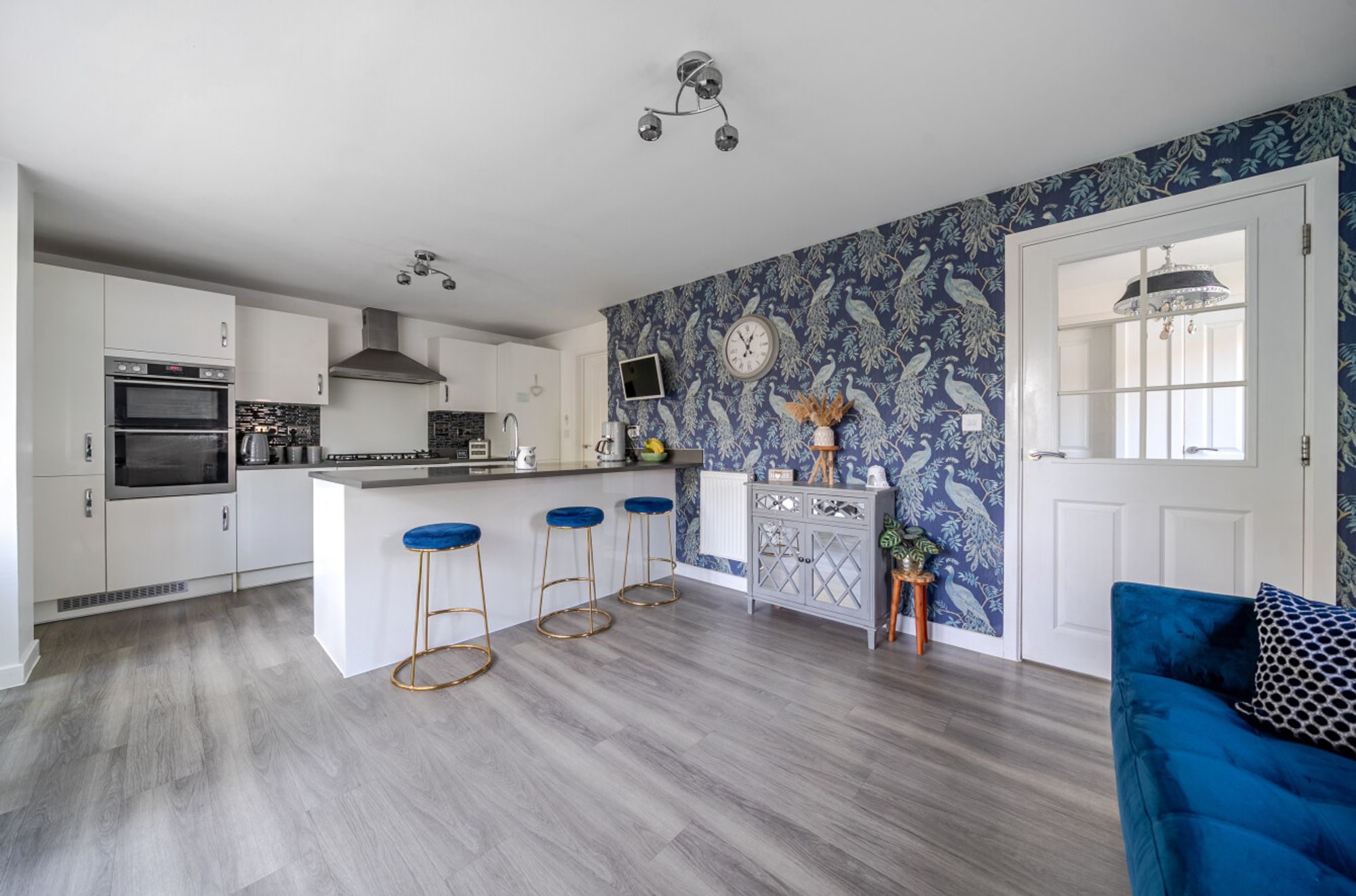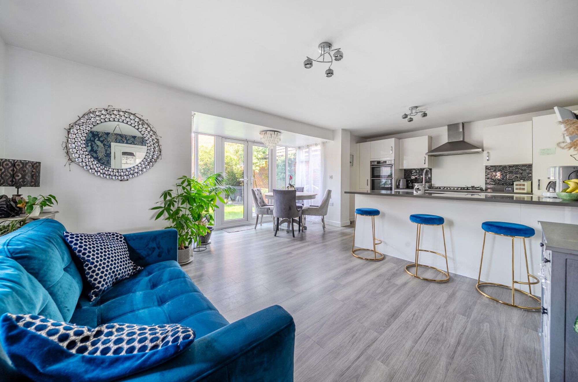 Upon entering the house, you will be greeted by a generous entrance hall with cloakroom. The spacious southerly sitting room with bay window is found to the right hand side, whilst a modern kitchen/dining room is to the left and opens out onto the rear garden. The kitchen is fully equipped with a number of integrated appliances, including a stove, oven and dishwasher, making it a perfect space for cooking and entertaining. There is also a utility room just off of the kitchen with plumbing for a washing machine and a side door leading out to the driveway.