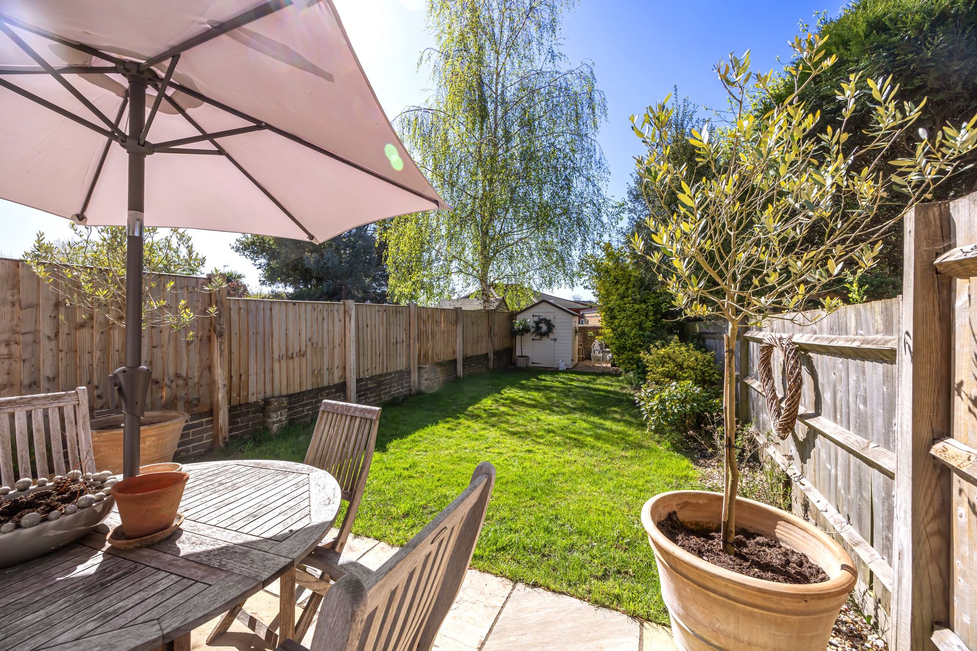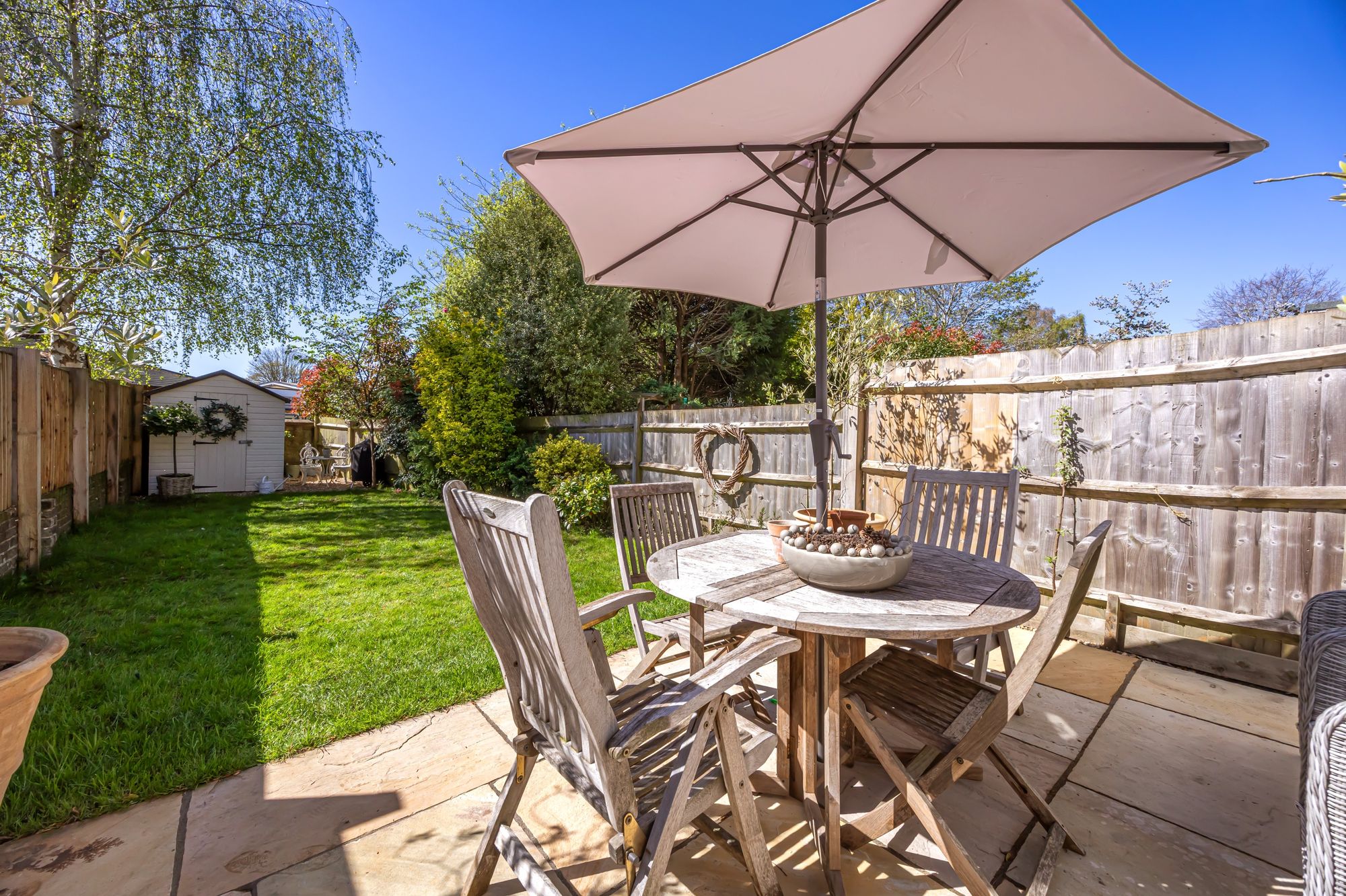 A hardstanding block paved driveway provide an off-street parking space to the front of the property. The rear garden is mainly laid to lawn and has a selection of borderers and beds with mature shrubs and planting, there is a patio terrace area ideal for alfresco dining within the summer months and a timber storage shed.
