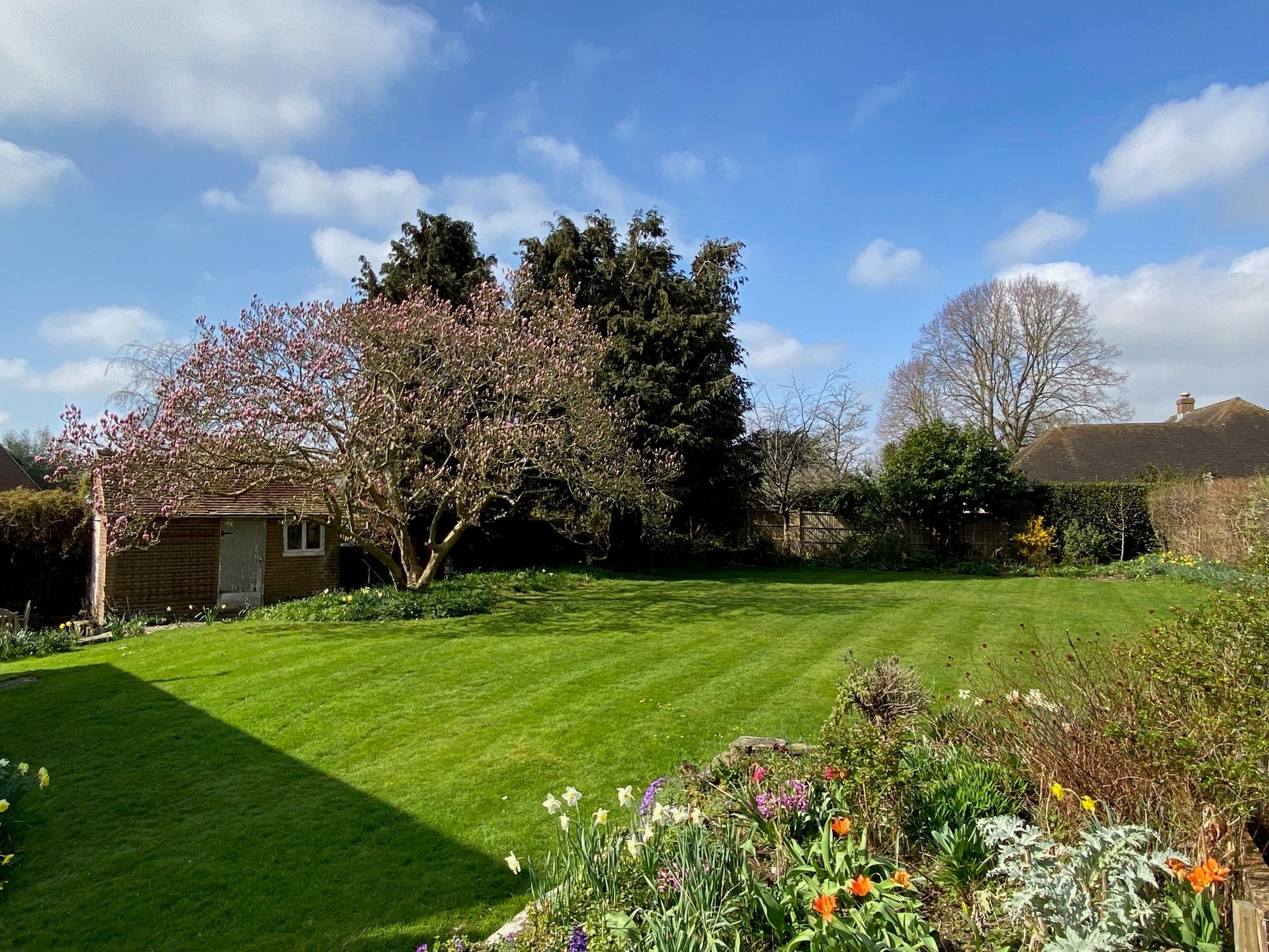 The garden is attractively landscaped with abundantly stocked borders and extensive lawns. It includes a heated outdoor swimming pool and decked area with a Mediterranean style bar. A sweeping driveway leads to large double garage and workshop/store, and two large parking areas. No onward chain.