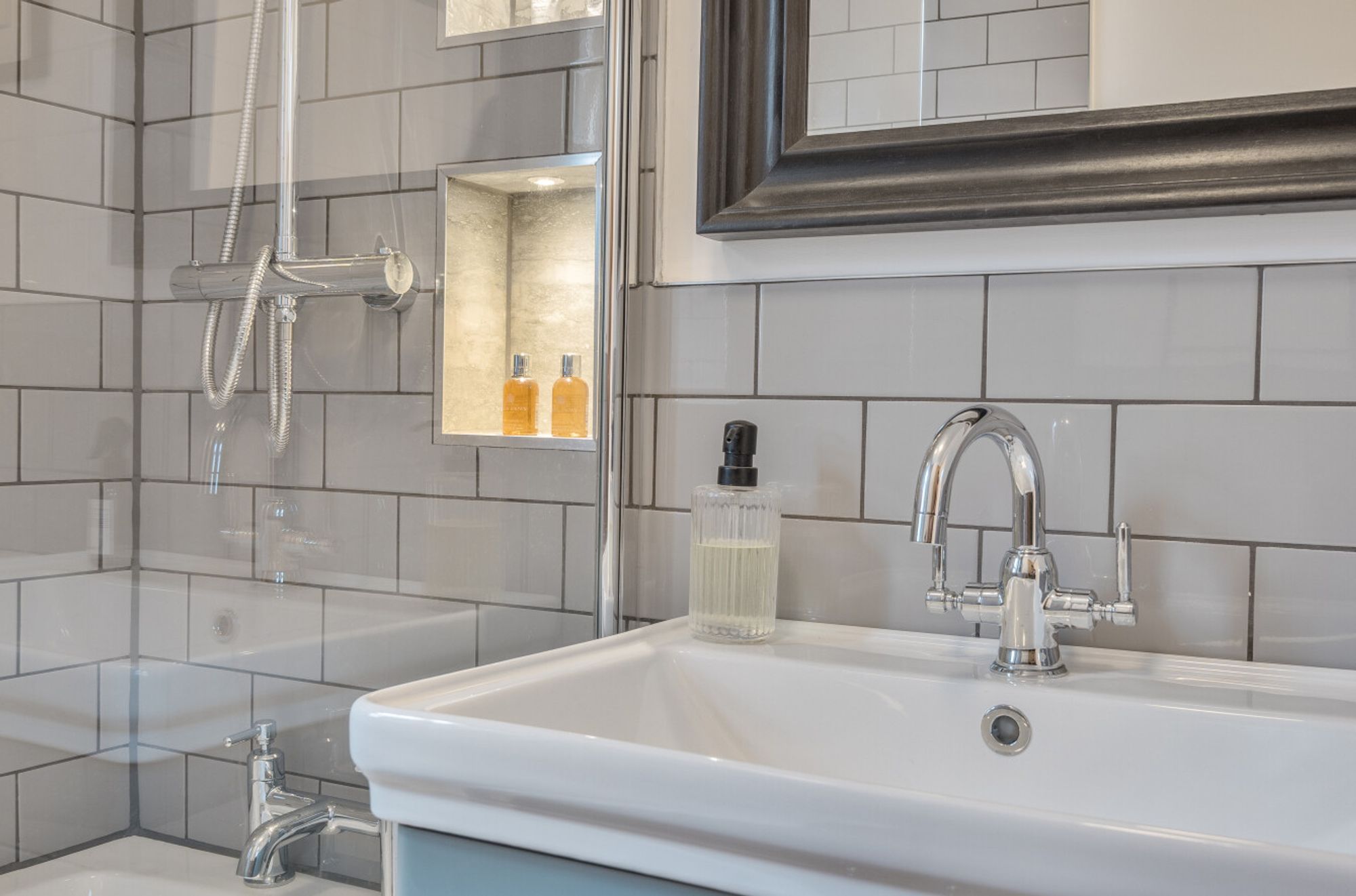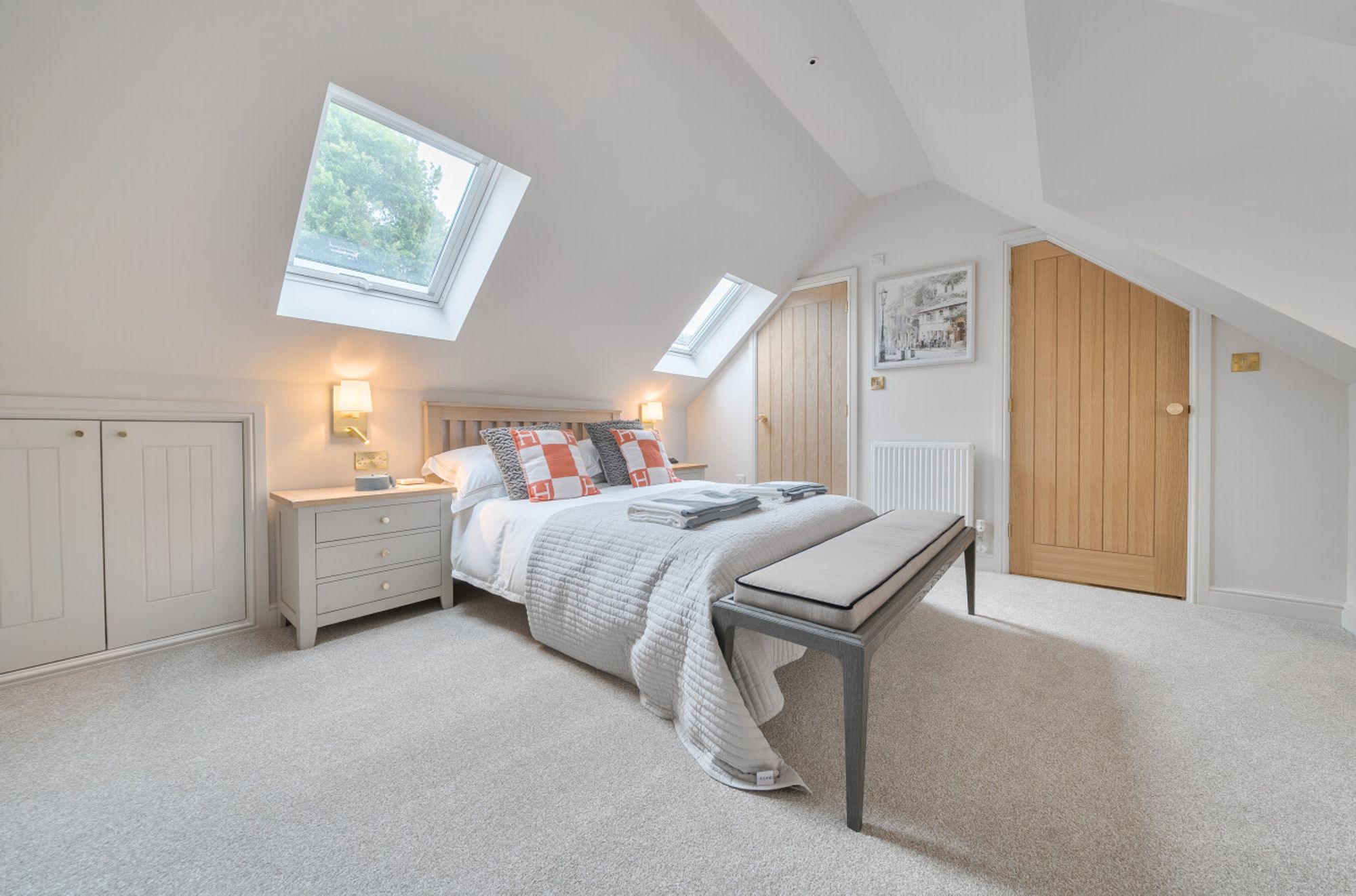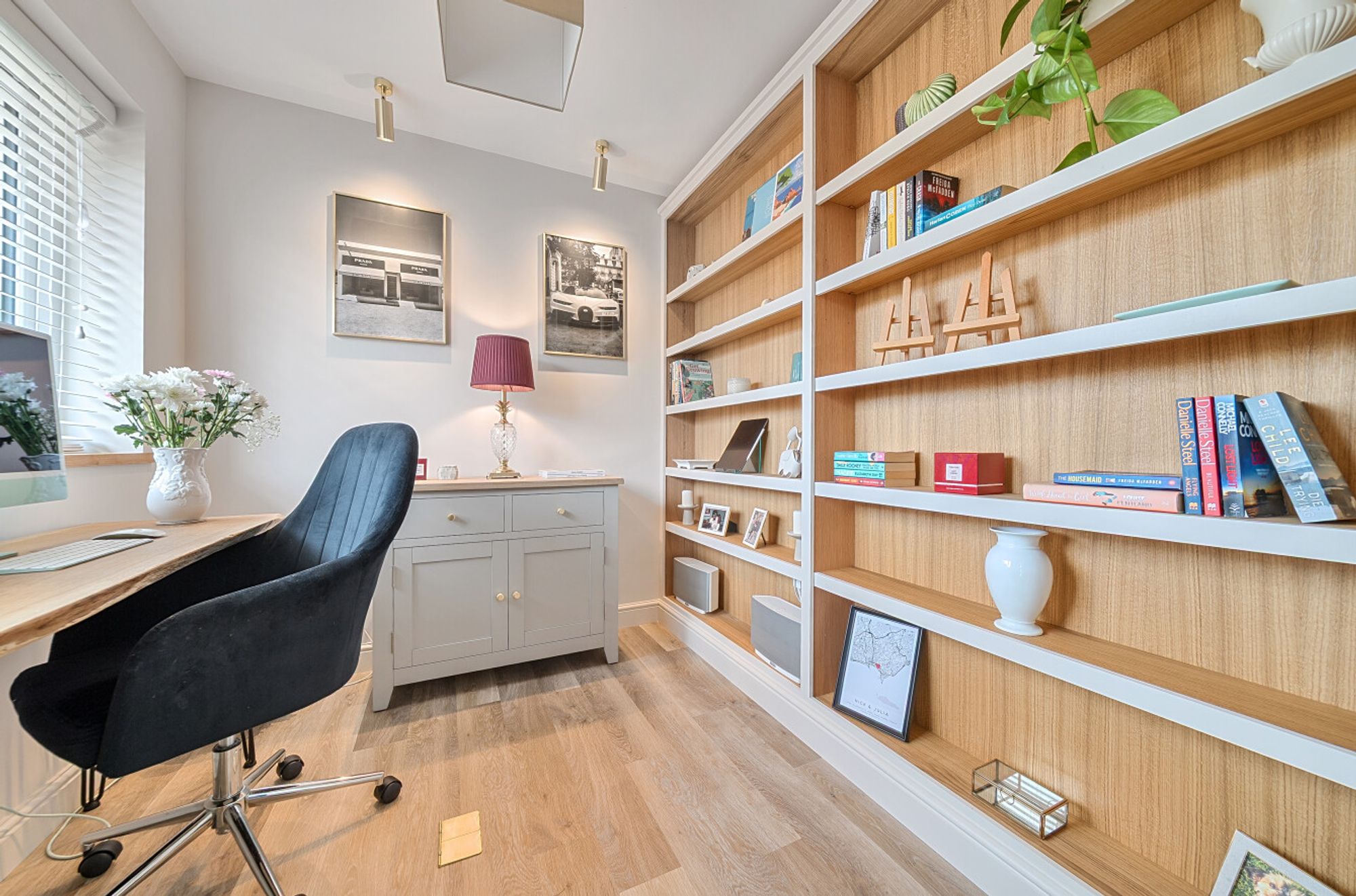 The ground floor also includes a study/snug complete with bespoke built-in bookcase and a dining room/additional bedroom with an adjacent, elegantly styled bathroom.