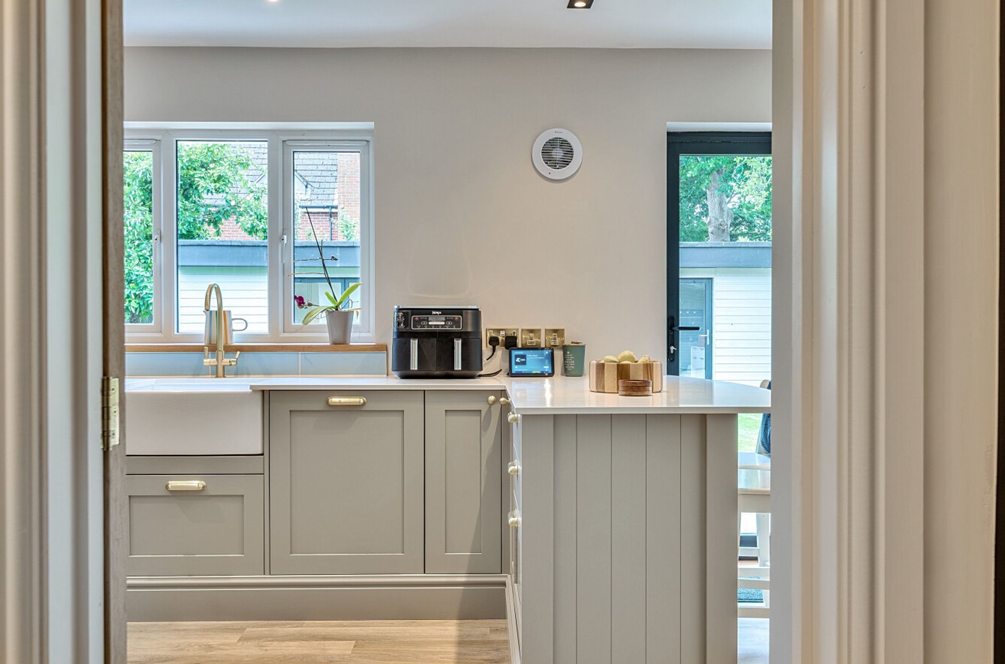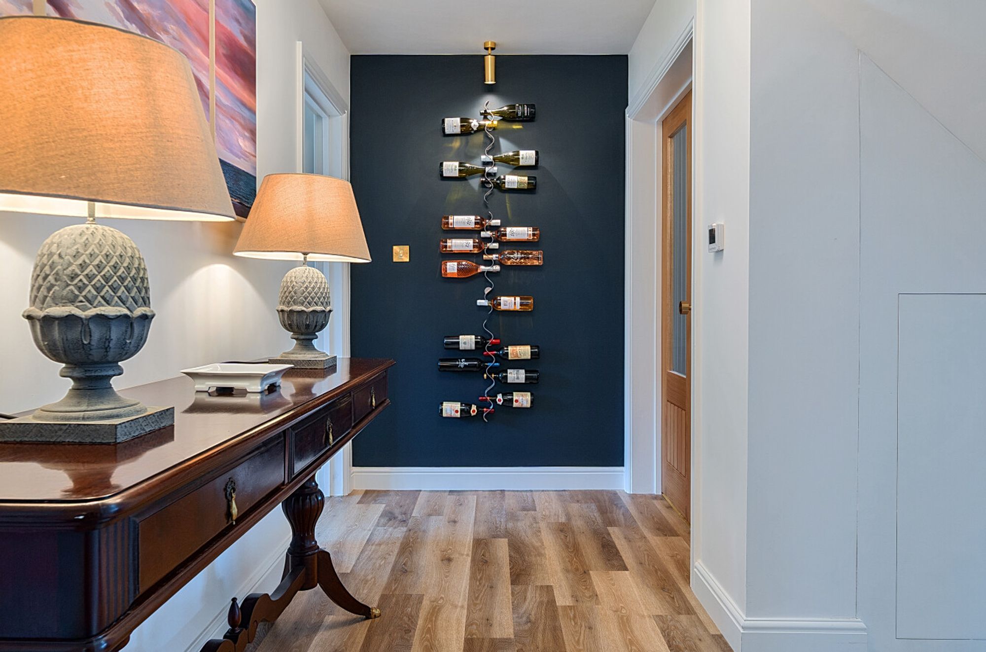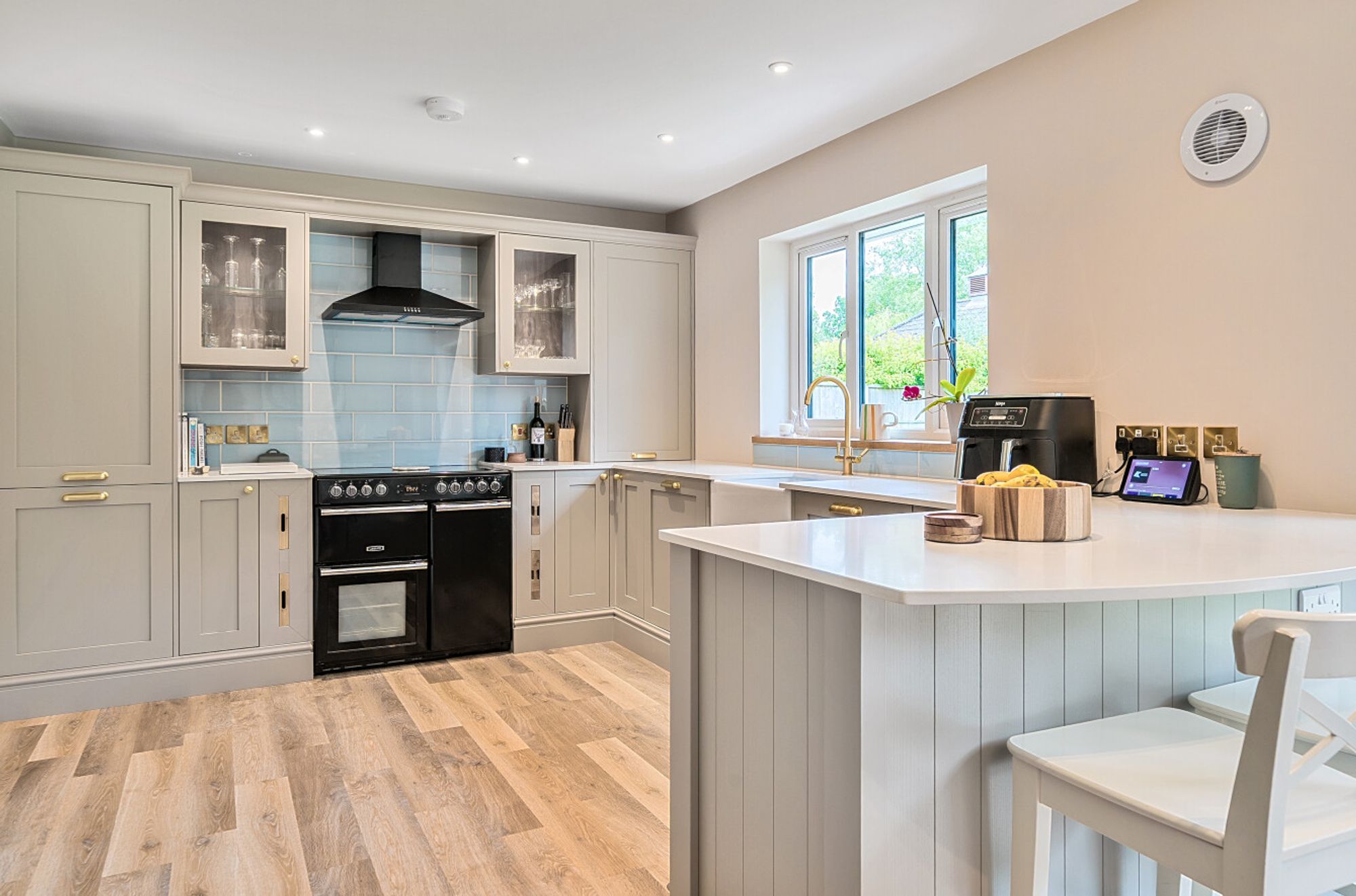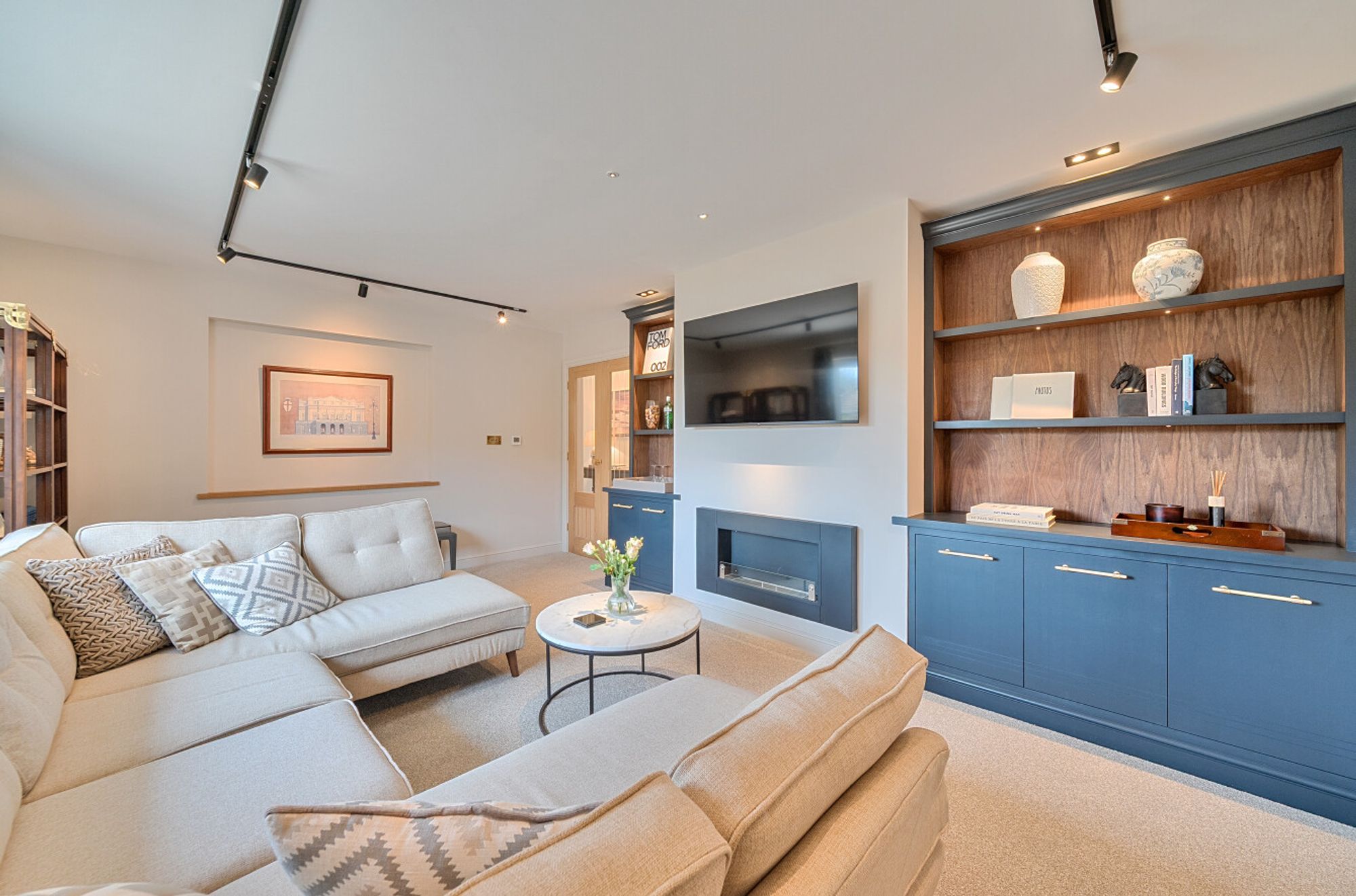 Very little of the original structure remains, replaced by beautifully appointed interiors and high-end finishes throughout. At the heart of the property is a welcoming entrance hall with a cloakroom/boot room recess. Double doors lead to a generous sitting room featuring a bespoke media wall, flanked by custom-built dresser-style cabinetry.