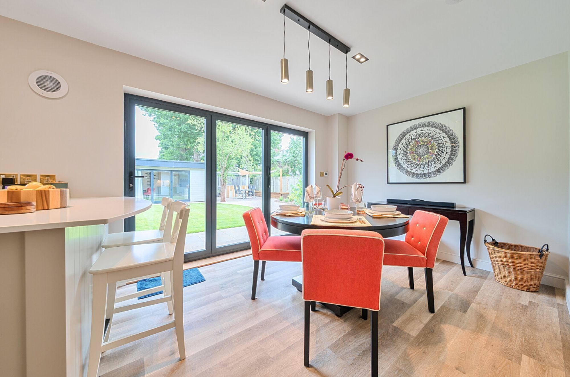 The kitchen/family room is the true hub of the home. It features extensive shaker-style cabinetry, quartz worktops and a large breakfast bar. Integrated appliances include a range-style electric cooker with extractor hood, dishwasher, fridge and freezer. The dining area is enhanced by bi-fold doors that open out to the landscaped rear garden, seamlessly blending indoor and outdoor living.