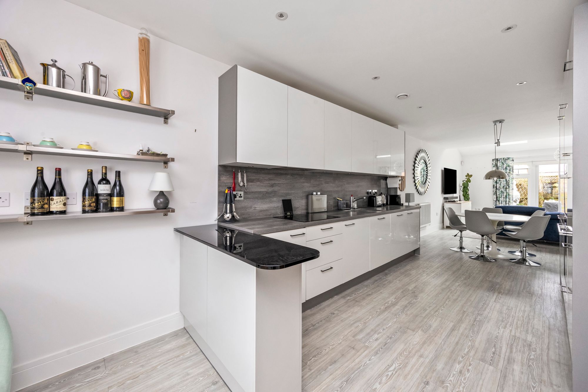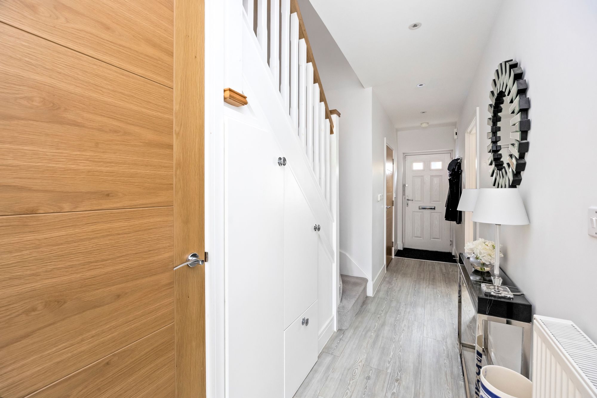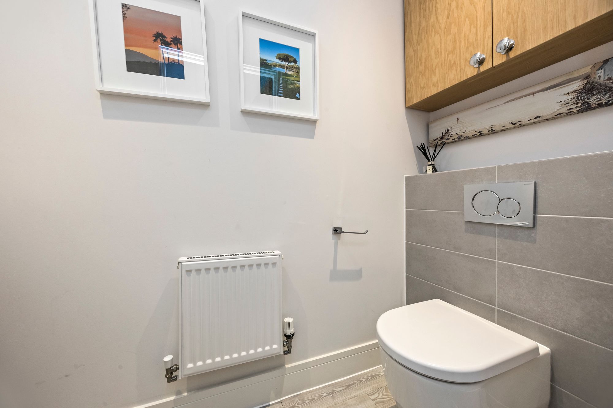 To the ground floor, the reception hallway welcomes you and leads through to the main sitting room which enjoys an aspect over the rear gardens and is flooded with light due to the skylight windows. There is a convenient understairs storage cupboard and ample space for both the sitting room furniture and dining room table. The kitchen/diner has a range of wall and base units with contrasting worksurfaces running through and a selection of integrated quality appliances. The kitchen has ample space for a breakfast/bistro table plus an aspect out to the front to the property. Also of note to the ground floor is a downstairs cloakroom with Laufen bathroom-ware and chrome Vado taps