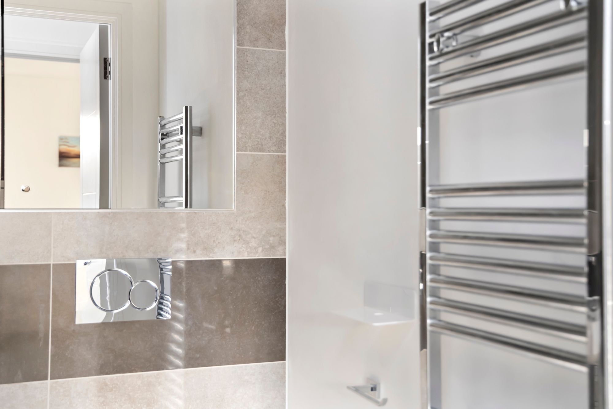 The property is accessed via a reception hallway which contains two sizeable storage cupboards incorporating utilities and communications hub and also including space and plumbing for a washing machine / dryer. The open plan kitchen / living space offers a light and airy feel, and the lounge area includes a lovely Juliette balcony overlooking the gardens. The modern kitchen has a range of wall and base cabinets with contrasting tones and a selection of well specified integrated appliances including dishwasher. There is a well-proportioned double bedroom which has a large integrated fitted wardrobe space. The bathroom suite includes a wall mounted shower over the bath, a wash hand basin and a low-level WC, with cleverly integrated vanity cabinets including mirrored backlit doors.