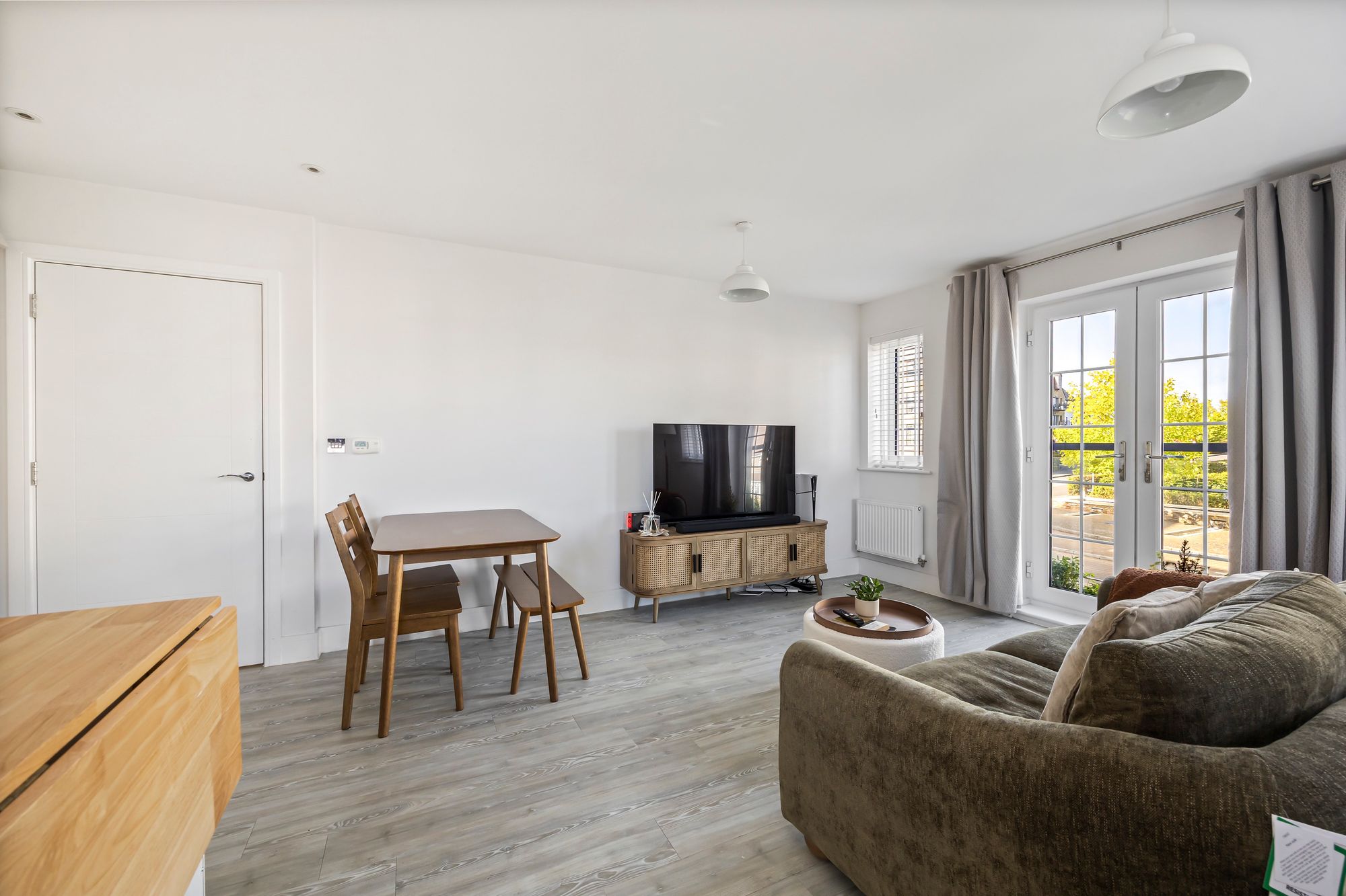 The property offers modern open plan living area with Juliette balcony flooding the area with light, leading to the kitchen with integrated appliances and space for a dining table, there is a useful double storage cupboard in the hall with space for a washing machine. Both bedrooms are doubles with built in wardrobes to the main bedroom and en-suite shower room.
