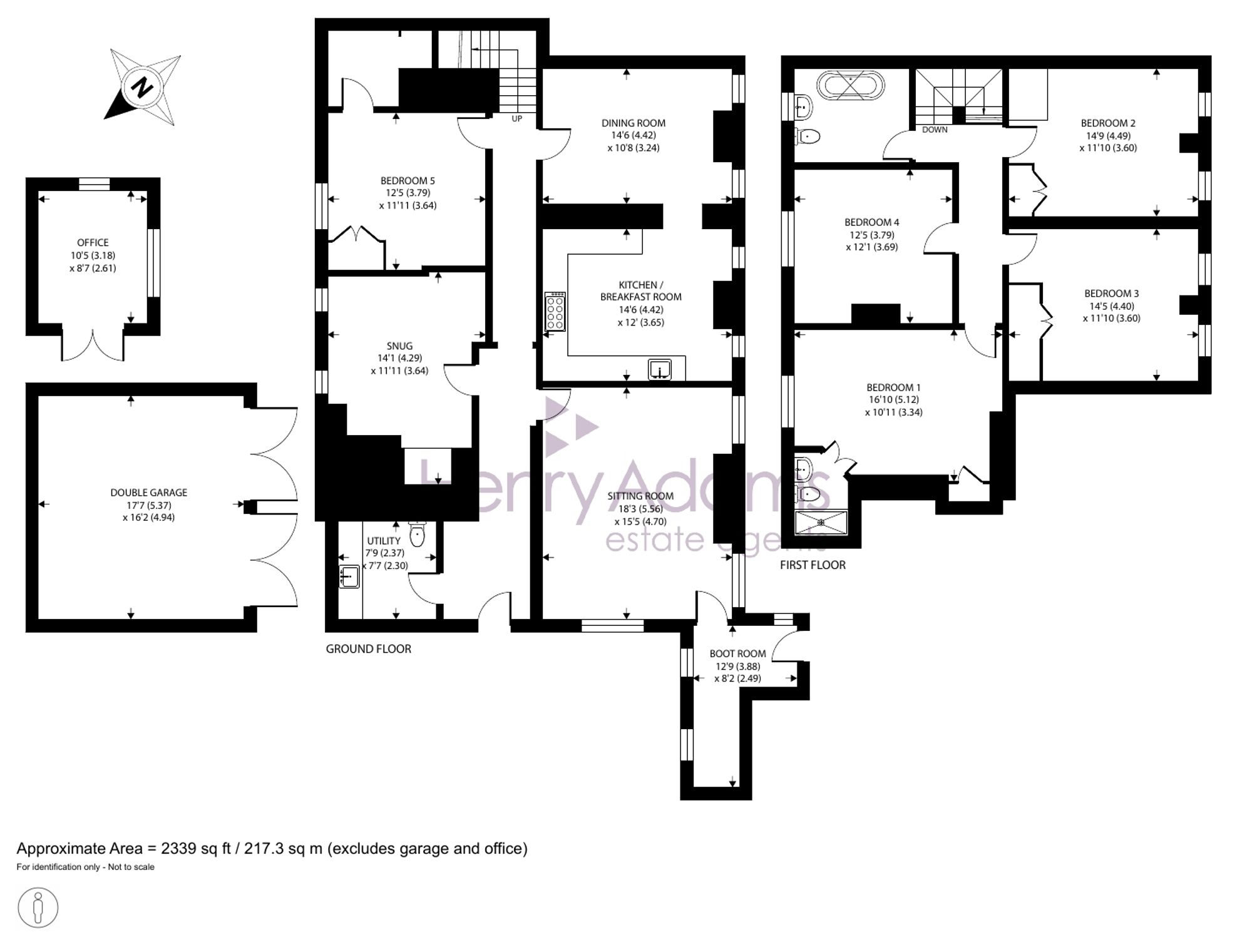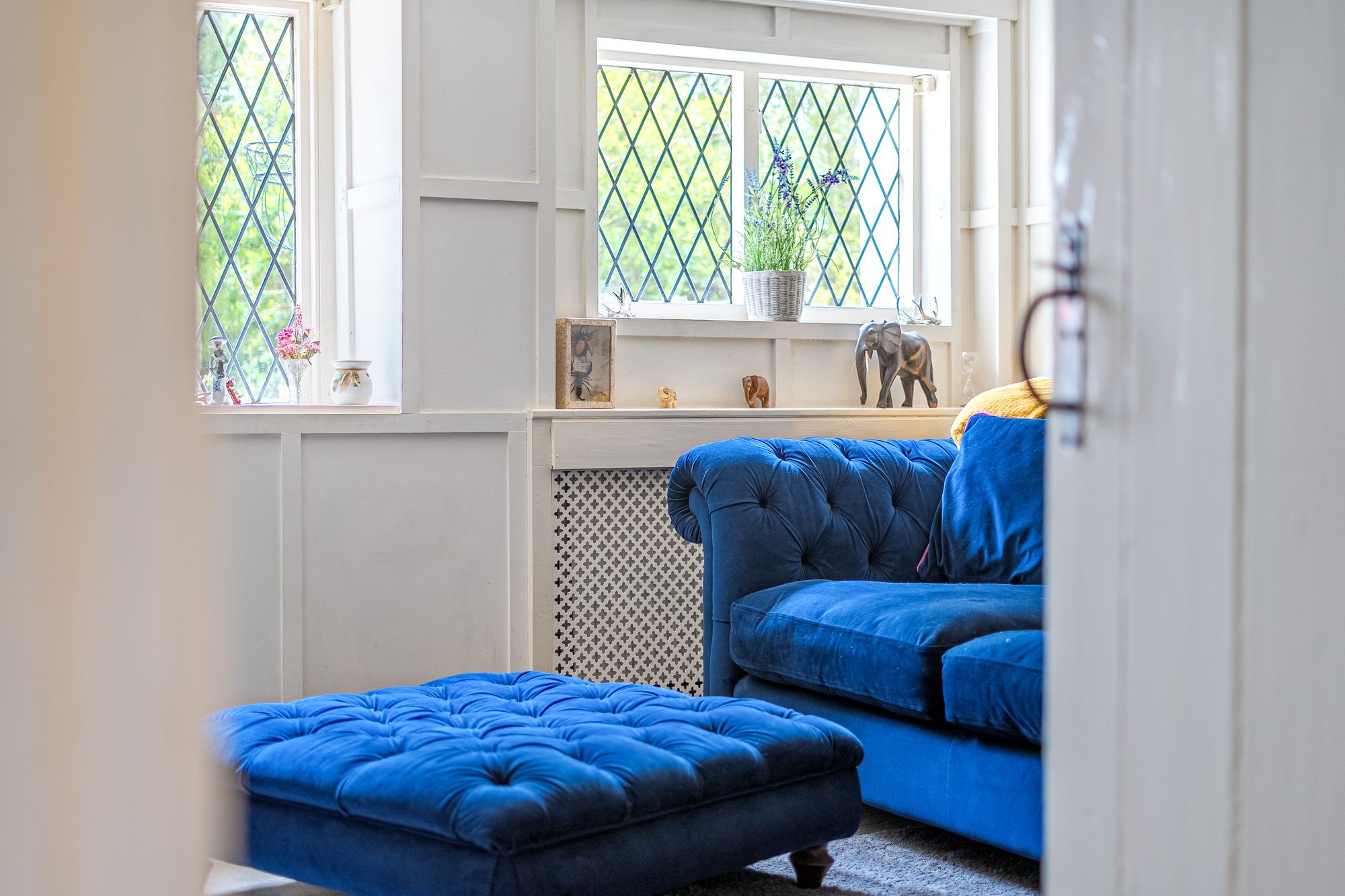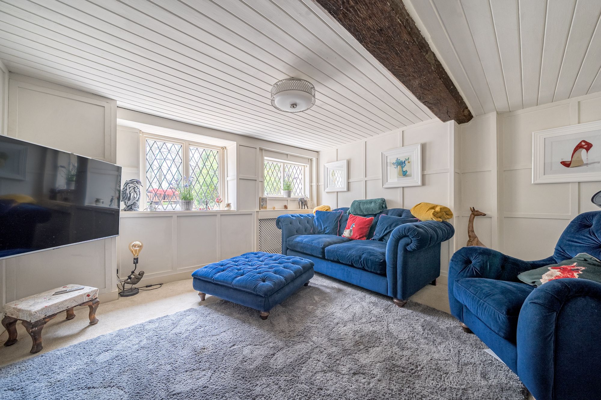 On the first floor are four well-proportioned bedrooms, some benefiting from fitted wardrobes. The principal bedroom is complemented by a stylish en-suite shower room, while the remaining bedrooms are served by a family bathroom featuring a distinctive Sussex-style oval stained-glass window.