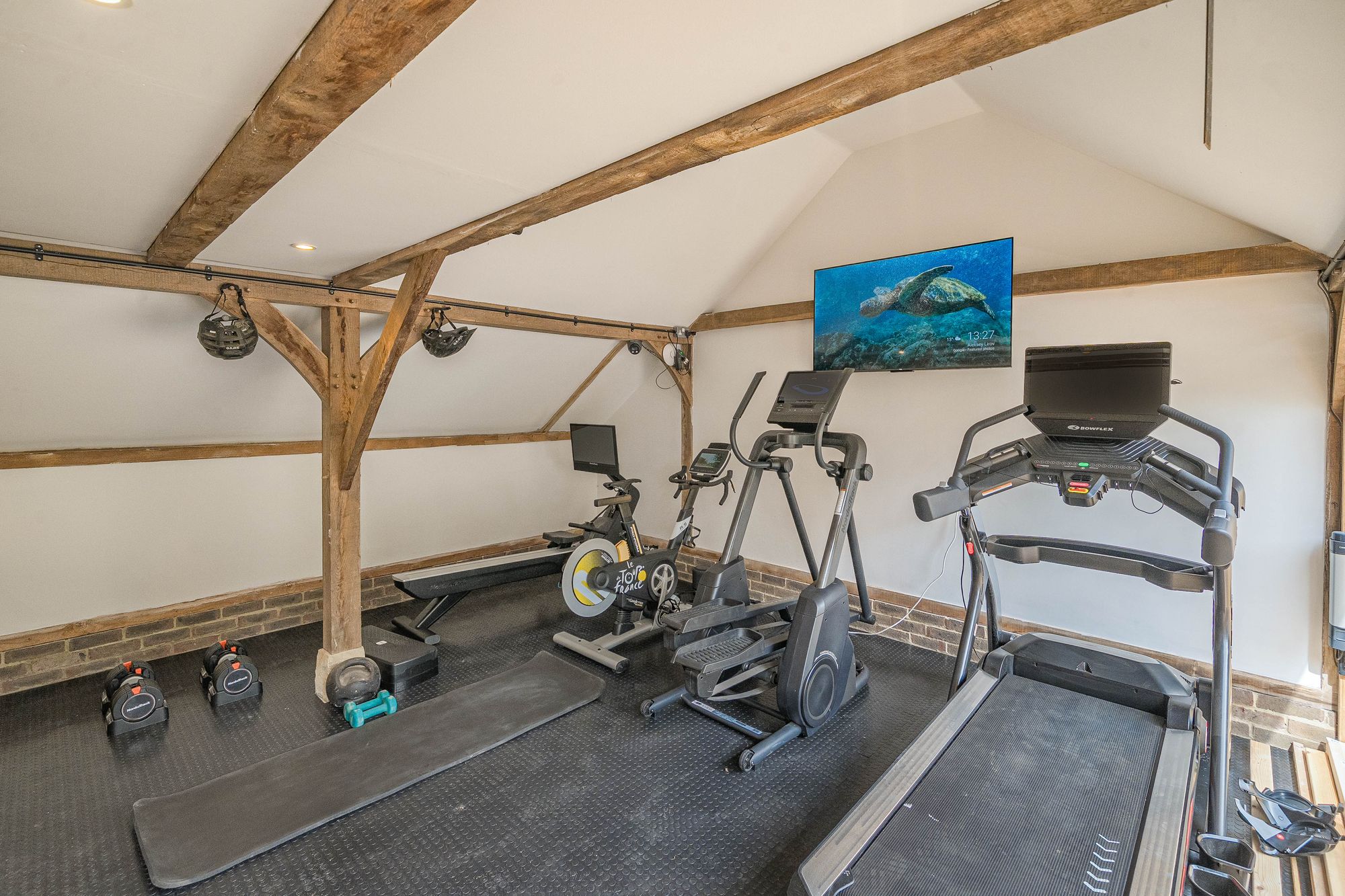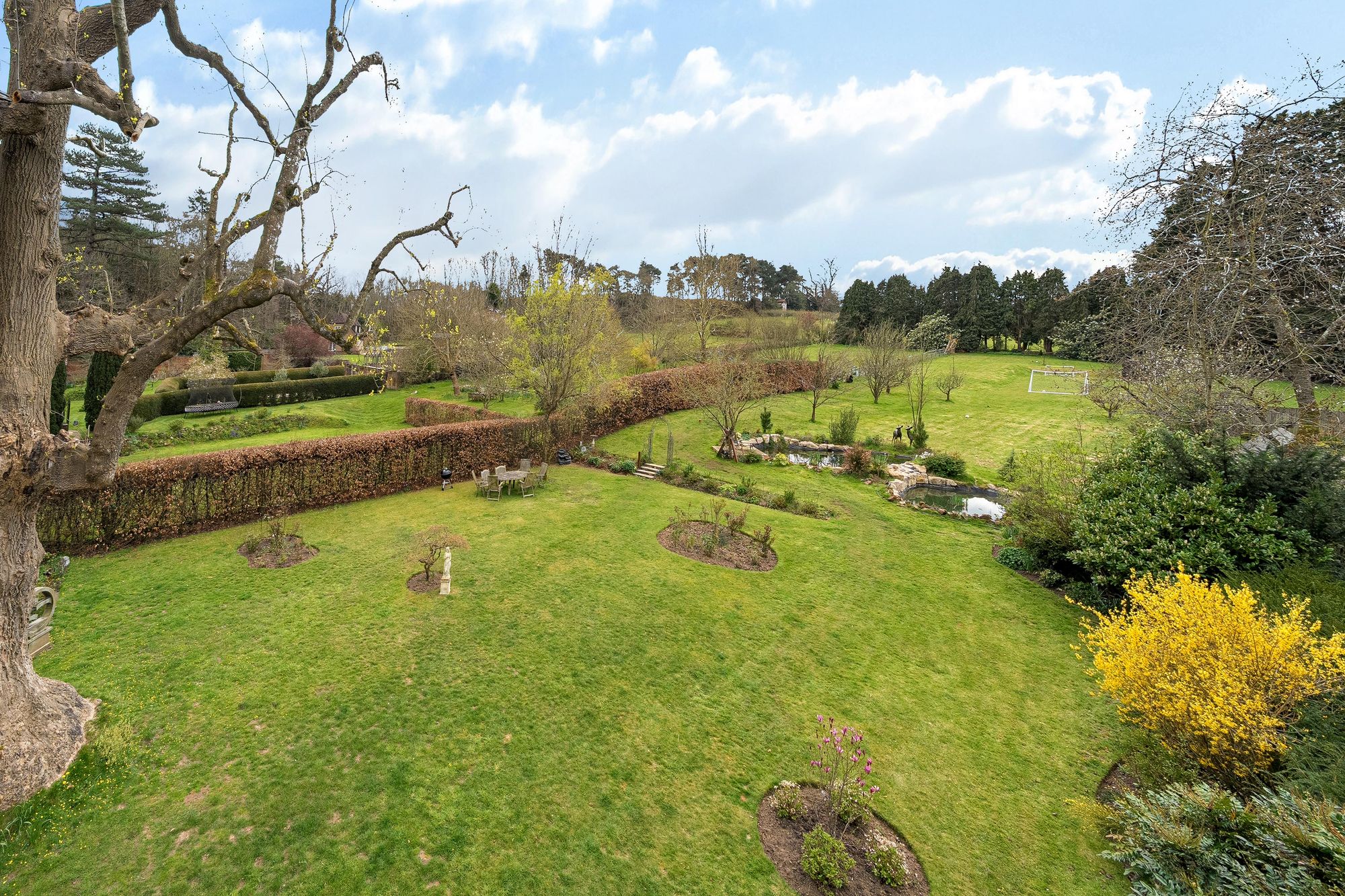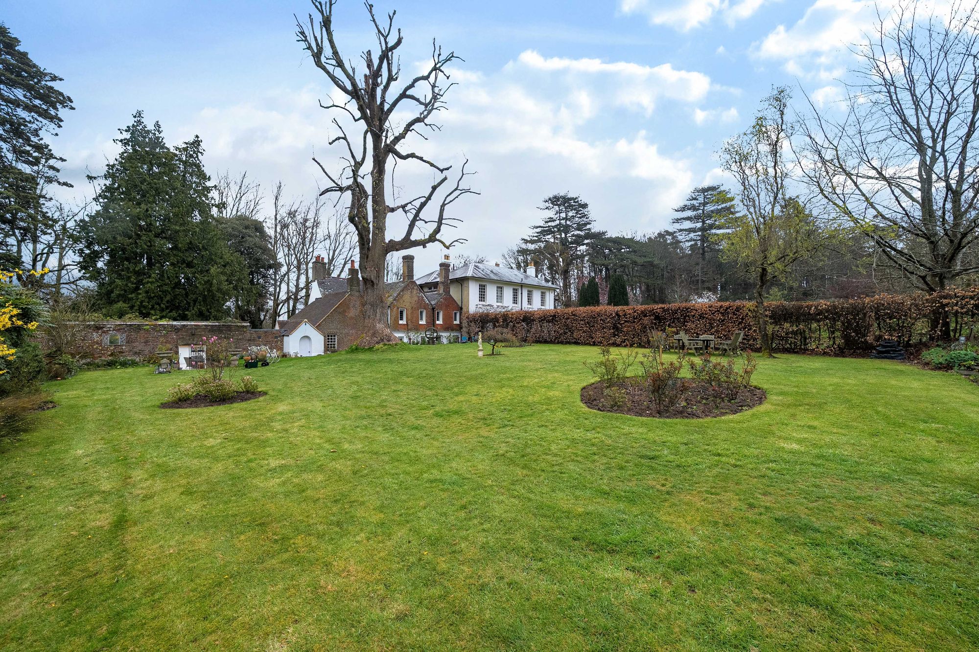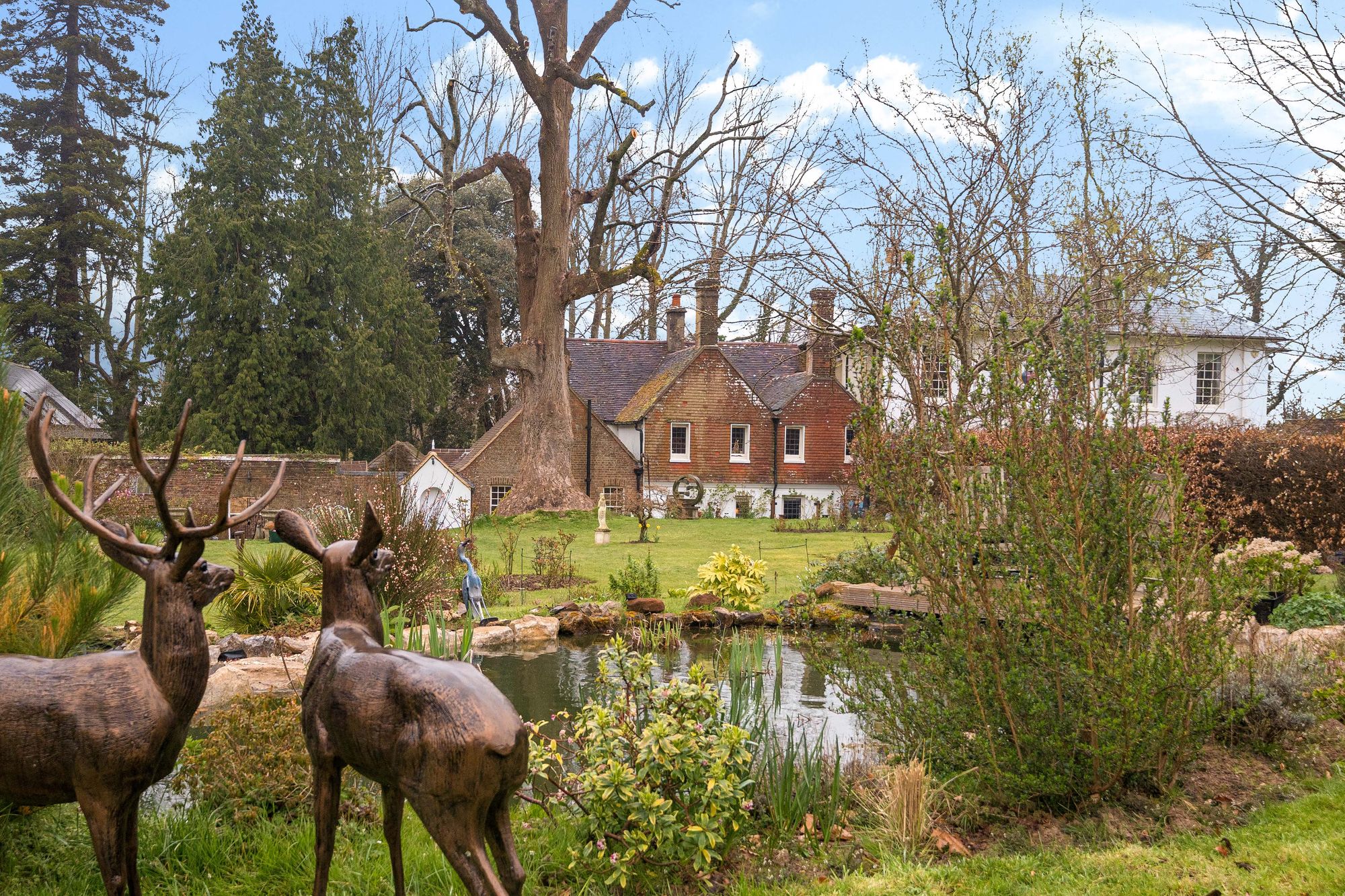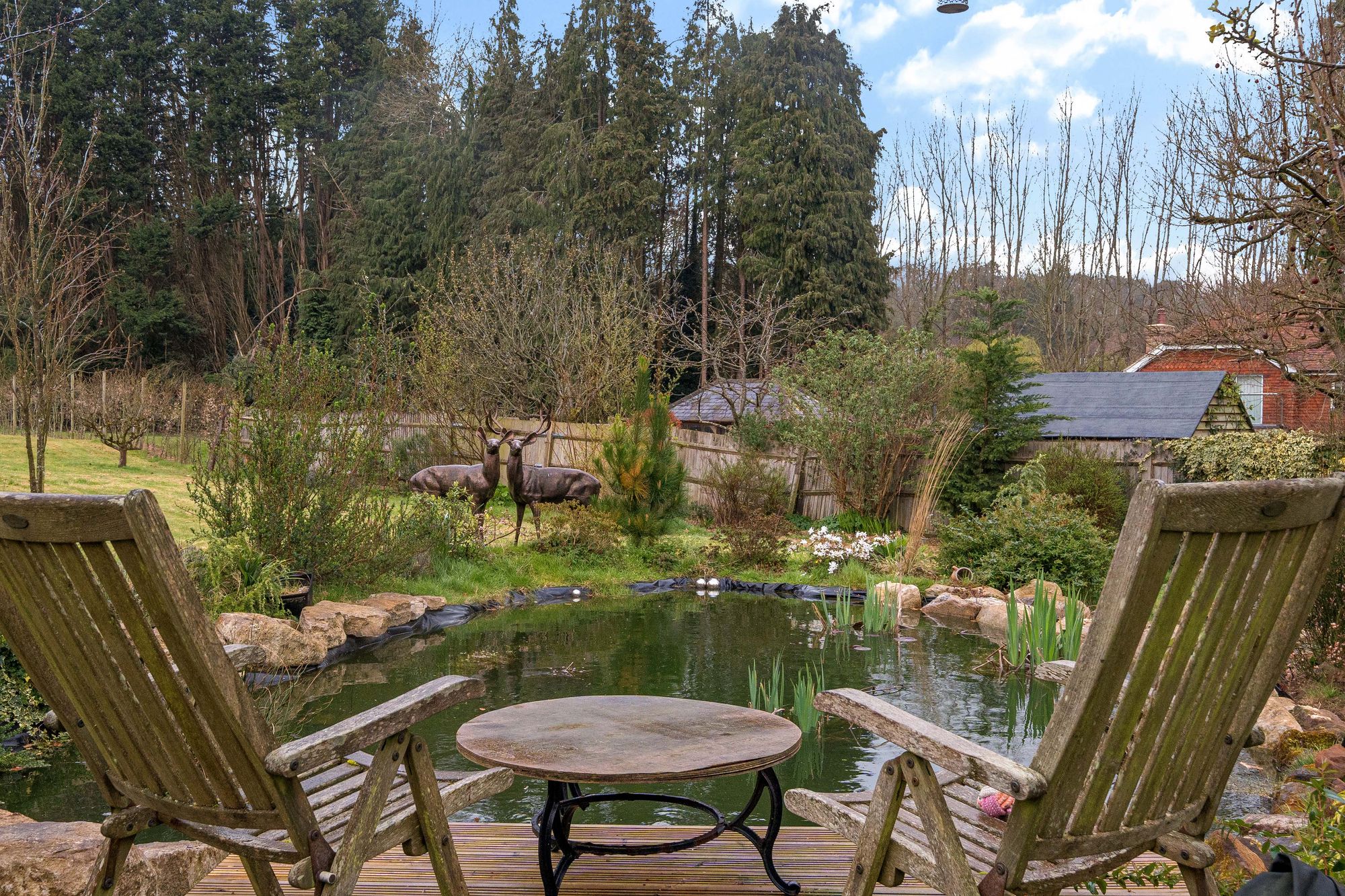 The property is approached via a shared gravel driveway providing ample parking for several vehicles. To the front of the house, the charming walled courtyard garden offers a sheltered suntrap and BBQ area, ideal for al fresco dining and outdoor entertaining. There is a detached double-bay oak-framed garage with power and lighting, alongside a beautiful detached vaulted brick-built outbuilding—perfect for use as a dedicated home office or hobbies room. The gardens and grounds are a particular highlight—beautifully landscaped and mainly laid to lawn, interspersed with mature trees including a striking tulip tree. Additional features include ponds with a dedicated seating area and a productive vegetable garden. The grounds extend into further land acquired by the current owners, creating a wonderful sense of space, privacy, and connection to nature.