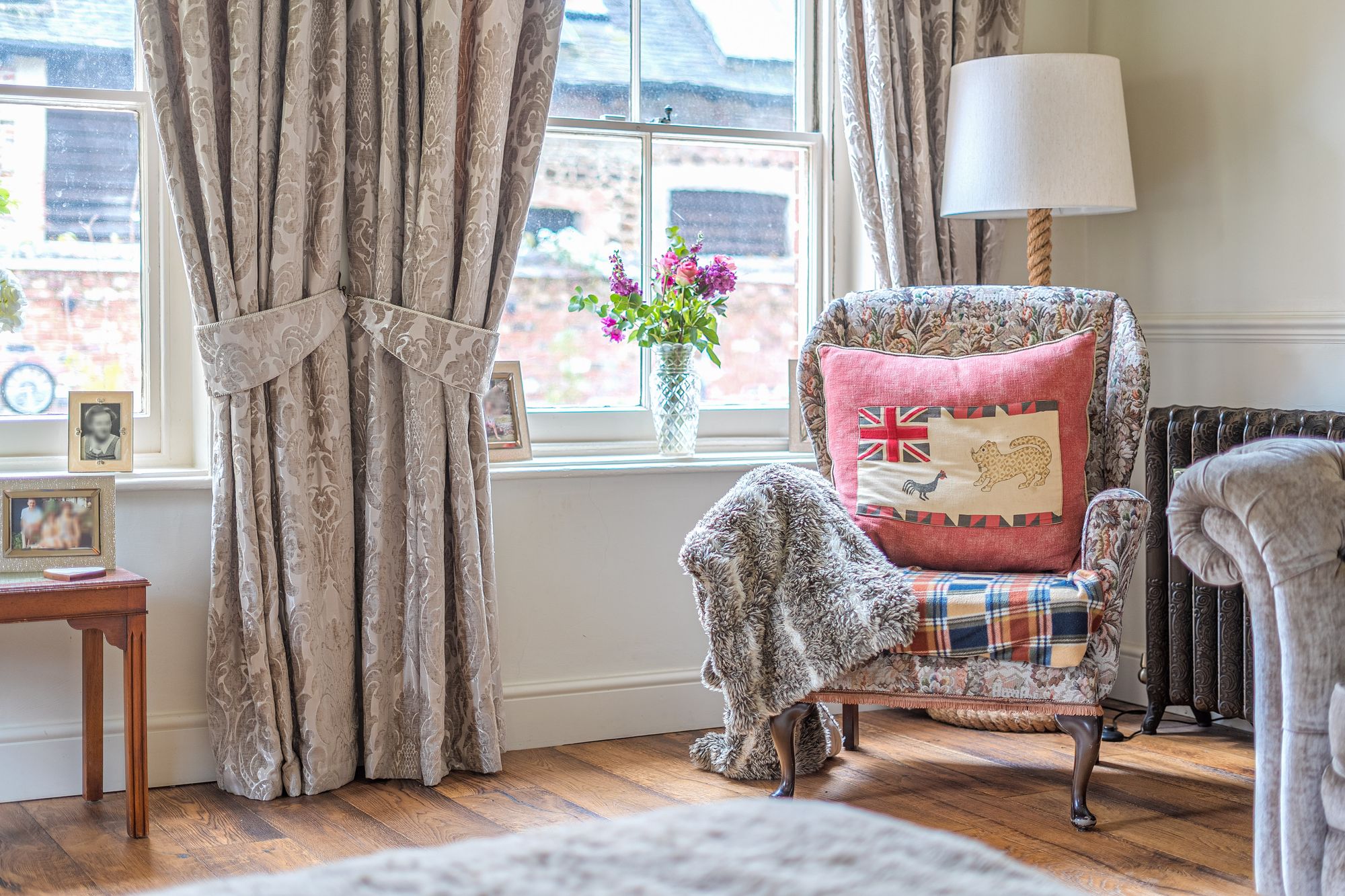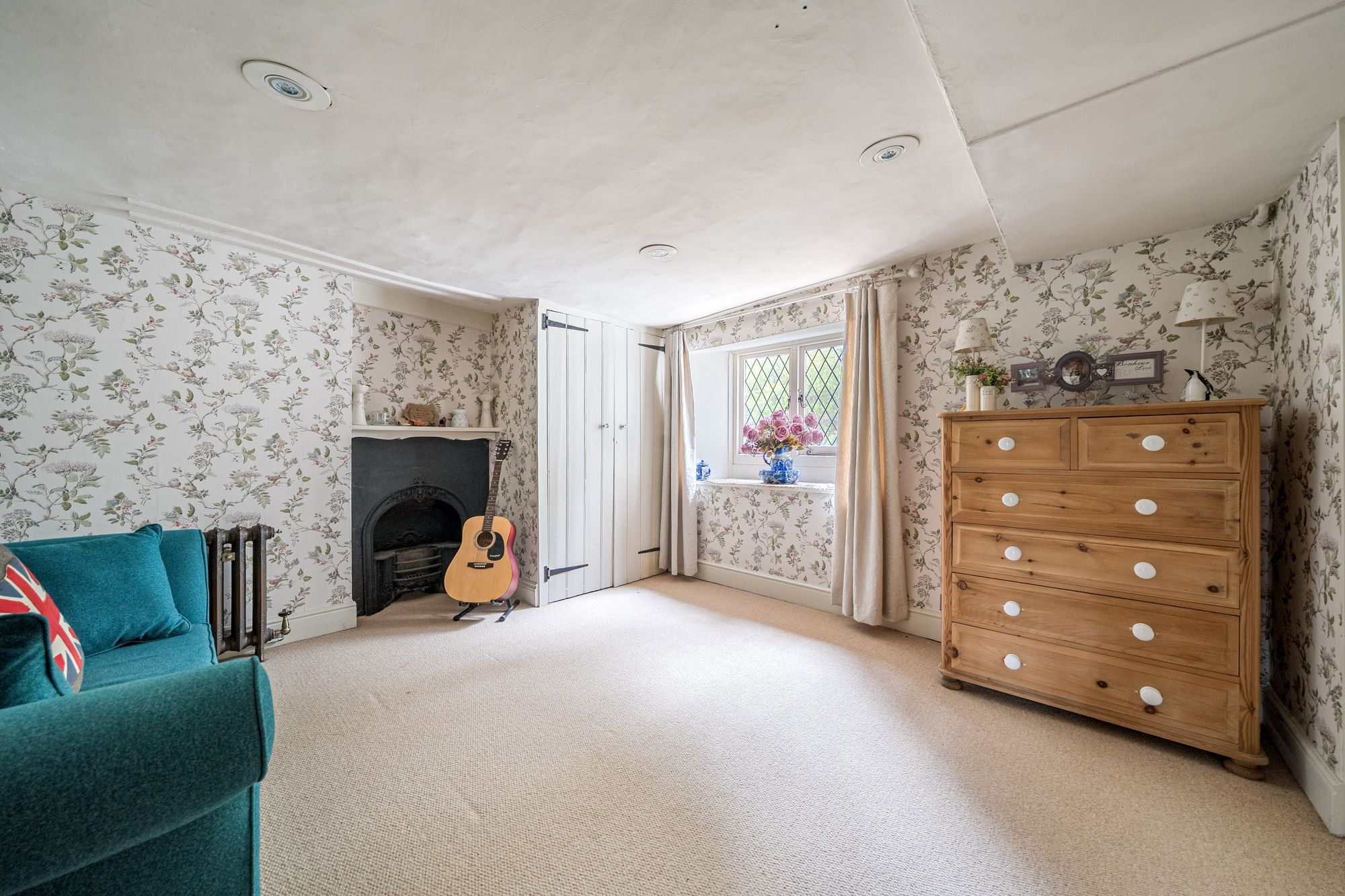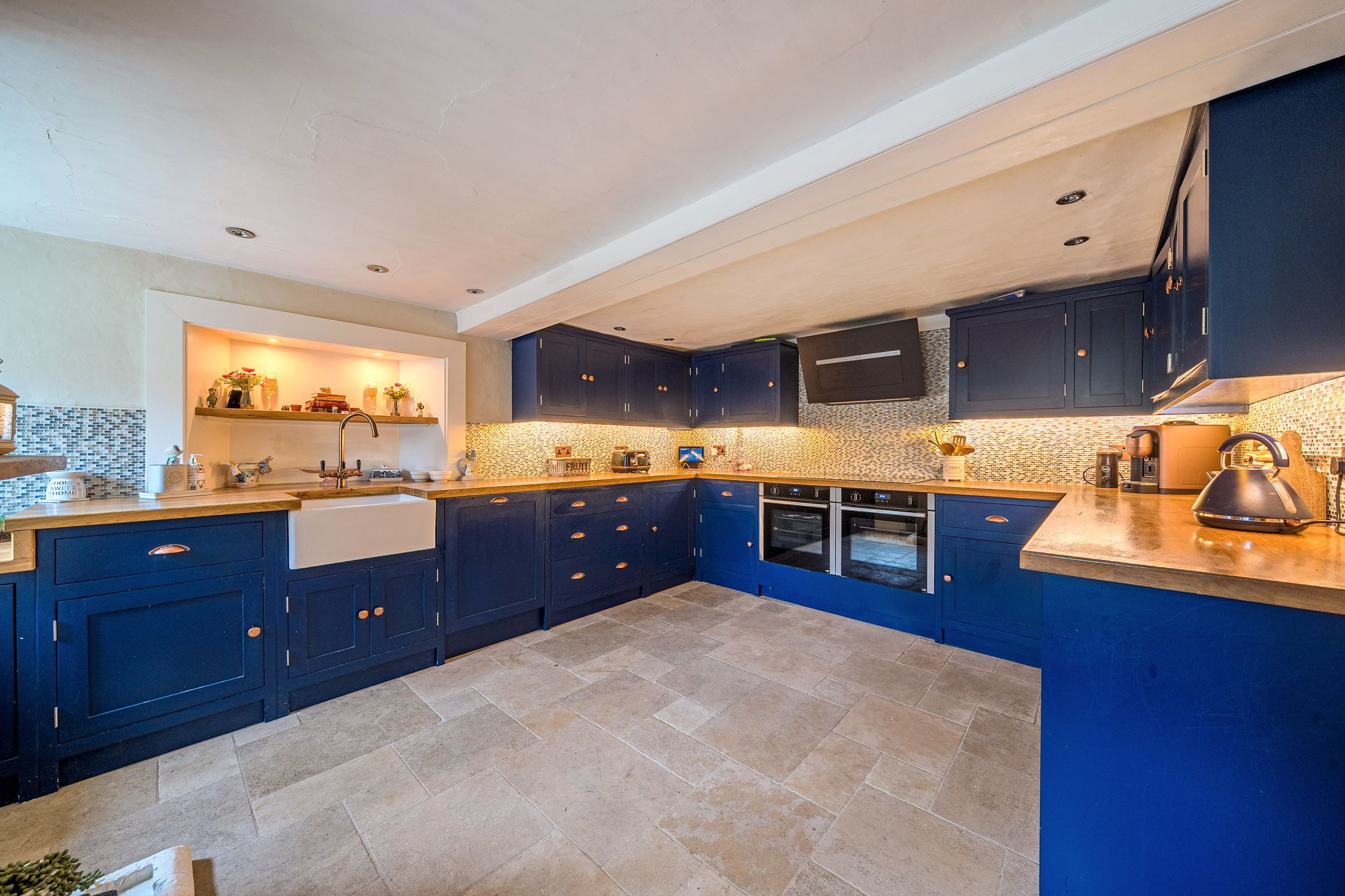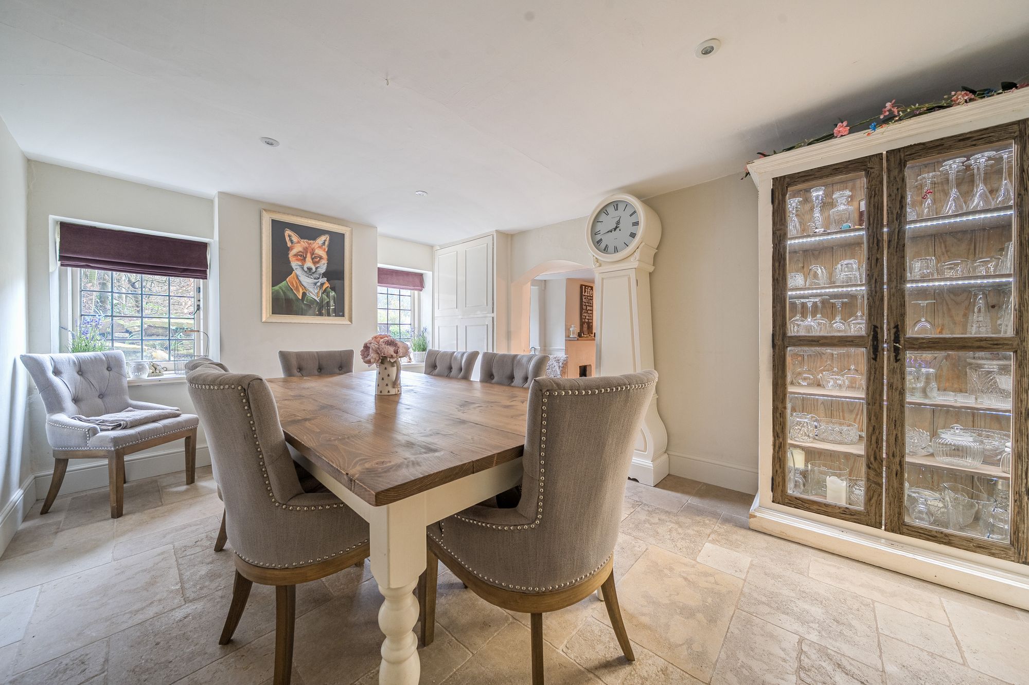 An attractive walled courtyard garden leads to the bright entrance hall, setting the tone for the warm and welcoming interior beyond. At the heart of the home lies a delightful country-style kitchen with fitted units, seamlessly flowing into a dining/breakfast room that enjoys lovely views across the gardens—perfect for everyday family life and entertaining alike. The impressive vaulted principal living room offers a superb entertaining space, enhanced by a log-burning stove and dual-aspect outlook that bathes the room in natural light. A cosy snug or second reception room, complete with an inglenook fireplace, provides a more intimate retreat. Further ground floor accommodation includes a separate utility room, cloakroom, and an additional reception room which could be utilised as a home office, music room, or fifth bedroom, offering excellent flexibility.