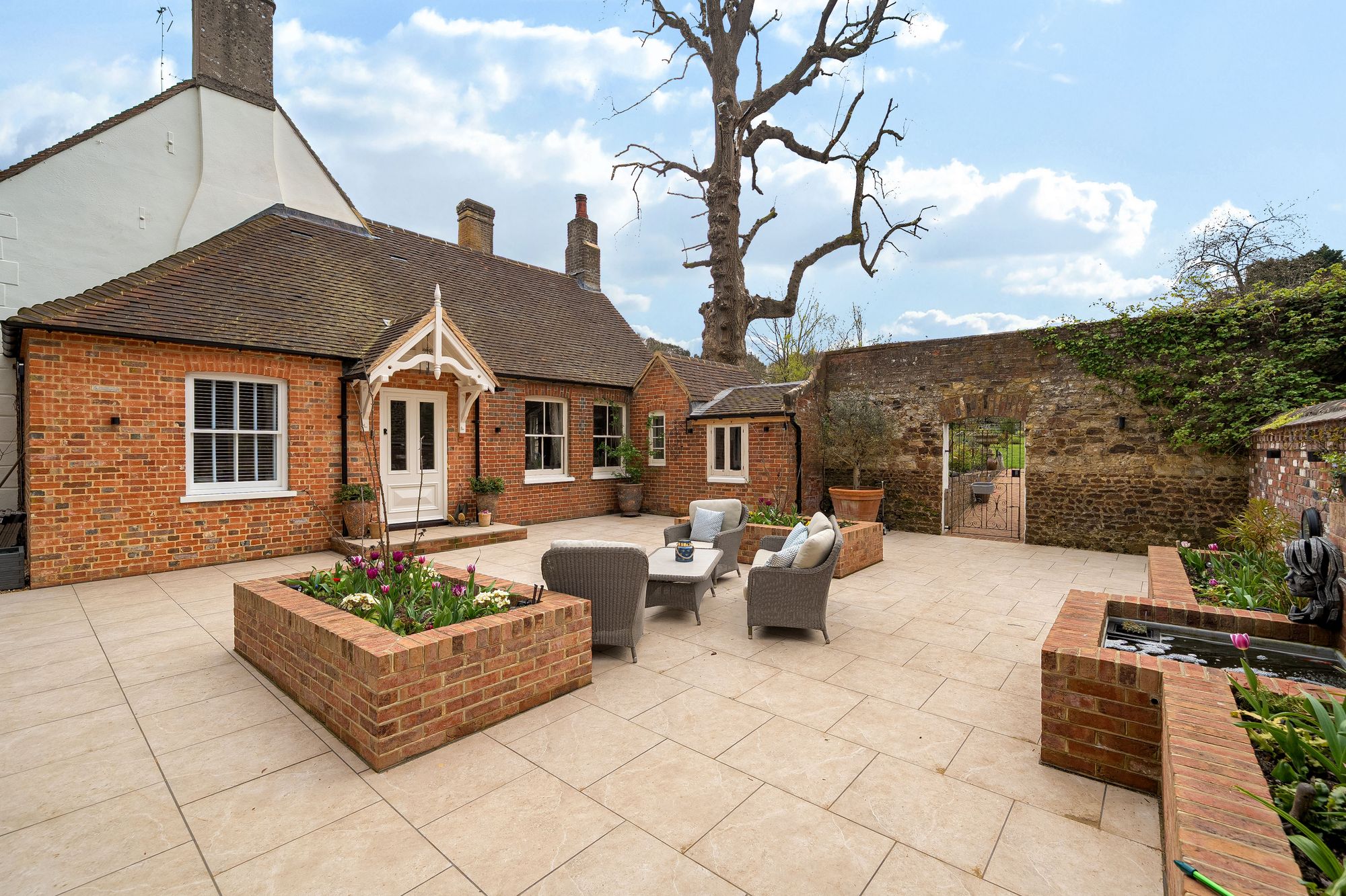 To the front of the house, the charming walled courtyard garden offers a sheltered suntrap and BBQ area, ideal for al fresco dining and outdoor entertaining.
